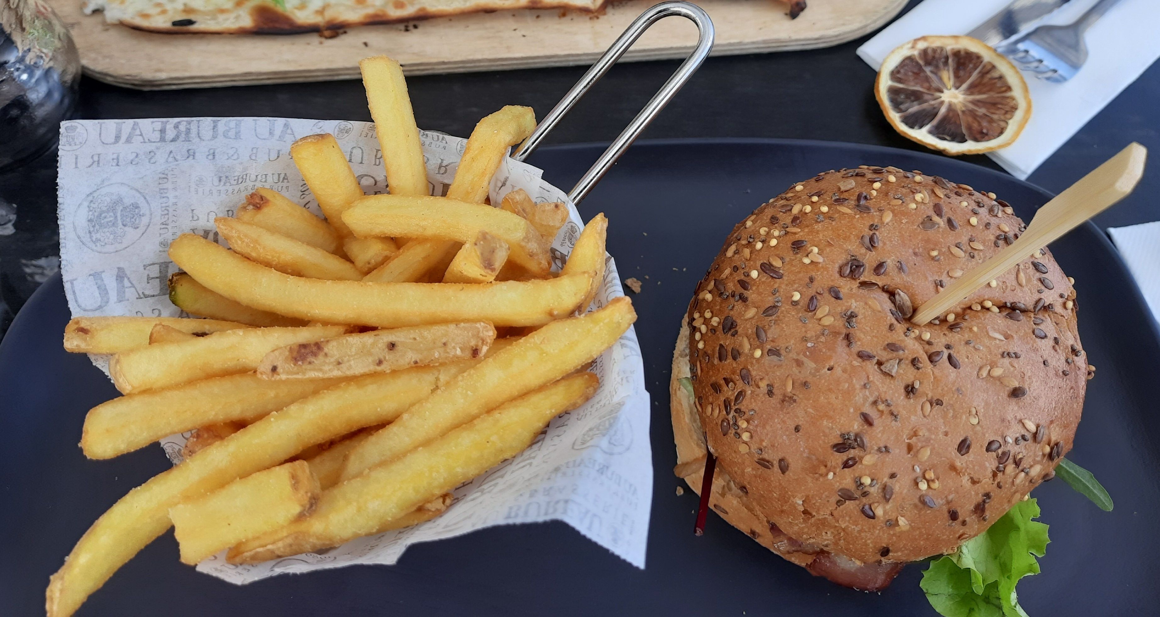 Les plats sont bon (burger + poutine) les serveurs sont agréables, le service est assez rapide, il y a un soin pour la décoration, assiette en ardoise, grille pour les frites ...