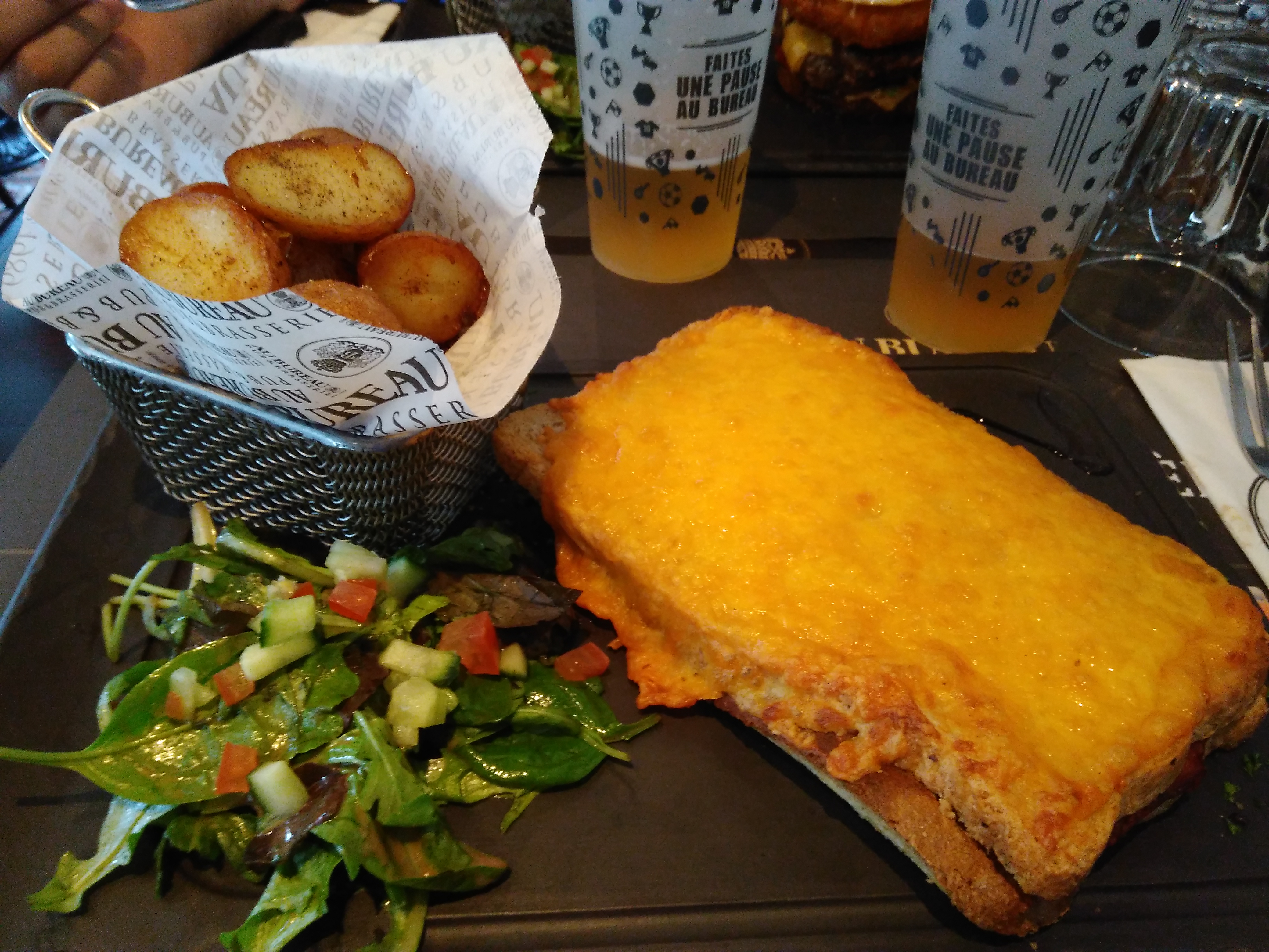 Pas convaincu par ce Au Bureau, je ne reviendrai pas. Service un peu trop familier, tutoiement constant. (remarque faite à l’arrivée de la glace, « ça doit être ça, au pire c’est de la glace »), les recettes d’Au Bureau que je connais ailleurs, mon semblé approximative. Quantité du plat léger. (camembert rôti) Nous étions 5, ce sera la dernière fois pour chacun d’entre nous.
