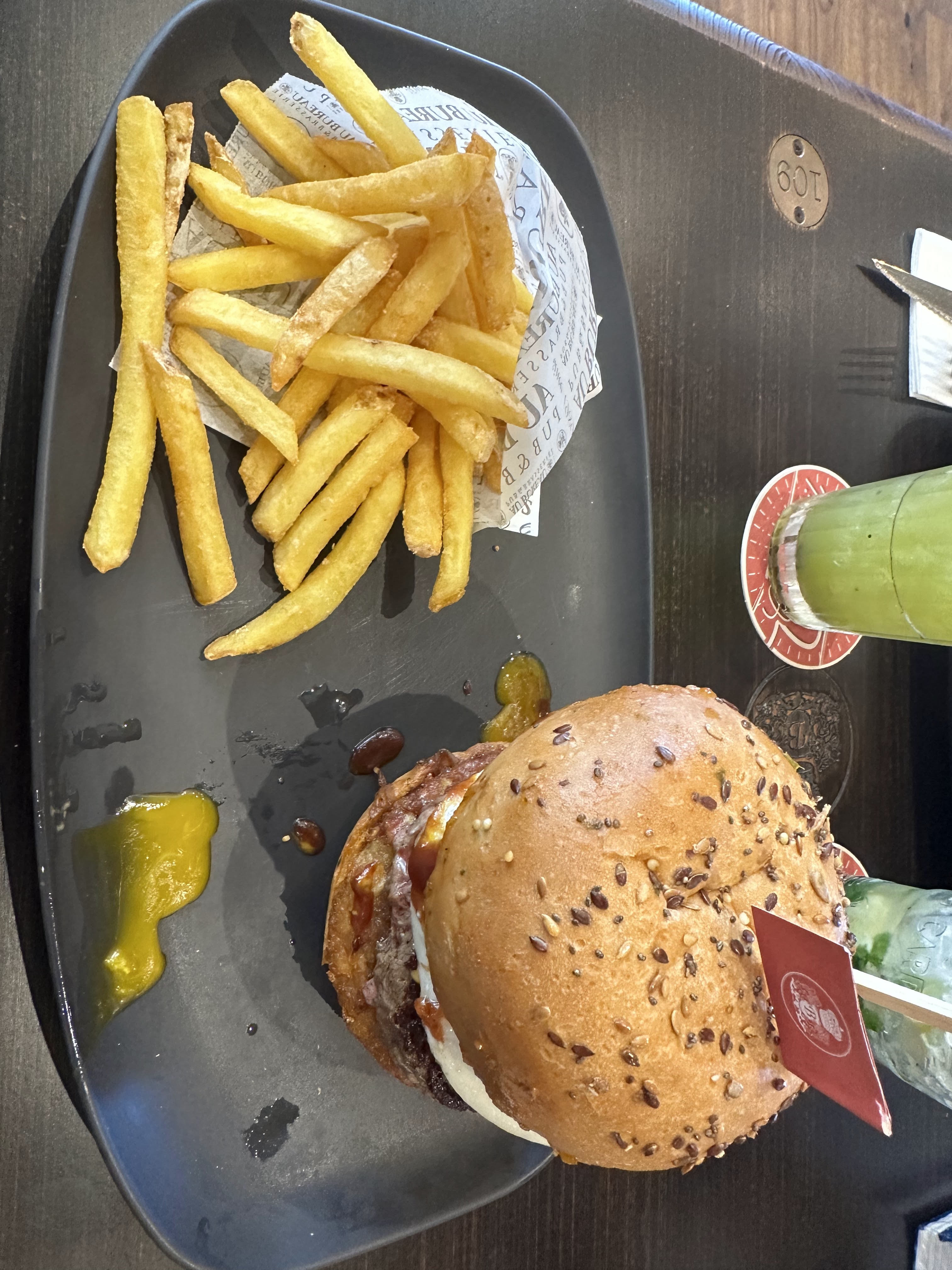 Lieu chaleureux et convivial avec une belle décoration intérieur. Nous avons pris le déjeuner (apéritif, plat et dessert) Arrivé au restaurant vers 13h pour un départ vers 13h40 donc un service très rapide. Les points positifs : - Beaucoup de places - Prise en charge (par le directeur en personne) très rapide - Service rapide avec plusieurs serveurs / serveuses Les points négatifs : - le prix un peu cher pour la qualité, Burger a 17,9€ des bons produits mais j’ai trouvé assez petit quand même, ma femme avait pris une salade assez déçue car beaucoup de sauces par contre le poulet était bon - Les déserts : trop sucrées, j’ai pris un hot cookie que j’ai eu du mal à digérer. - assez bruyant le midi à l’intérieur En bref, un service rapide pour des produits correct mais un prix un peu élevé dans l’ensemble. Prix total avec apéritif et désert pour 2 : 60€