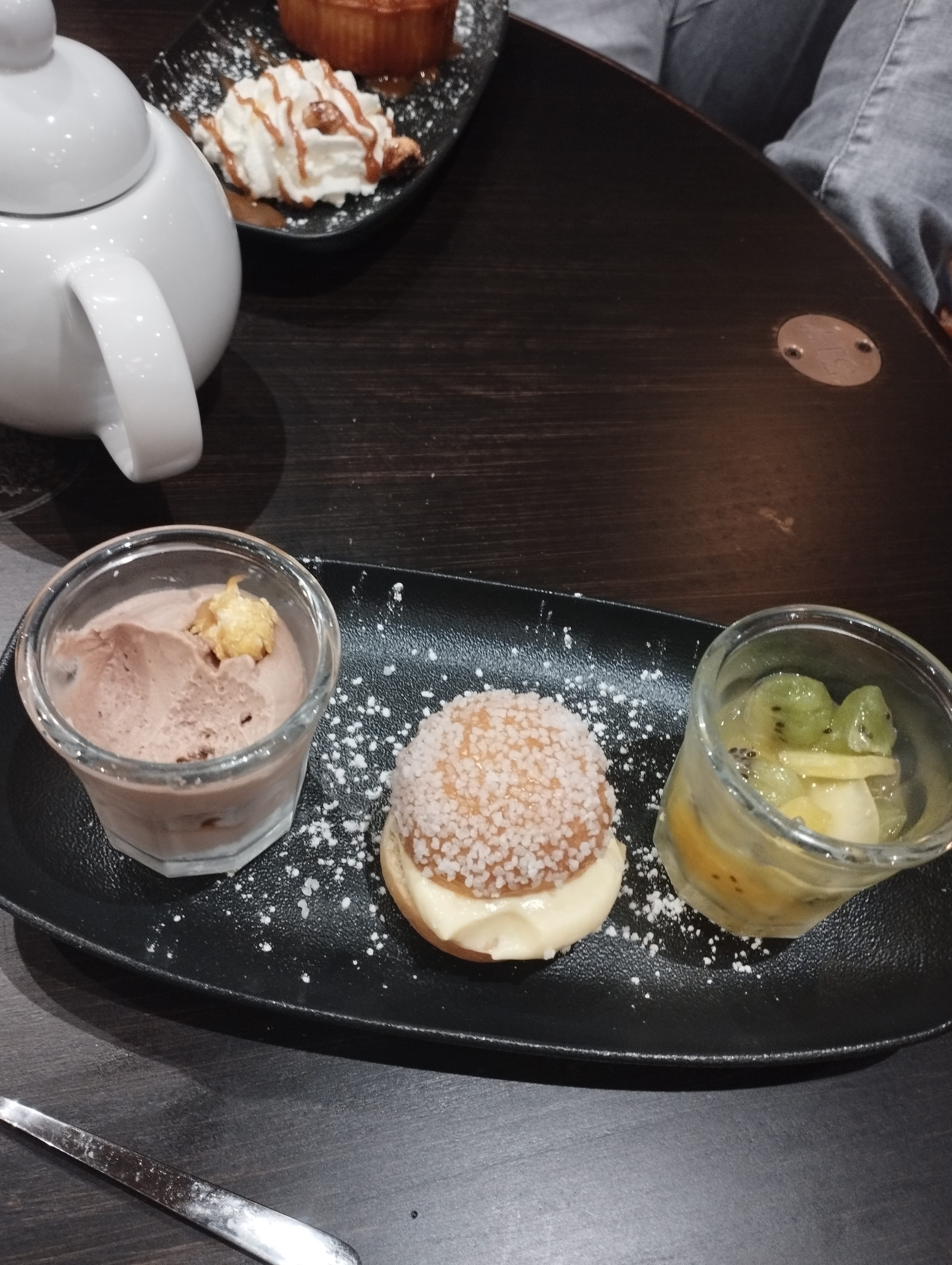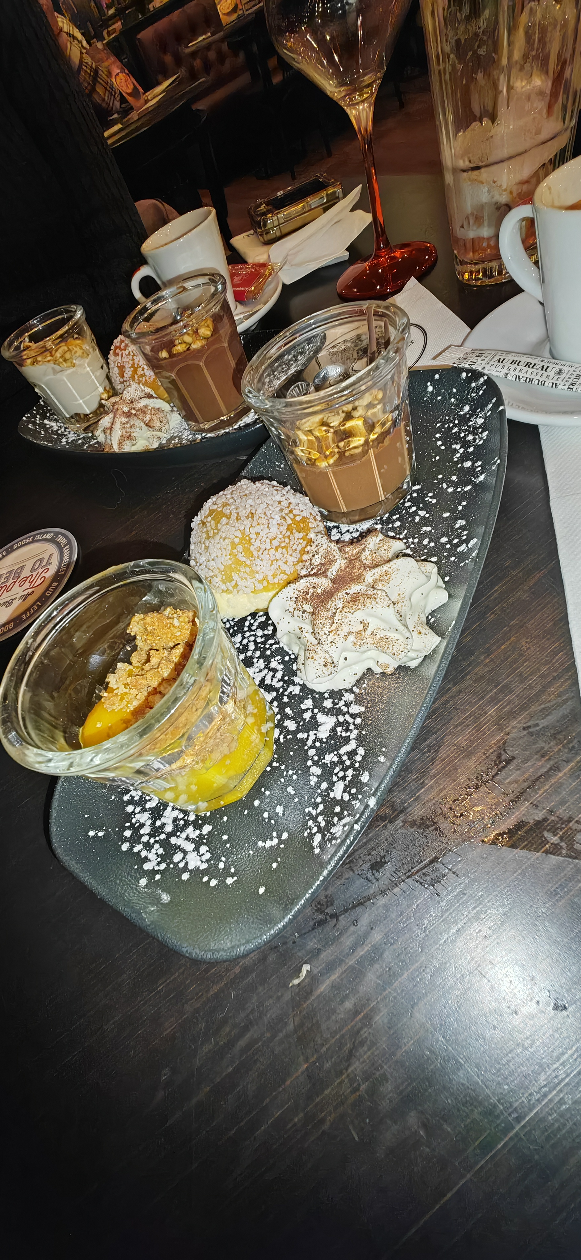 De bons desserts le plateau de fromages est très copieux à partager entre amis l'endroit est sympa pour passer un bon moment surtout quand il fait beau c'est très agréable les serveurs sont très sympa...