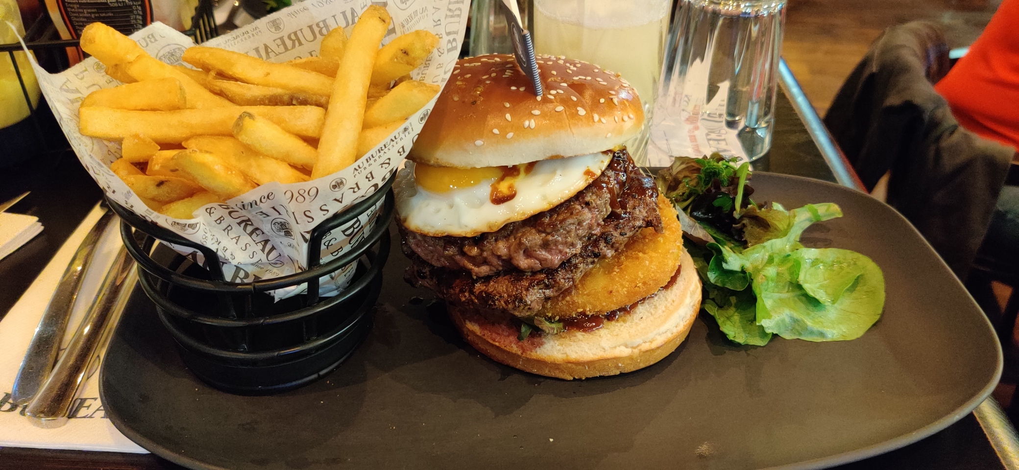 Ayant l’habitude d’aller au bureau j’avais même déjà laissé un avis très positif il y’a plusieurs mois. Deux fois que j’y retourne entre amis et deux fois déçu. Changement d’équipe, changement dans les cuisines également. Nous sommes venus hier, apéritif servis, planche à partager même pas terminé que nos plats étaient déjà servis. Une serveuse vraiment hautaine, je lui demande que la cuisson de ma viande soit bien cuite très cuite elle me dit ça sera à point en cuisine ils vont pas être content, on me l’avais jamais sortit ça … Je lui demande sans la poitrine fumé et sans oignon bien évidement ils n’ont pas été enlever, je peux comprendre que c’est peut être relou de devoir le stipuler en cuisine mais étant dans la vente aussi on est sensée satisfaire nos clients surtout que nous étions une table très sympathique. Je prend toujours le burger original et j’ai bien sentit que ce n’étais plus le même que d’habitude. Nous n’y reviendrons plus.