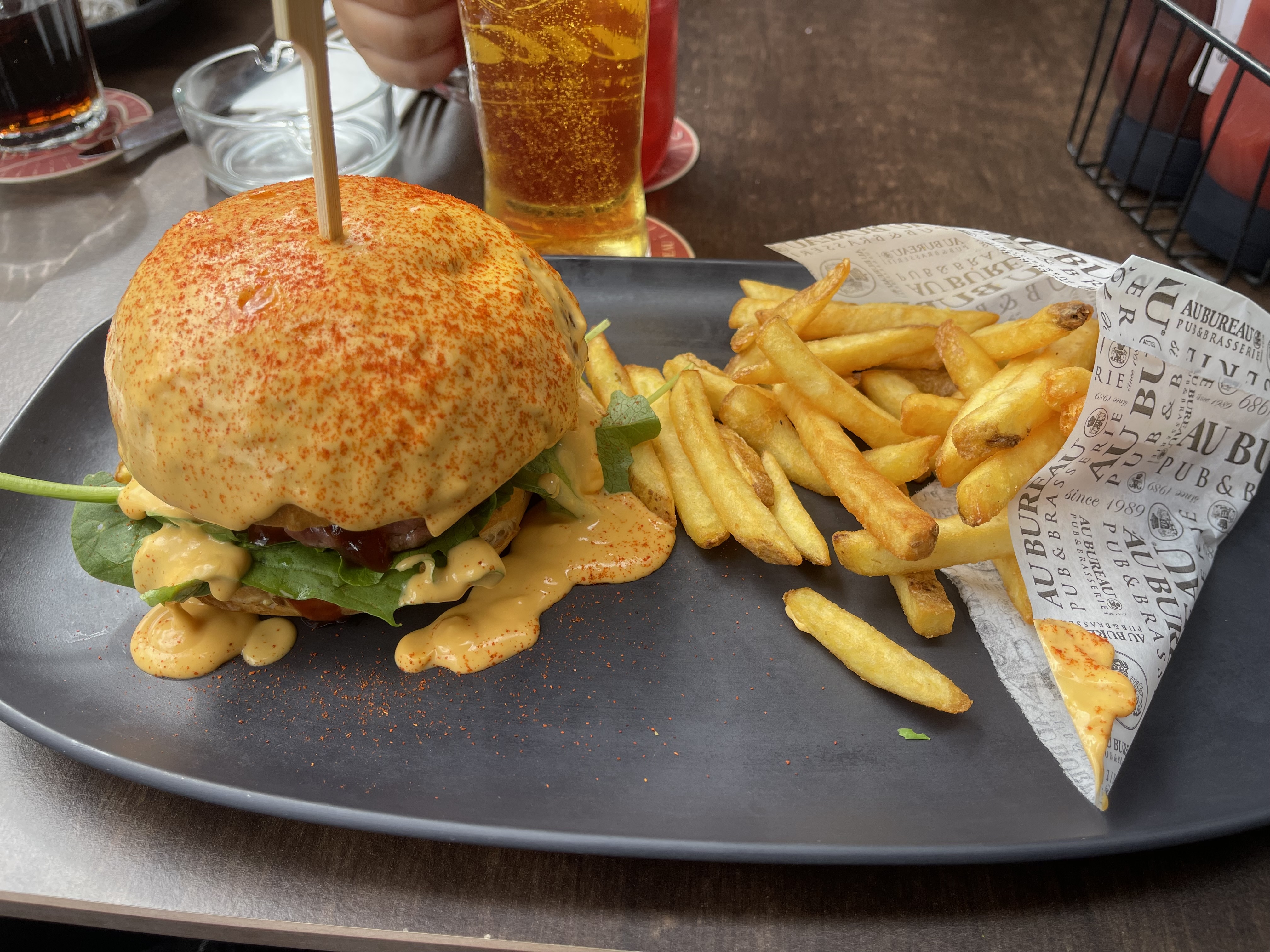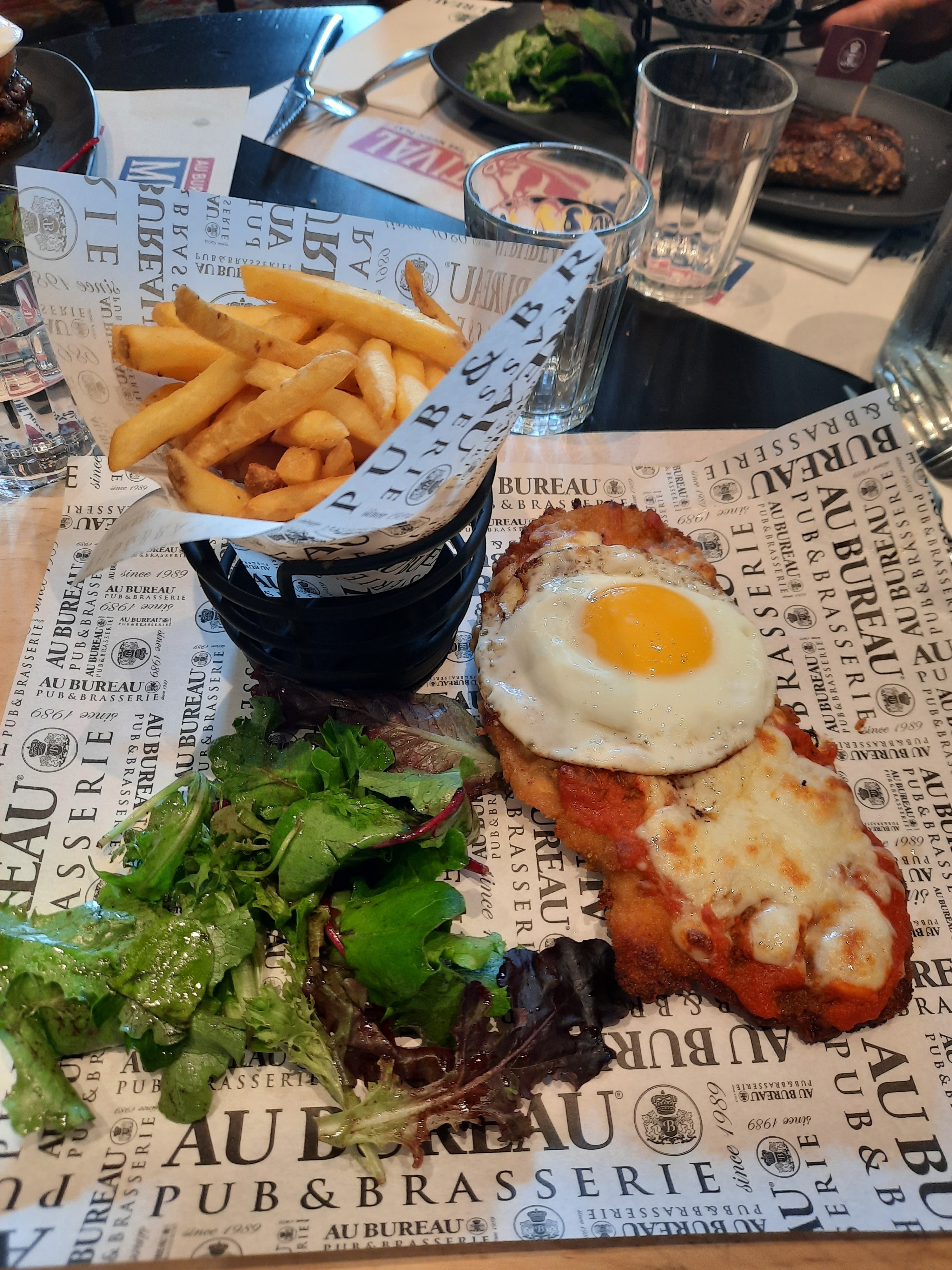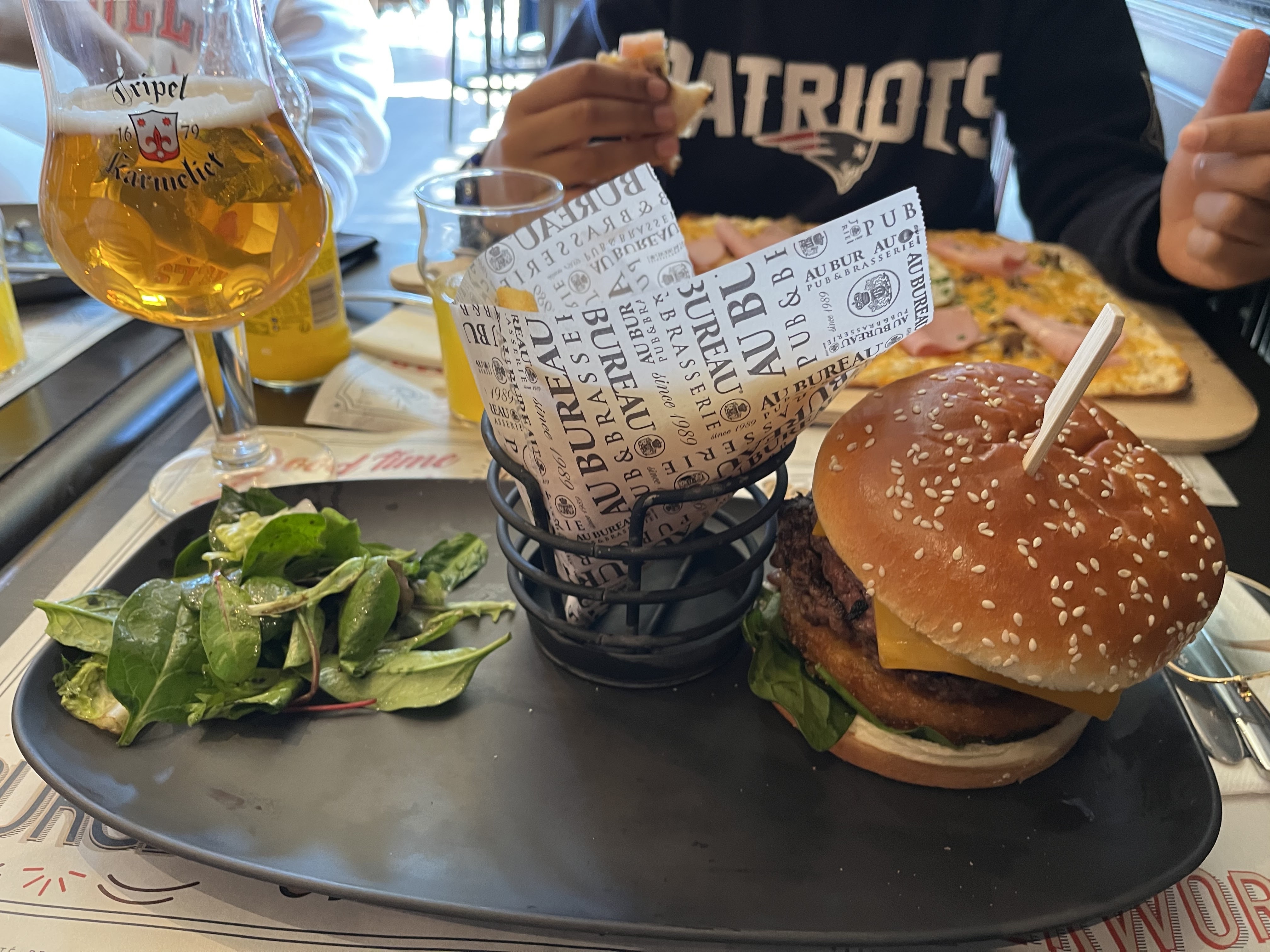 J'ai bien apprécié ce bar, qui n'est pas le premier Au Bureau que je visite. La décoration est très stylée, avec des portraits de golfeurs et tennismen je suppose ! La nourriture est très sympa, les burgers que mon groupe d'amis et moi avons choisis étaient très bons :) Les bières ont été servis dans des verres très beaux et je suis très contents de boire dedans Un bureaux très carré 🚀