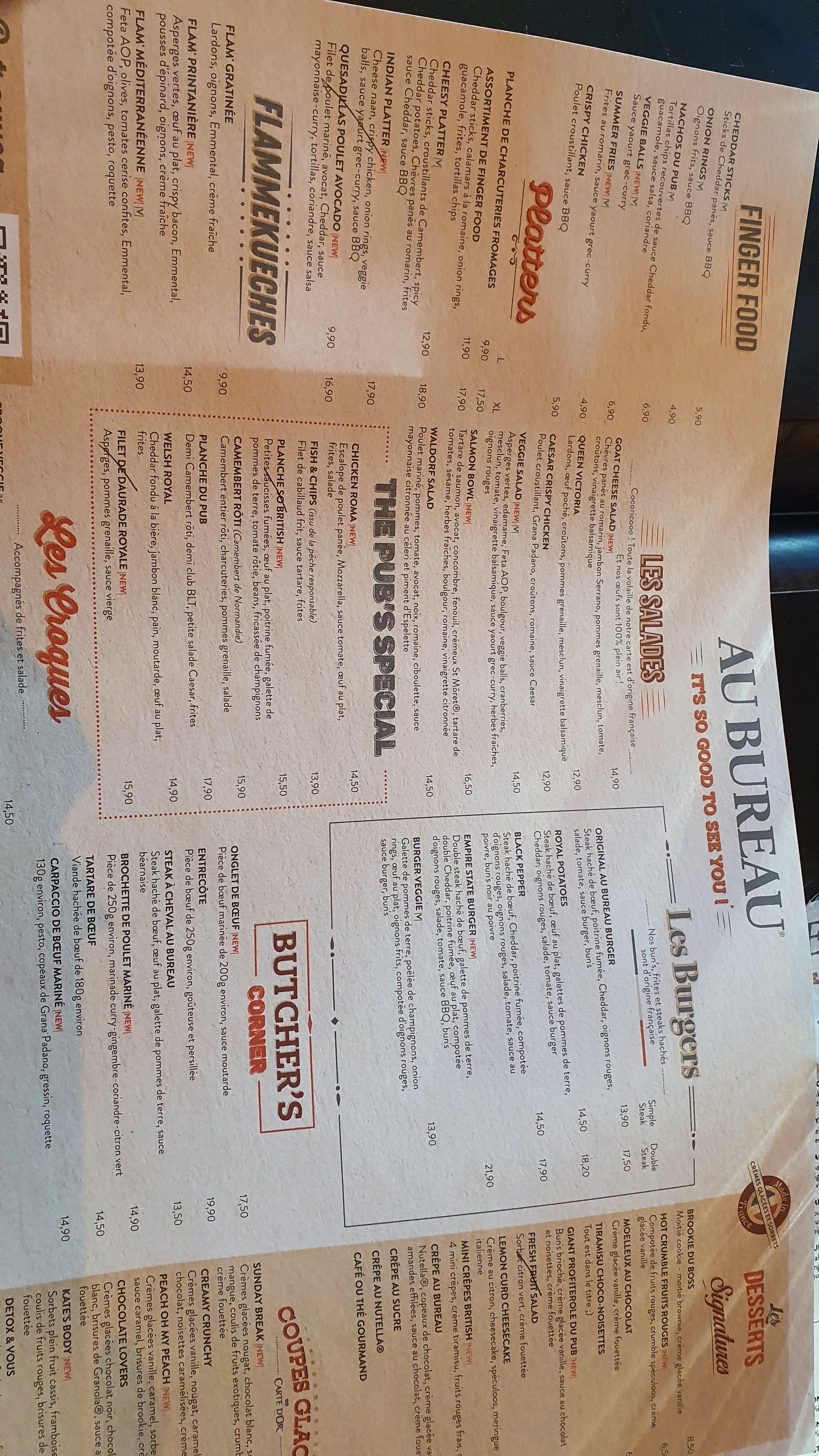 J étais samedi dernier au bureau. Apéritif très peu rempli un martini de 1cm seulement dans le verre, Fish and chips moyen, il faut réclamer le pain , le sel et les sauces. Très déçu car pas de vrai menus, ça a bien changé. Prix cher pour ce repas. Je ne reviendrai pas dans ce restaurant, à éviter. Très long service, pourtant il n'y avait peu de personnes.