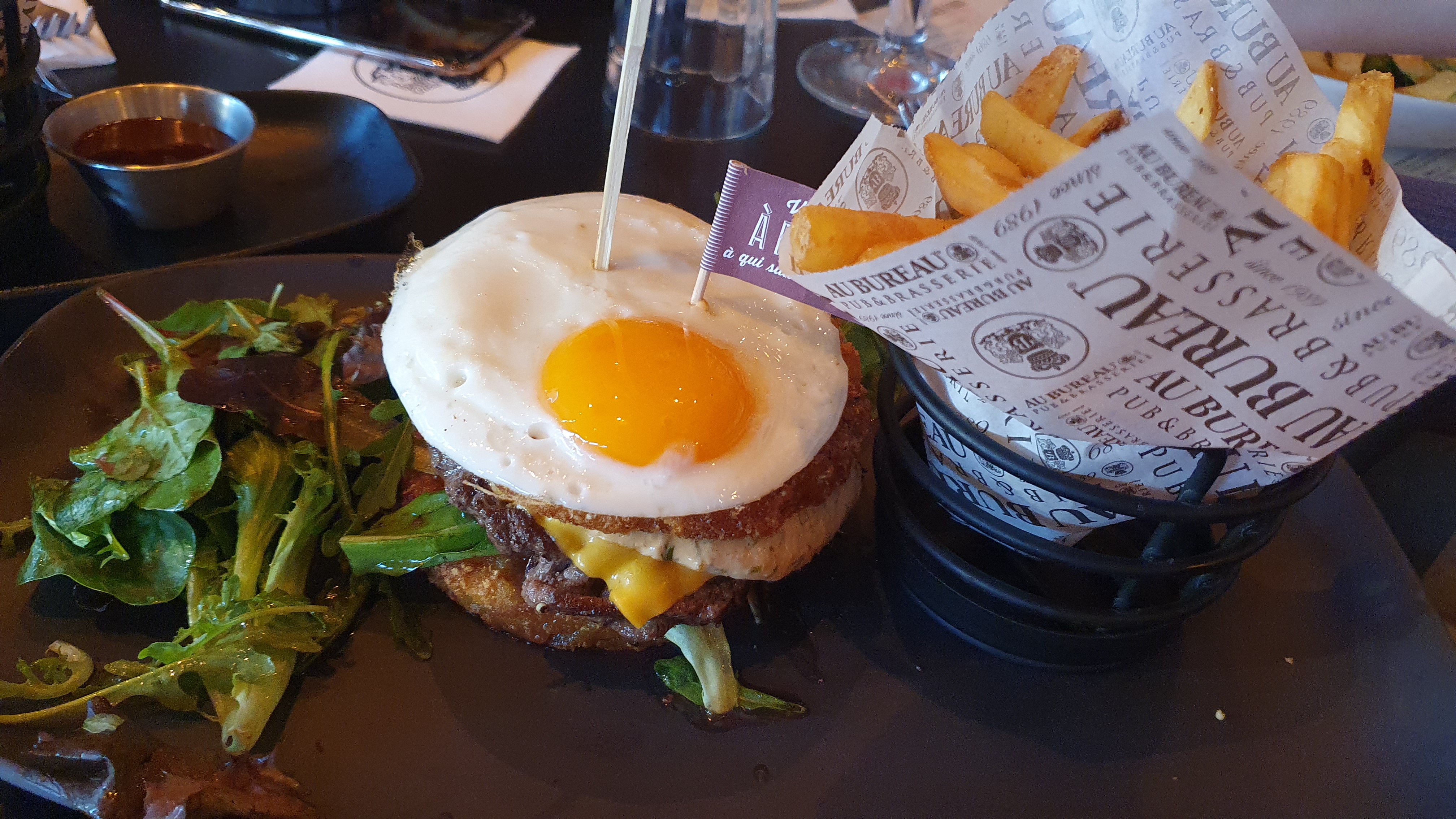 Dommage… on m’avait parlé de ce Pub/Brasserie comme une marque à cocher sur sa self liste adresse culinaire ! Bilan du déplacement, totale déception. Trop « ambiancé » sûrement ! J’en retiens que la déco des lieux. Sympa, chaleureuse, point. Du reste, une attente interminable. Bizarrement certains étaient servis avant d’autres sans logiques aucunes. Sinon… Bien présentés? Je vous laisse en juger (Photos)… les plats chauds étaient servis froid (Viandes & frites) même les fromages n’étaient pas fondus… Forcés de les renvoyer en cuisine. Du coups, réchauffés… avec sa salade (burgers)… Bref… Même l’addition ne voulait pas venir… débordés ? Pas le bon jour ? Les commentaires négatifs se confondent et du gros positifs par moment donc bon… perso je ne pense pas y remettre les pieds. Bonne chance hein🤞🏾 Maj août 2022 Comme quoi on a tous le droit à une nouvelle chance. Service, plats, tout était nickel. Je ne sais pas si l’équipe a changé mais peu d’influence et géré aux petits oignons. Venus avec les enfants, menu dispo 6,90€. Juste ce qu’il fallait. Merci l’équipe.