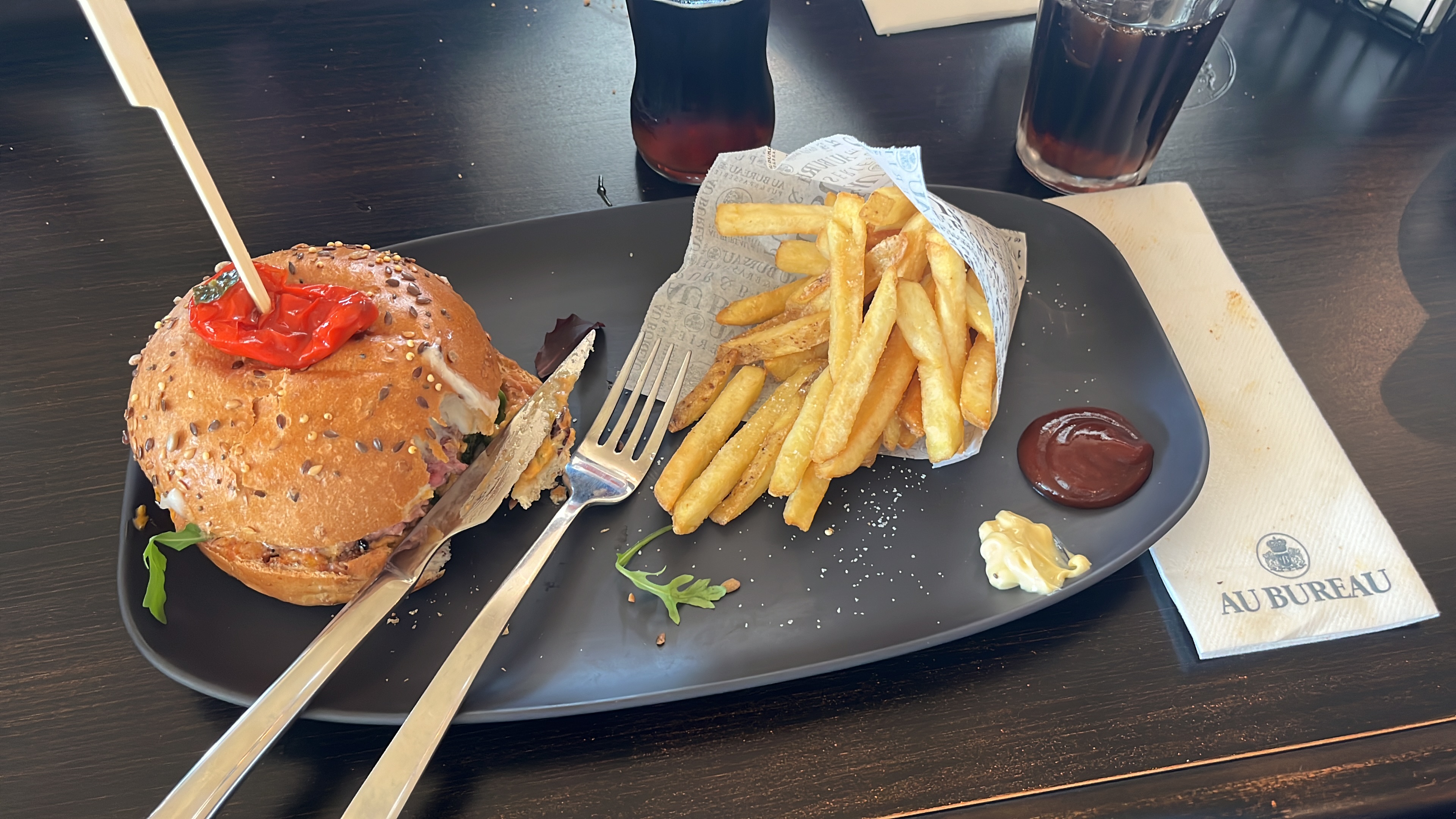 Première venue dans ce restaurant, nous avons l’habitude de nous rendre dans la chaîne Au Bureau sur Lyon ou lorsque que nous partons en week-end ou vacances car nous apprécions le choix varié des cartes, leur cocktails originaux, l’ambiance et le cadre et encore une fois nous n’avons pas été déçus ! Petit bémol sur le service un peu long et où nous avons dû faire appel deux trois fois pour être commandé, ou l’oubli des sauces .. mais étant donné leur ouverture récente il faut bien qu’ils prennent leur marque. Petite mention au responsable et son serveur lors du passage à la caisse qui on été très agréable avec nous et on pris le temps de discuter. On reviendra c’est sur !