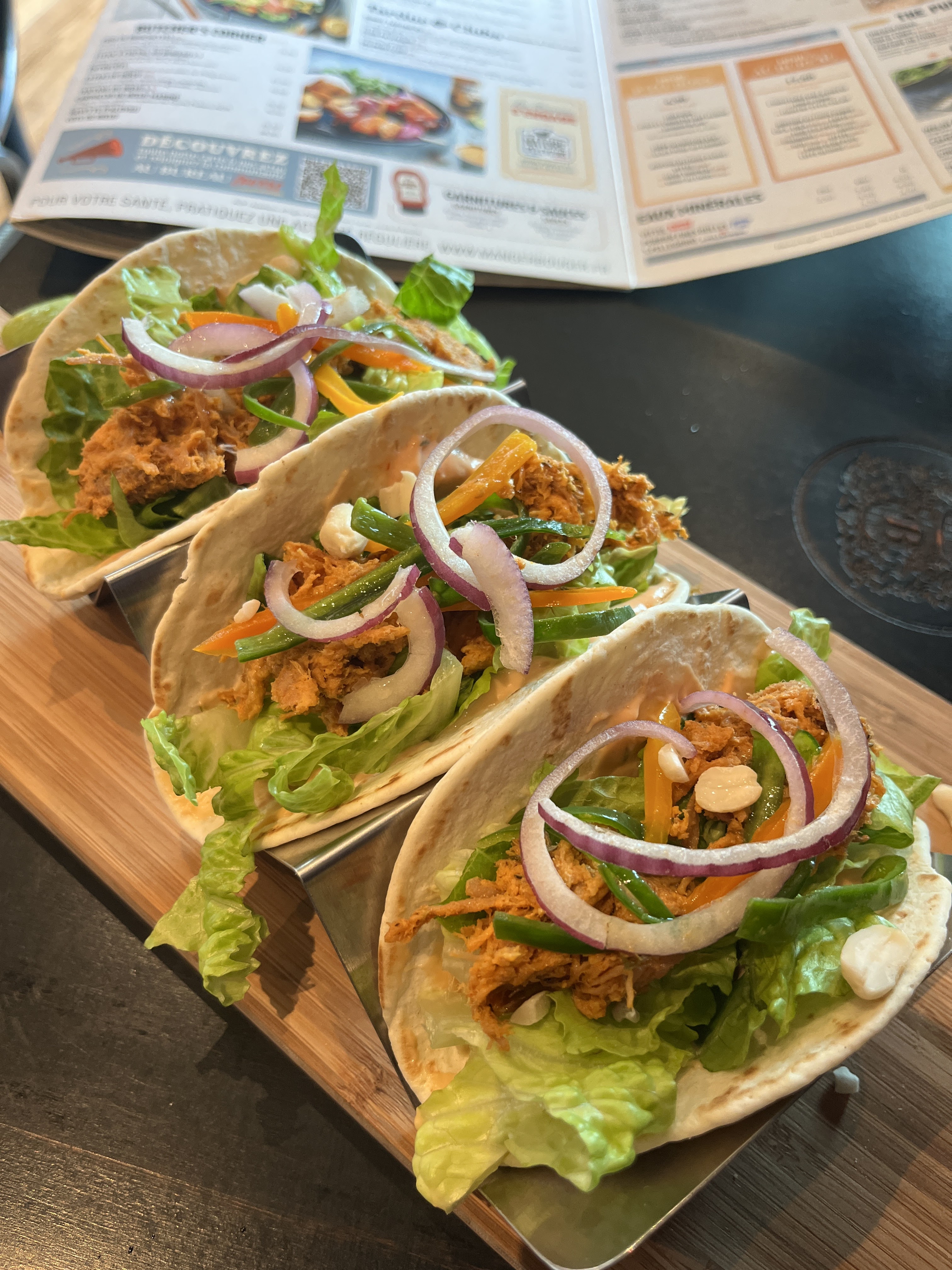J'ai pris des brochettes c'était un peu léger j'ai trouvé un petit morceau de poulet sur la brochette avec un mini poivron doux. 3 brochettes par assiette mais surtout froid. Si non pour le service rien à redire