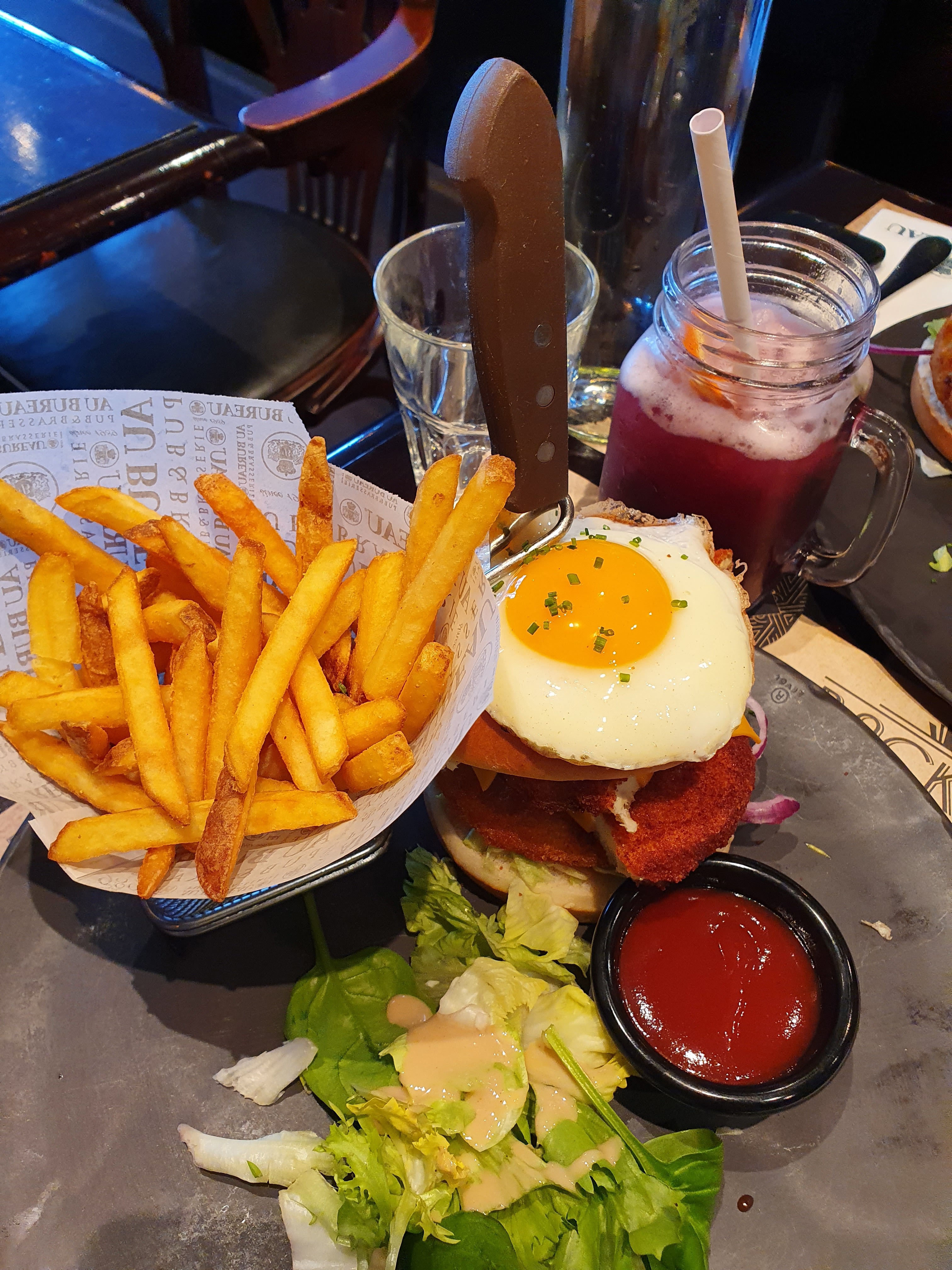On a pris des chicken Burger, tout est bon , frittes très bonnes Le mocktail purple reign est très bon pour ceux qui aiment les Cocktail doux et sucrés. Toujours satisfaits chez au Bureau