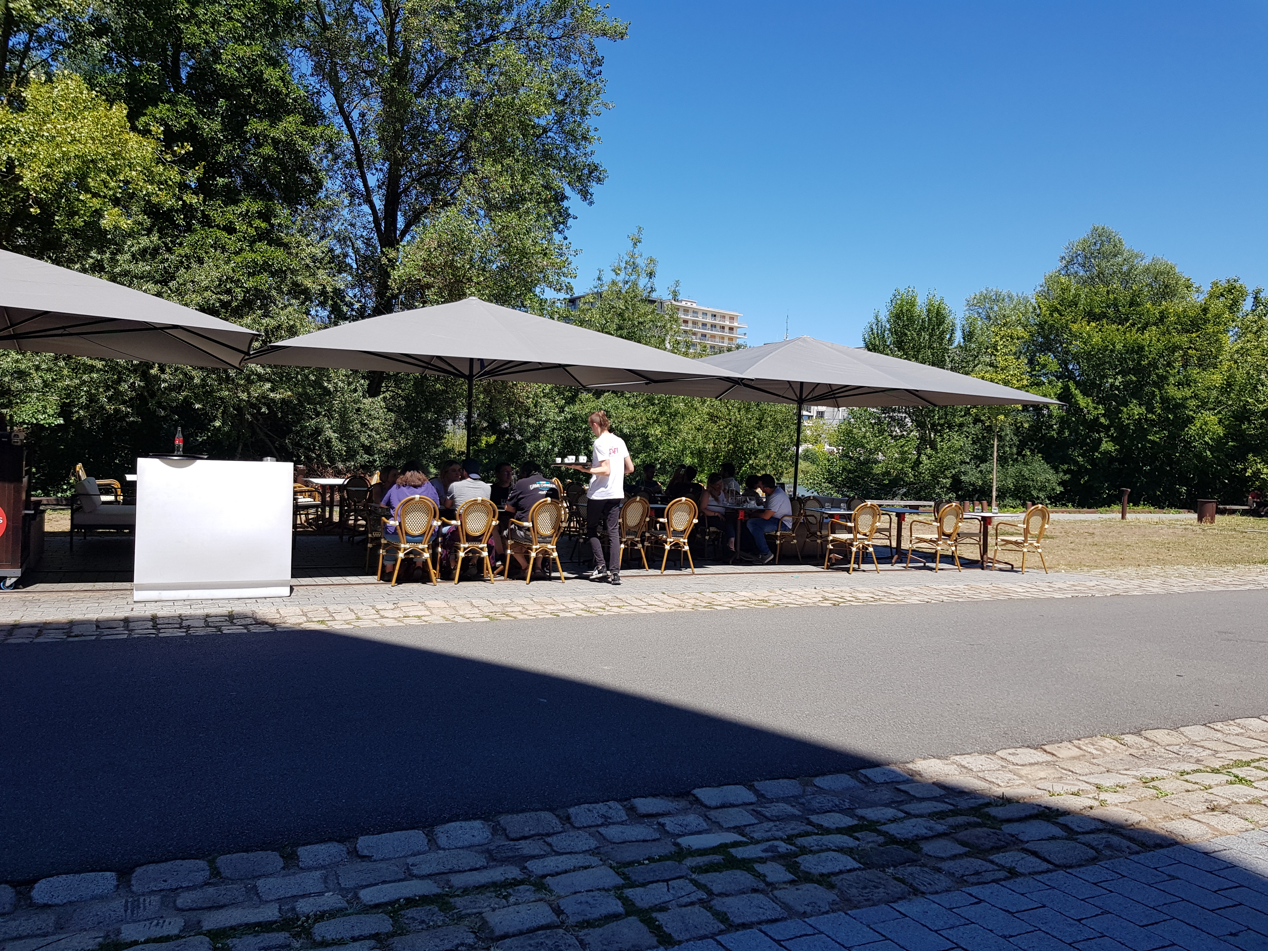 Super cadre ! Ce Au Bureau est situé sur les quais face à La Loire, immense terrasse dans l'herbe avec transat' et bar d'été etc. Côté nourriture, nous avons très bien mangé, et côté service c'était impeccable aussi, le serveur était très sympathique. J'y retournerai !! Petite précision, proximité immédiate (10-15 min en voiture) de l'aéroport, ce qui peut s'avérer très pratique (et qui l'a été pour nous). Nous y passons à chaque fois que nous atterrissons à Nantes, c'est devenu la tradition.