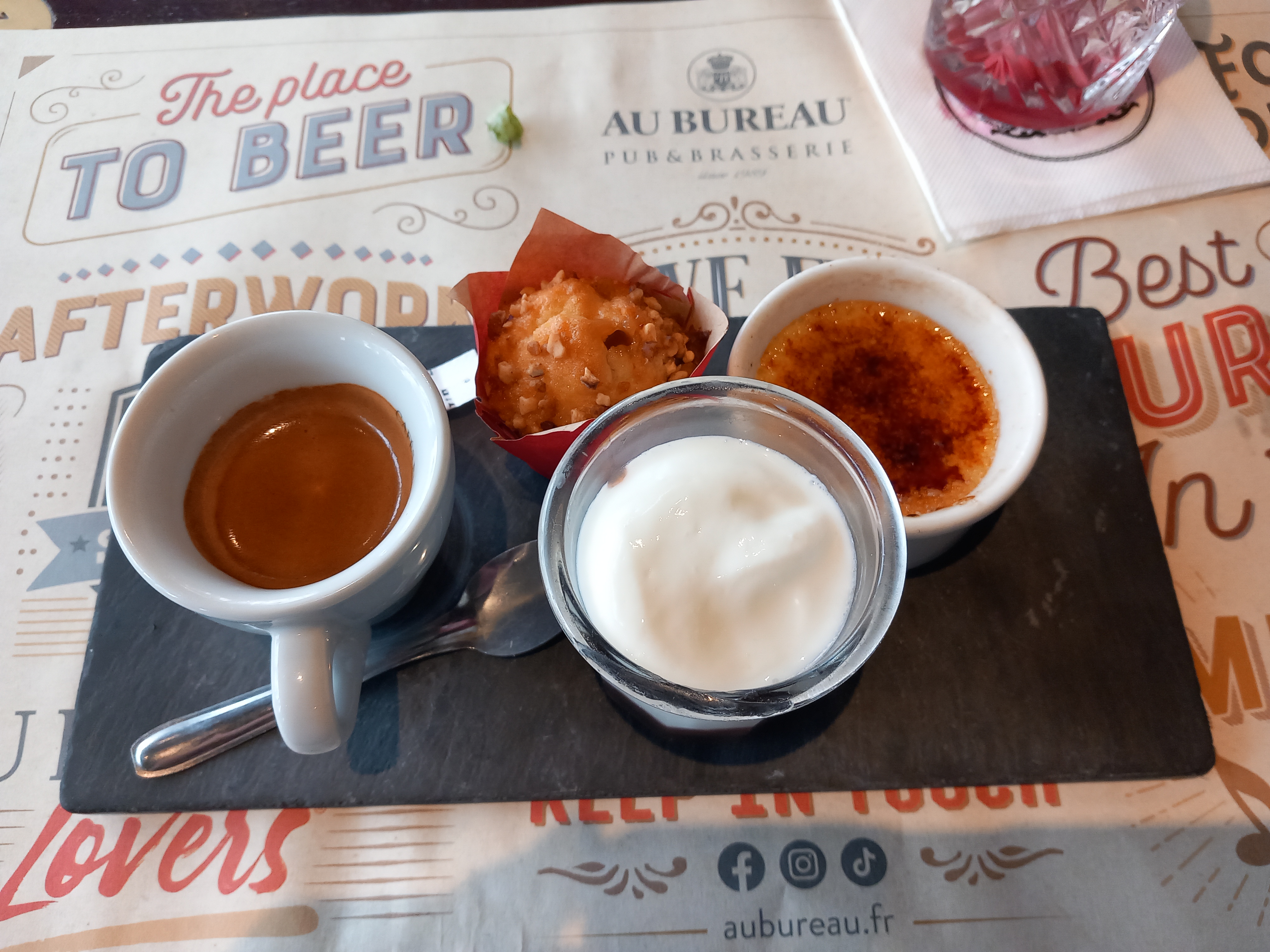 Dans l'ensemble ce n'est pas mauvais et le service très souriant. Toutefois à mon goût le Tiramisu est trop sec et attention à la fraîcheur du dessert meringué au citron.....quant au camembert il faut revoir la recette. Néanmoins dans la région heureusement les Bureaux existent.