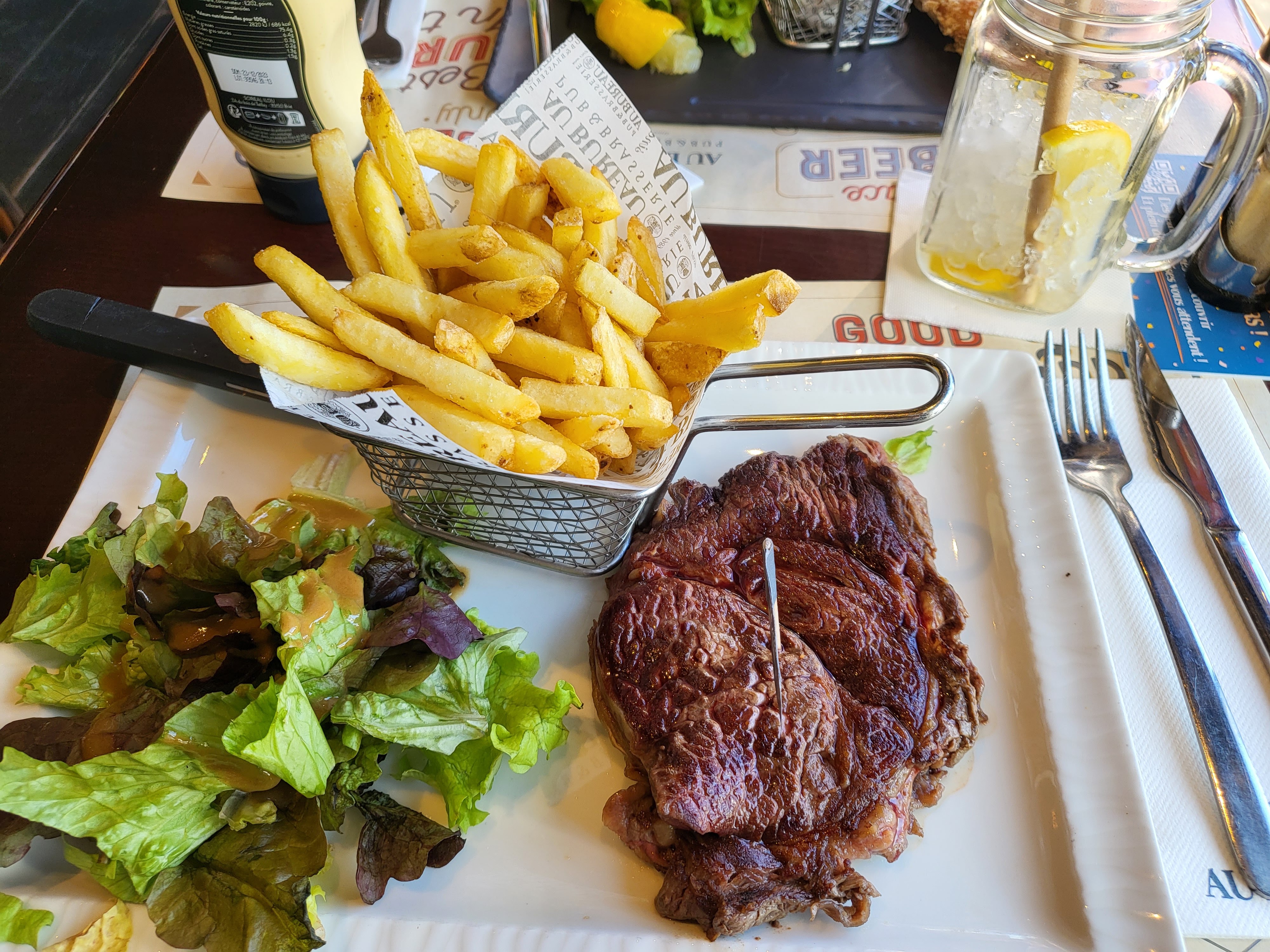 Ambiance assez bruyante, la cuisine est correct mais les quantités pourraient être plus adaptées (ex: taille des steacks hachés dans le burger petit par rapport au pain)
