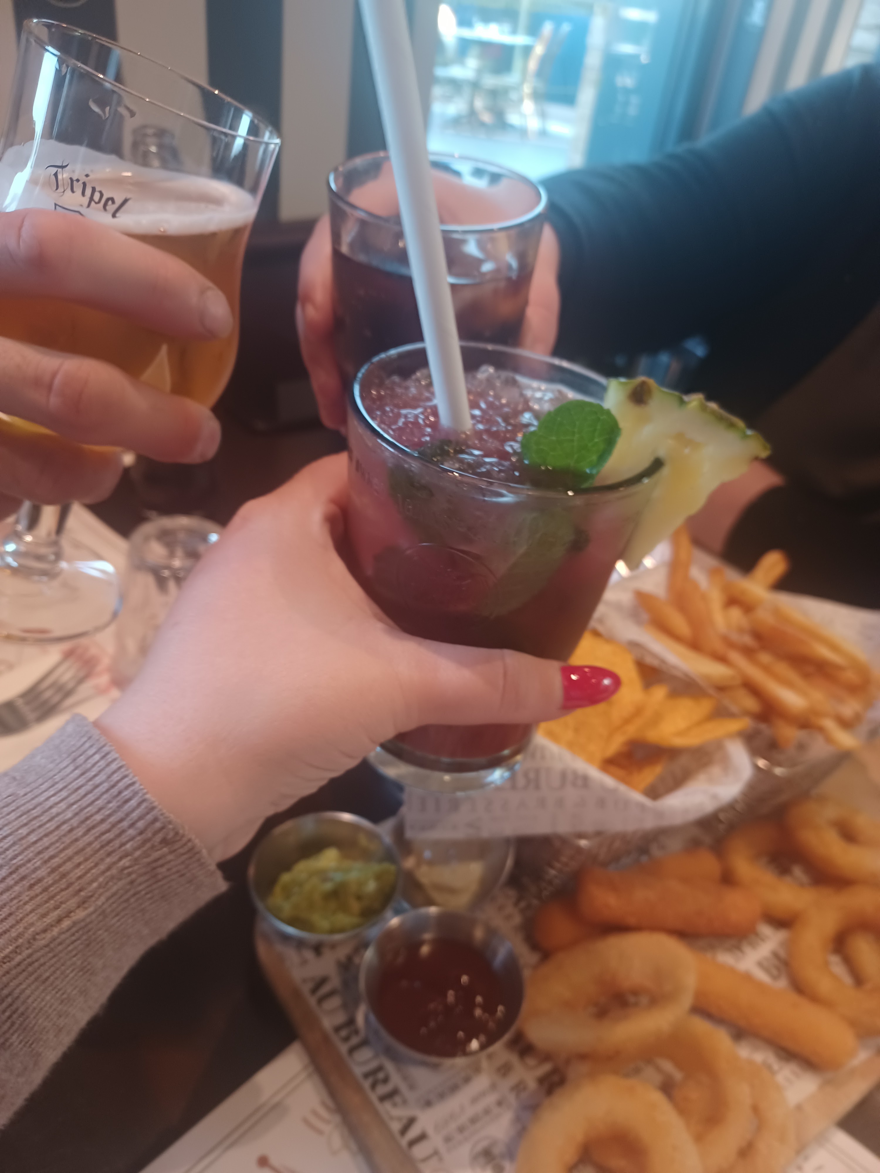 Dîner 4 personnes. Cocktails : 2 cherry mojitos, 1 sweet concomber et 1 tiki tiki (sans alcool) pour le chauffeur. Ils sont savoureux et bien présentés. Nous les avons accompagné avec des onions rings et des crispy ravioles (a découvrir absolument) Plats : 1 bouger original, 2 Louisiana et 1 spicy. Les assiettes sont réparties vides. Enfin nos épouses ont terminées sur une excellente crispy brioche. J'ai attendu ma 2ème visite pour confirmé une première bonne impression. Nous reviendrons