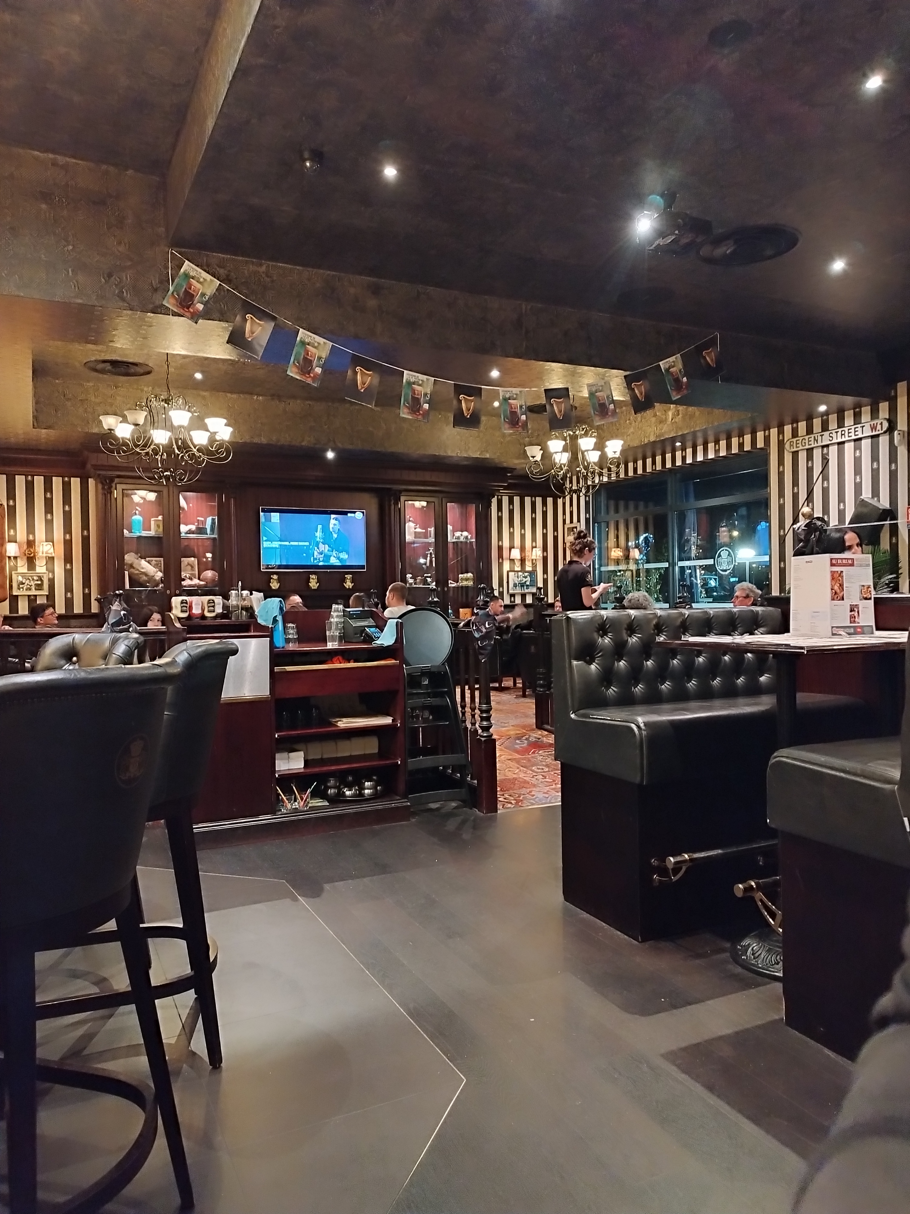 Déco ambiance pub british très sympa Bon moment Service rapide Du choix , même pour végétariens Bon choix de boissons Plats copieux et goûteux Bon moment A refaire