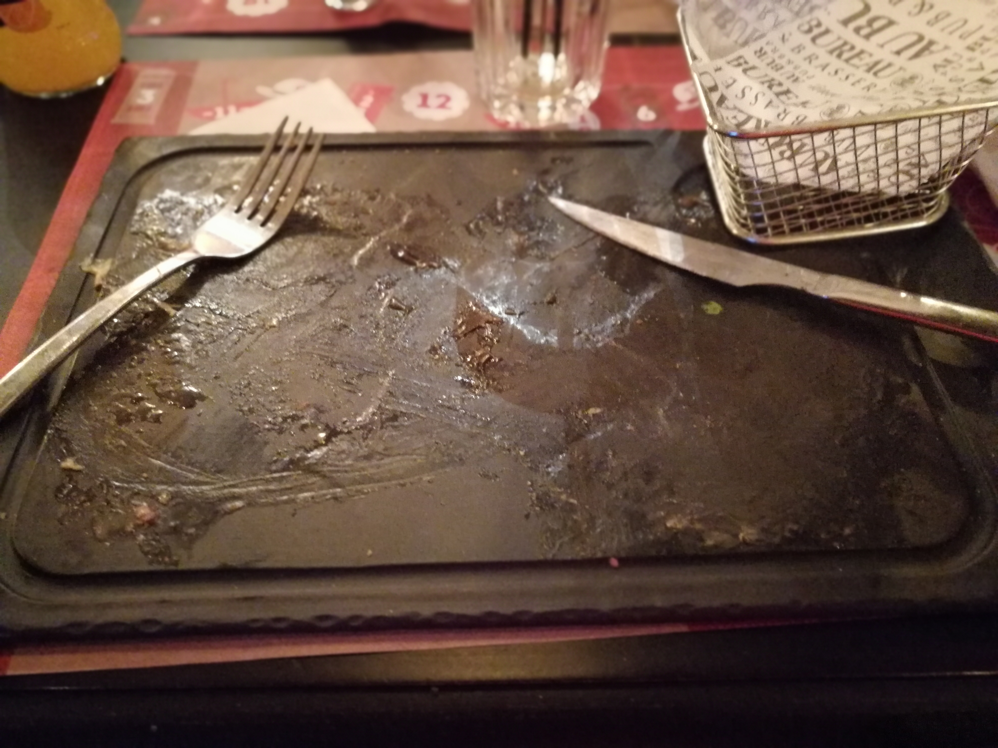 Pas très propre pendant le service, obligez de demandez plusieurs fois pour avoir 1 fois du pain, frites industriel... Très moyen.