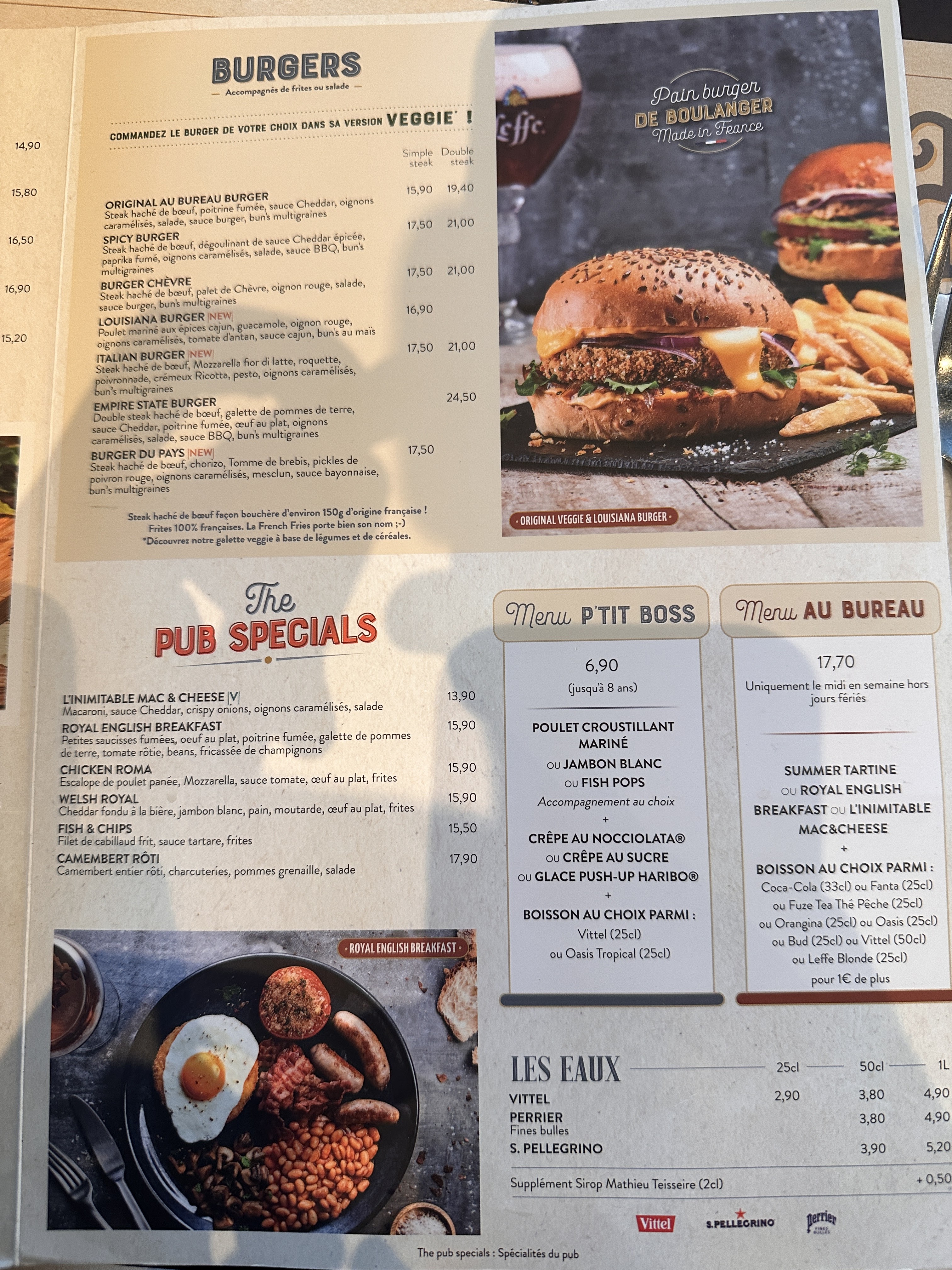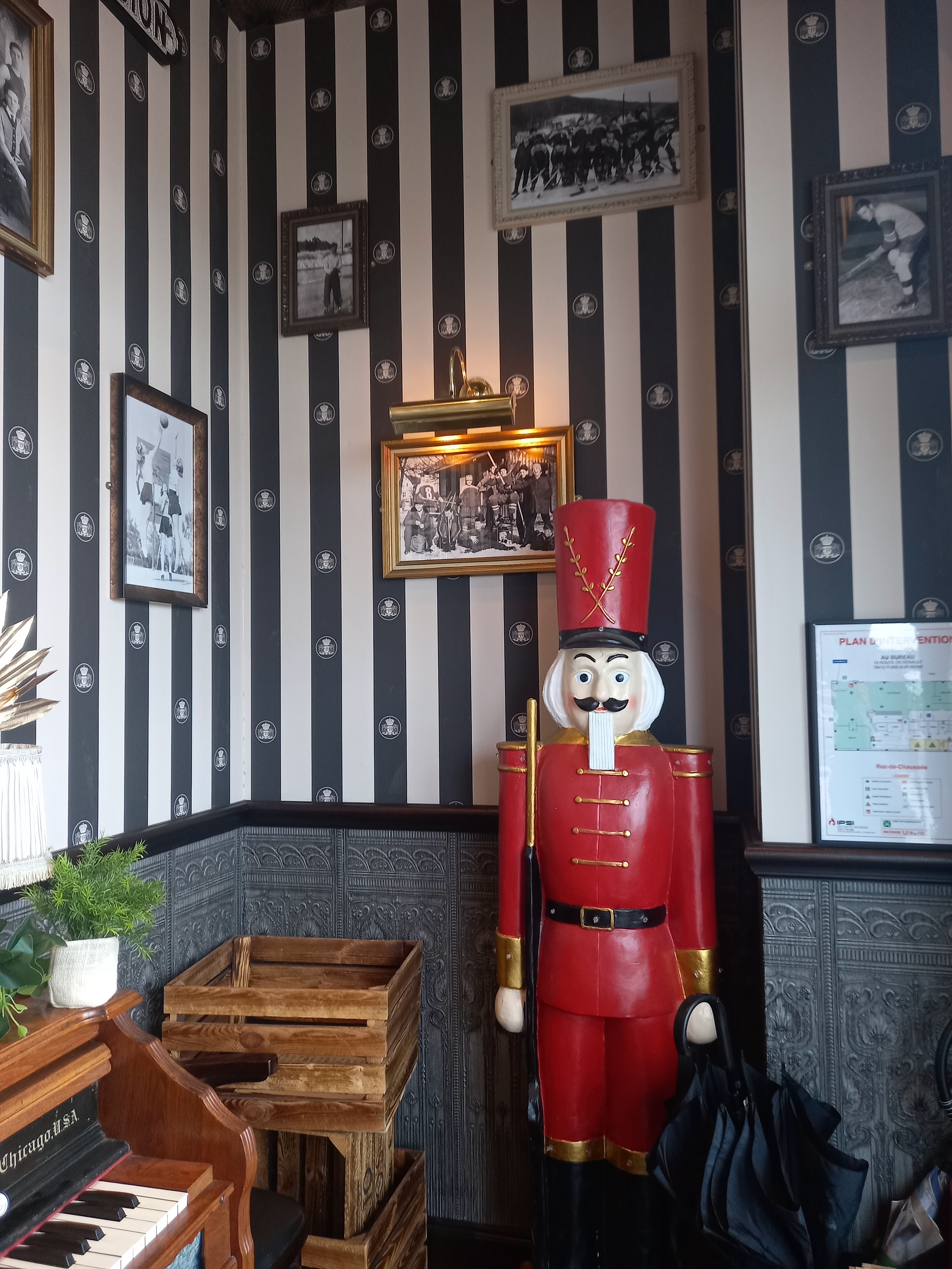 Nous avons vécu notre première expérience au bureau et ce fut une véritable excellente surprise... 😀 (je ne sais pas si c'est vraiment français comme expression mais bon... 😊) Tout d'abord en rentrant dans le restaurant, vous découvrez une décoration soignée avec pour commencer un piano et une ambiance léchée façon pub irlandais ! 😀 C'est ensuite que votre regard sera attiré par une superbe moto mise en valeur sur un meuble en bois de toute beauté ! Enfin un mot vous vient à la bouche en vous demandant dans quel endroit vous vous trouvez qui est Wouhhaaaa... Quelle classe !!! Les éclairages sont soignés avec de multiples suspensions en forme de boule et 3 magnifiques lustres au dessus du bar qui subliment cet intérieur ! Les très nombreuses photos encadrées vous feront voyager... La déco ultime est cet aviron (il se peut que je me trompe de nom d'embarcation en bois) accroché au plafond avec le petit détail qui tue qui sont les vielles chaussures dan le bateau !!! Même le papier peint au plafond est superbe, il vous donne l'impression d'un plafond en cuir sculpté.. Vous le retrouverez même sur les murs des toilettes (qui malheureusement n'étaient pas spécialement rutilantes ce soir là, cela peut se comprendre vu le monde dans le restaurant , mais bon, c'est le seul petit reproche que je ferais) Le service est plutôt rapide, aimable et efficace sans aucune erreur de commande, c'est vraiment agréable ! Les tarifs sont vraiment raisonnables et vous en avez pour votre argent dans votre assiette 🍽... Les assiettes sont plutôt copieuses et bien présentées et niveau goût, vos papilles seront servies ! 😋 Je pense que vous l'aurez compris, je vous recommande vivement l'expérience au bureau. 😉