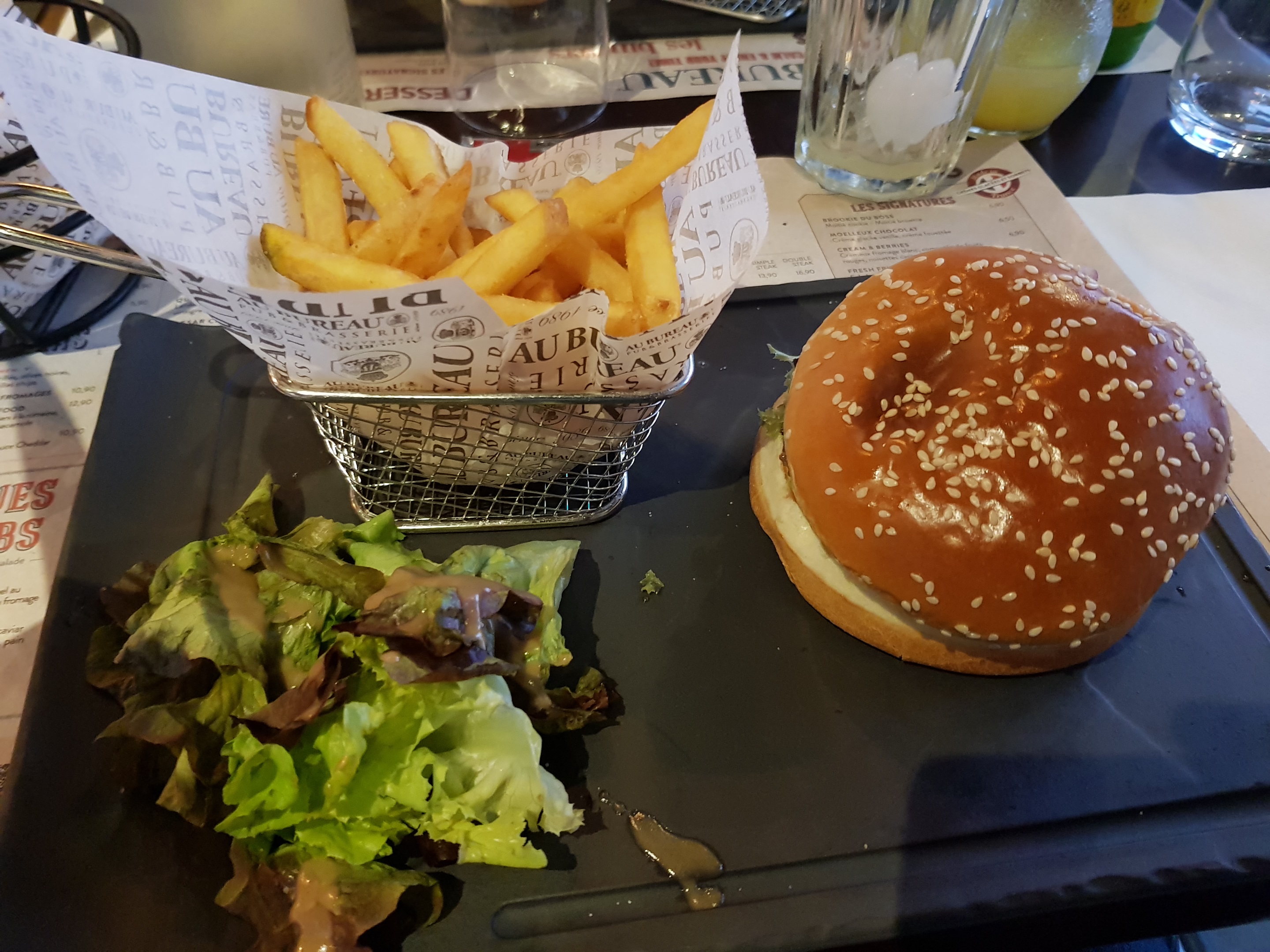 Ce Au Bureau n'est pas du tout du niveau de ceux qu'on a déjà fréquenté. Temps d'attente long, salade flétrie, serveuse pas top, pas de pain pour accompagner nos salades, carafe d'eau (ancienne bouteille de vin) insuffisante avec 4 petits verres à remplir. Bref nous n'avons pas cherché à prendre un dessert. 72€12 pour 4 ! Le hamburger était bien pour mon fils et le plus cher 23€. Vraiment déçu alors qu'au départ on hésitait avec un Burger King 😅