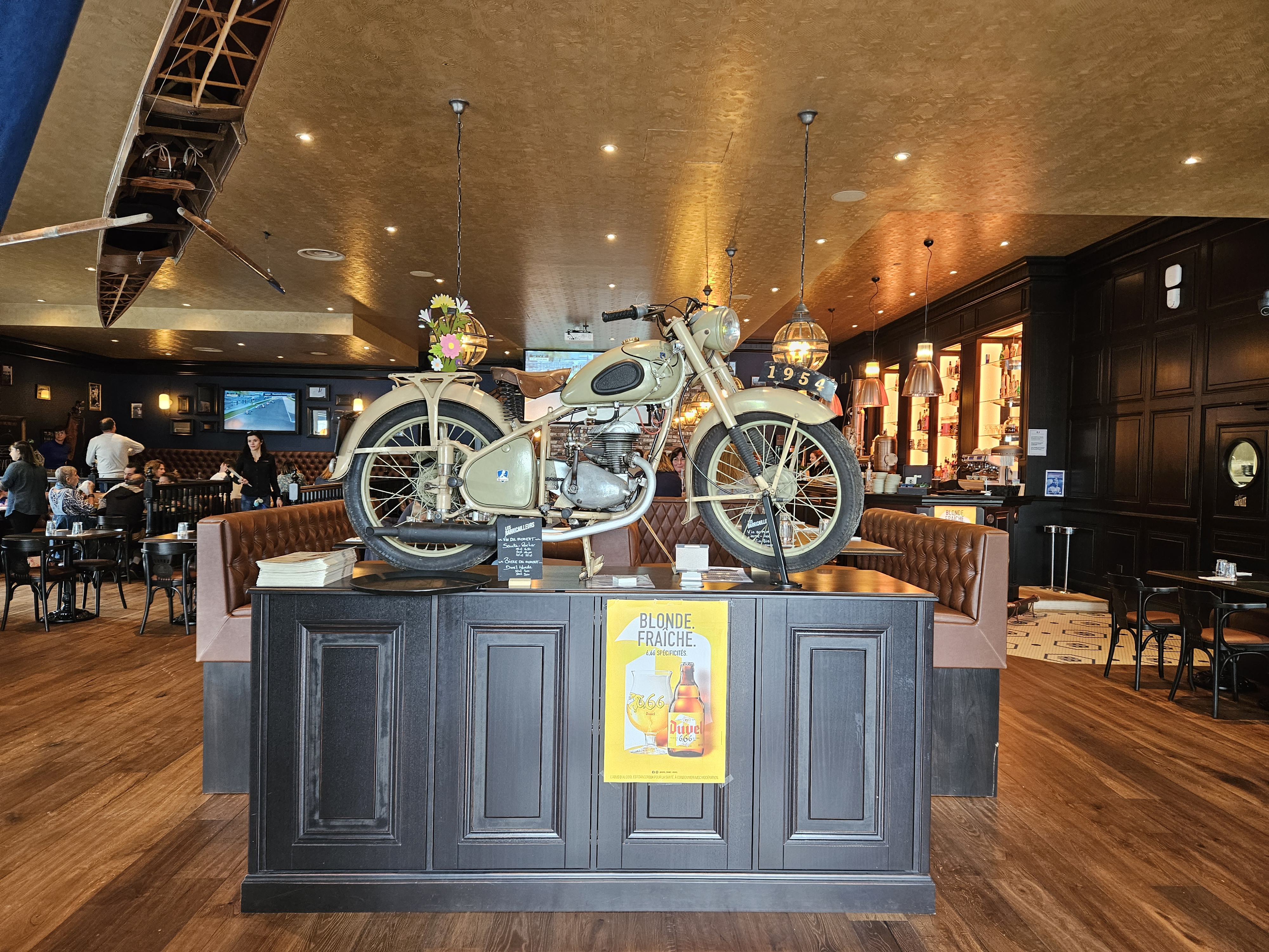 C'est un endroit très sympa, vraiment bien décoré avec différents petits coins notamment un genre de coin salon avec un manteau de cheminée et des canapés club. Il y'a aussi des transmissions sportives. Tout le monde y trouve son compte. Boire un coup, faire un tea Time ou manger sur le pouce avant de retourner au travail. J'ai une préférence pour l'après rush où la salle est moins bruyante. Une ambiance qui peut être appréciée par d'autres. Le personnel est gracieux et avenant. Le restaurant est bien situé suffisamment loin de la route pour manger en terrasse et en plein coeur de la zone des Landiers. C'est un endroit où l'on vient toujours avec plaisir !