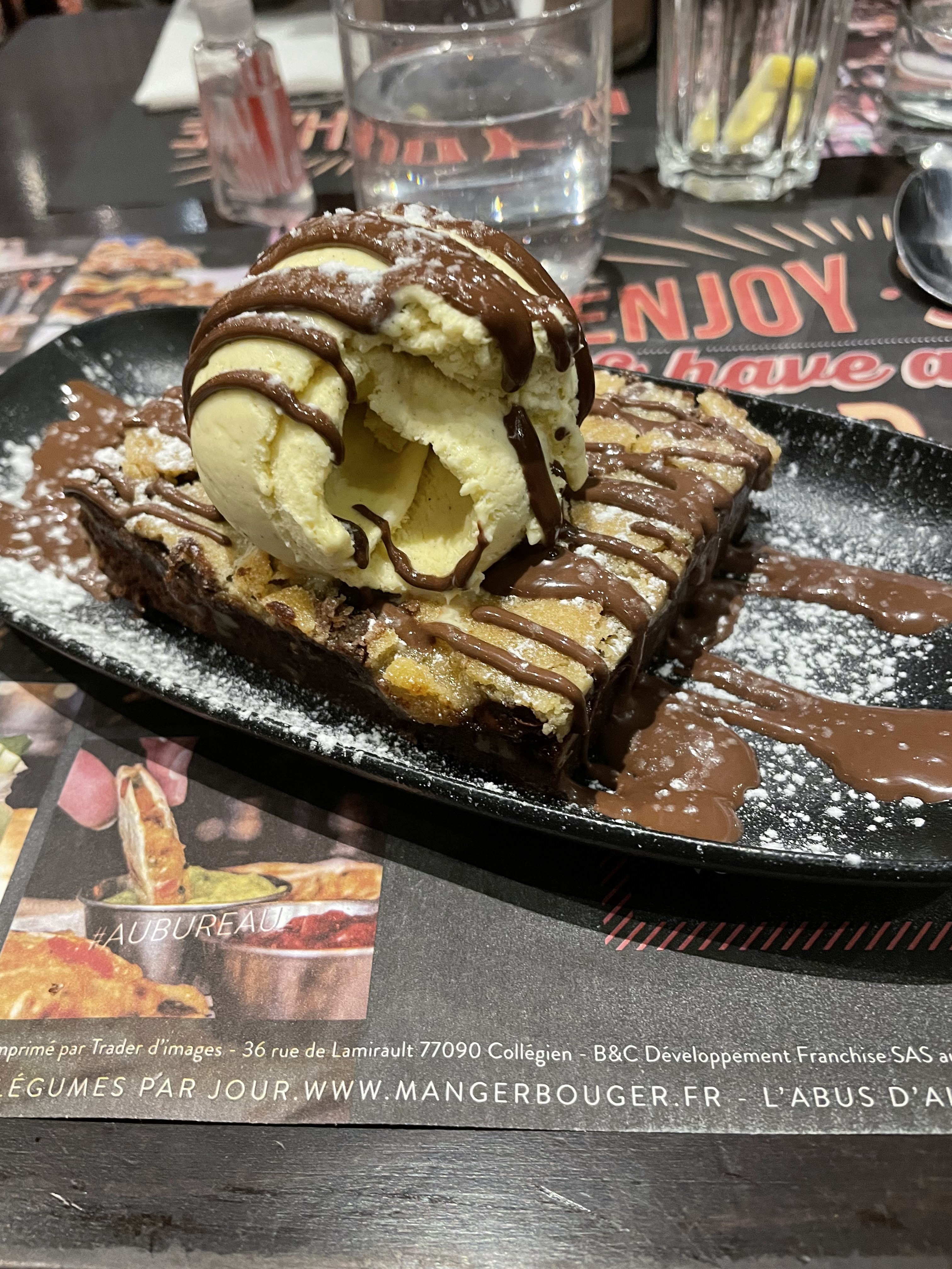 Déjeuner entre amie après un passage au cinéma Plat copieux même pour moi qui ait un bon appétit 🤭🤭🤭 Mais j'ai quand même pris un dessert par pur gourmandise bien sûr commande respectée sans sauce chocolat Restaurant peu fréquenté vu l'heure de déjeuner tardive. Petit bémol pour la table qui se trouve proche de l'entrée des cuisines. Avec les allers et venus des serveurs ont ressentait des courants d'air pendant le repas.