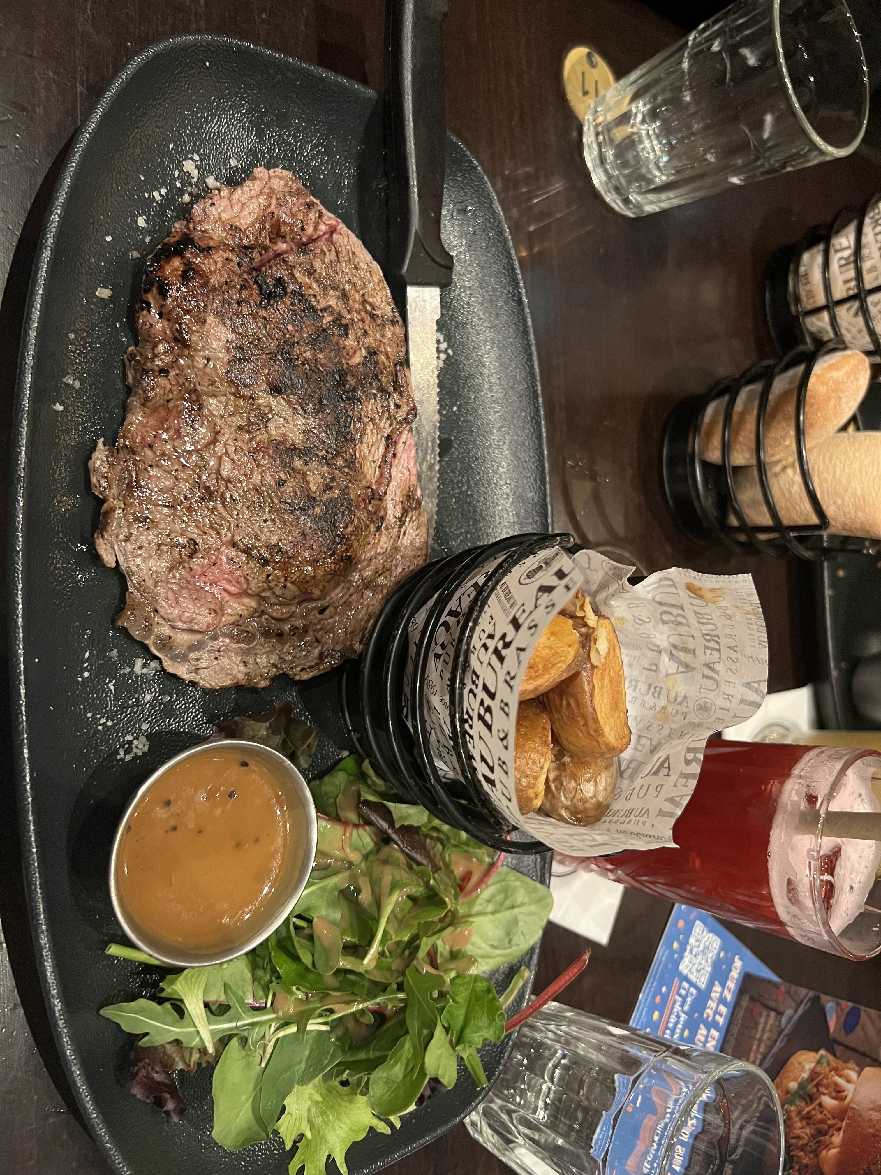 Personnel agréable et accueillant, service rapide. La cuisson des steaks est respecté. Le repas fut bon et copieux cependant attention vous y laisserez une belle partie de votre porte monnaie. En cadeau : un bon gros mal de crâne à cause d'une musique bien trop forte, on ne s'entend pas parlé !