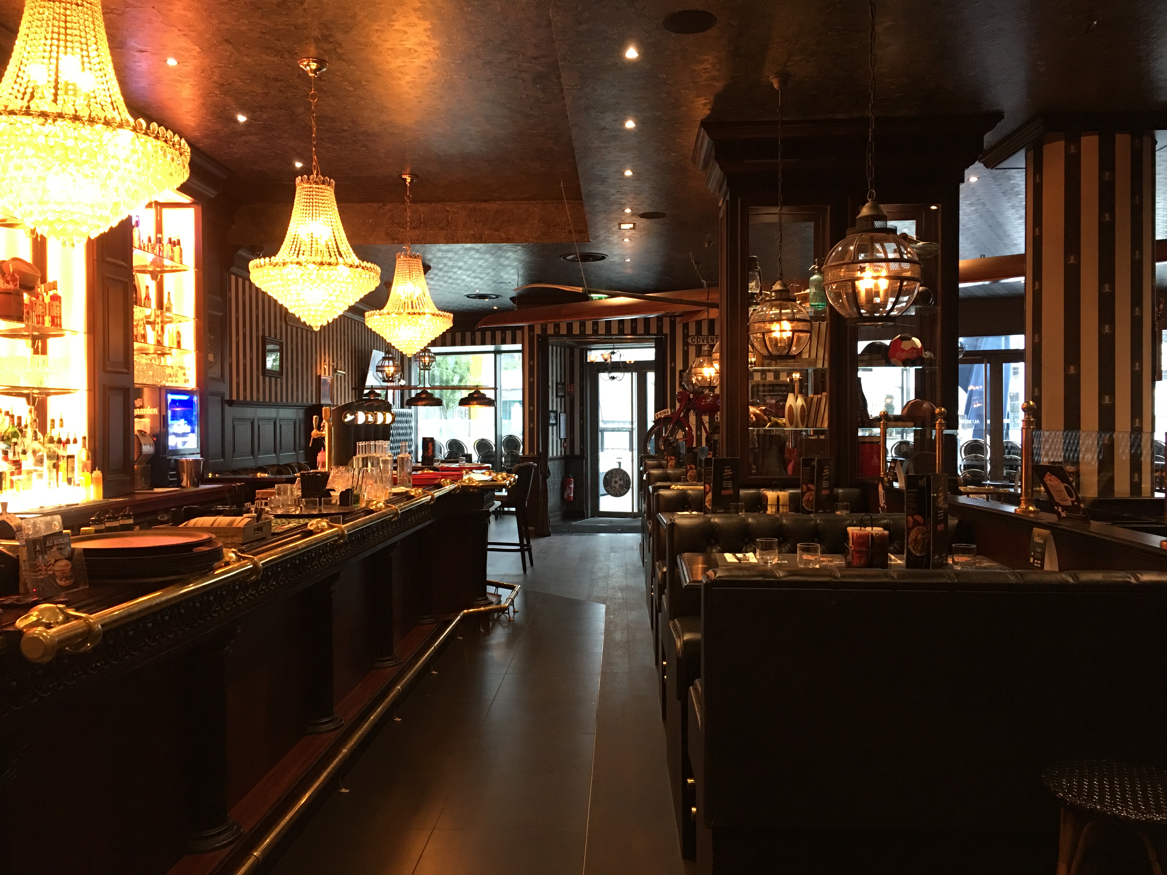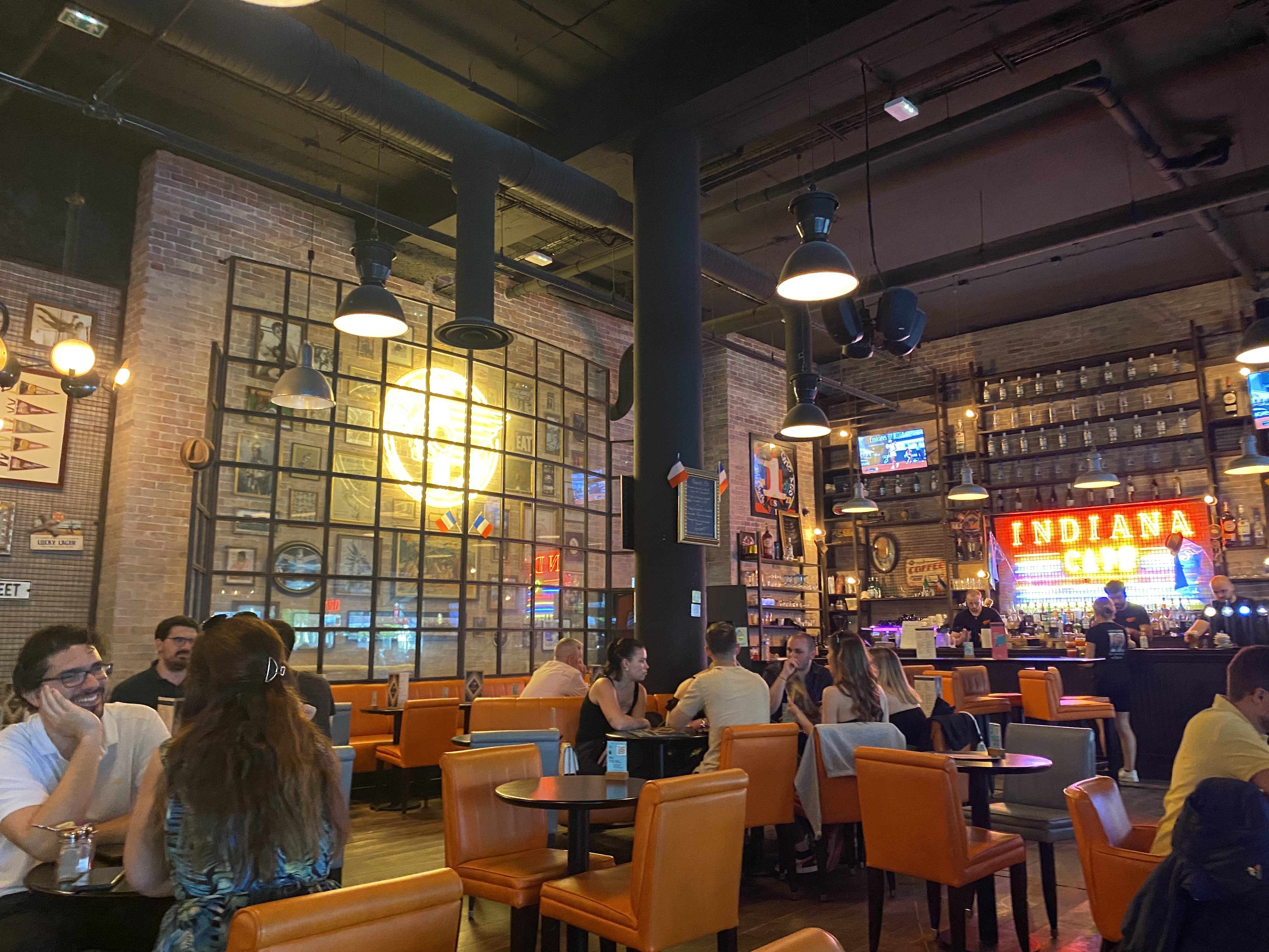 Nourriture style brasserie: gras, pas très sain, pas très savoureux, très peu de légumes, salades etc. Service ultra rapide une fois la commande passée. Ambience sombre mais qui peut plaire. Énormément de bruit (difficile de discuter, il faut être proche ou hurler). Ambiance plutôt jeune.