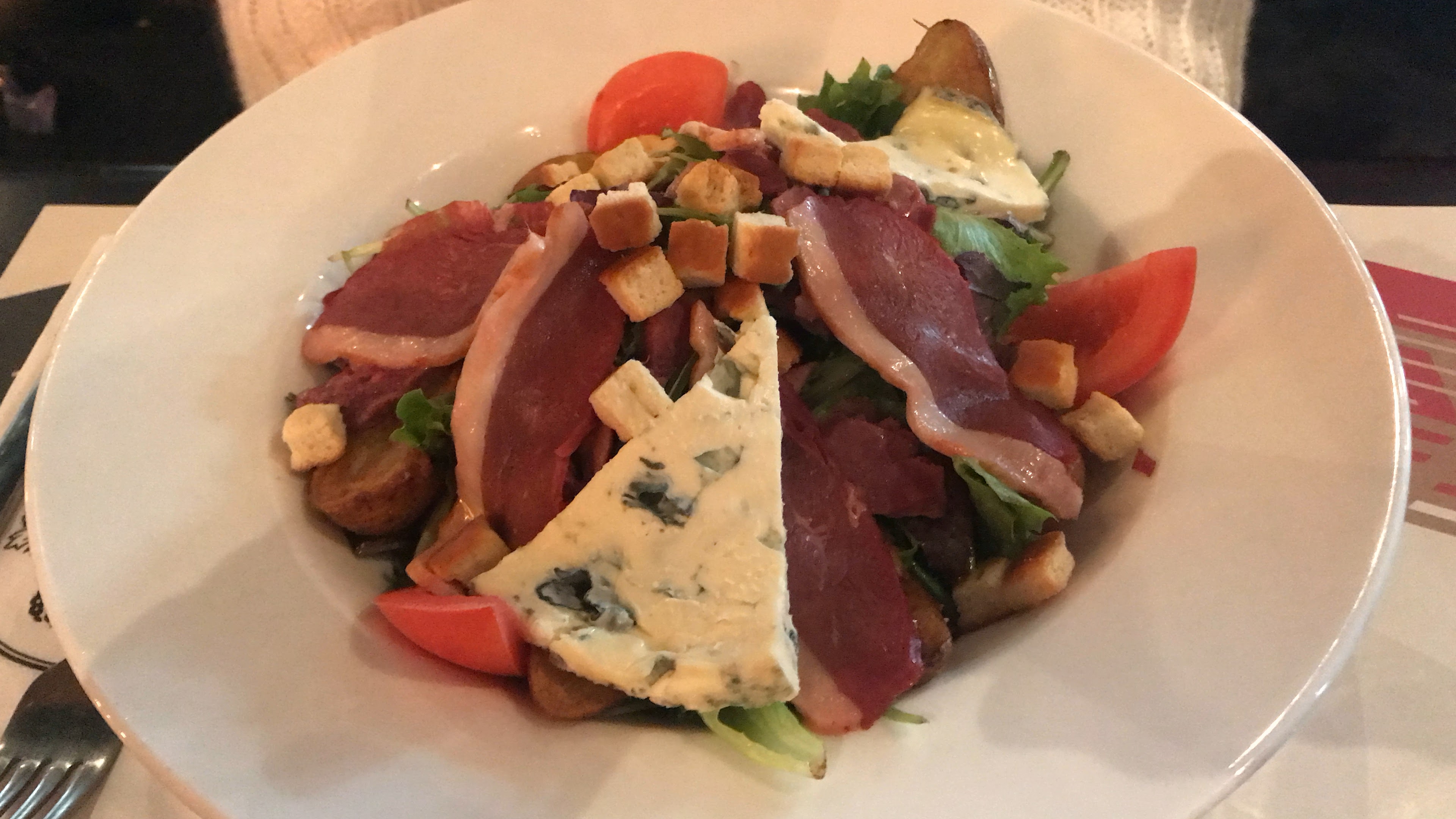 Ambiance super sympa, décor original, la musique était peut être un peu forte, on ne s'entendait plus parler entre le son et la foule.. Les plats sont plutôt bons mais n'ont rien de spéciale, je trouve que les proportions sont bien faites en tout cas ! L'accueil est sympa, les serveurs sont rapides (pas le choix avec la foule) et sont efficaces. Seul petit bémol mon plat est arrivé en retard et froid c'est un peu dommage pour du chèvre chaud... Le restaurant se situe juste à côté du cinéma Pathé et il est facilement visible. Je recommande pour ceux qui passent dans le coin