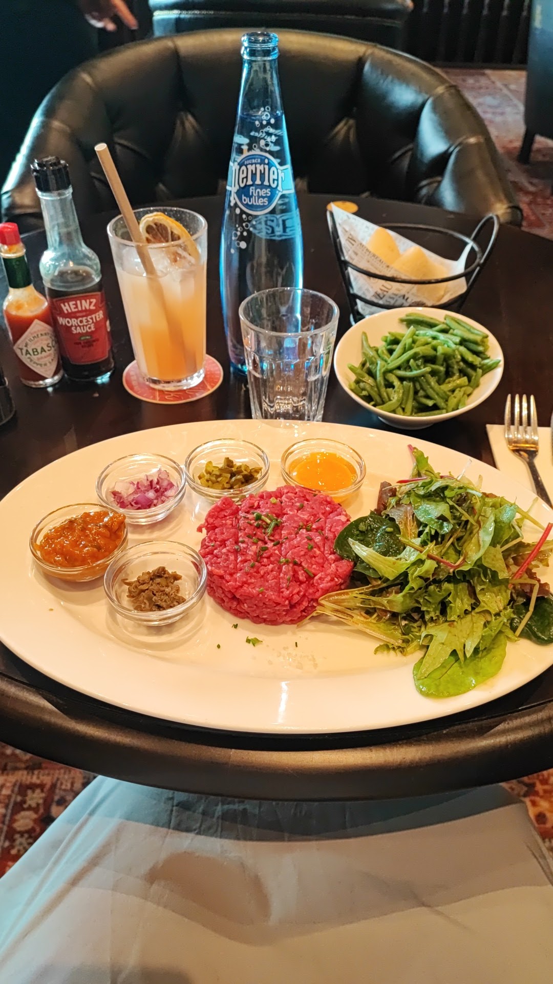 Venue ce jour, accueilli rapidement et poliment par Tiphany et servi de façon efficace et professionnelle par Kheïra. Je commande tartare de boeuf et cocktail épicé sans alcool accompagné d'une bouteille de Perrier fines bulles. Le lieu bien décoré, chic et photo rétro est très propre. Le tartare est arrivée très belle viande, oeuf frais, câpres, échalotes et cornichons finement ciselé, avec une petite sauce légèrement épicée qui se marie très bien, assaisonnement de la salade est juste, feuille croquante, propre à une salade fraîche, haricots verts bien cuits, ni trop ni pas assez. Petits pains croustillants. En dessert, je commande un tiraccino, un tiramisu au capuccino, fait par le chef cuisinier de bout en bout, goût excellent. Je recommande c'est très bon. Bonne expérience