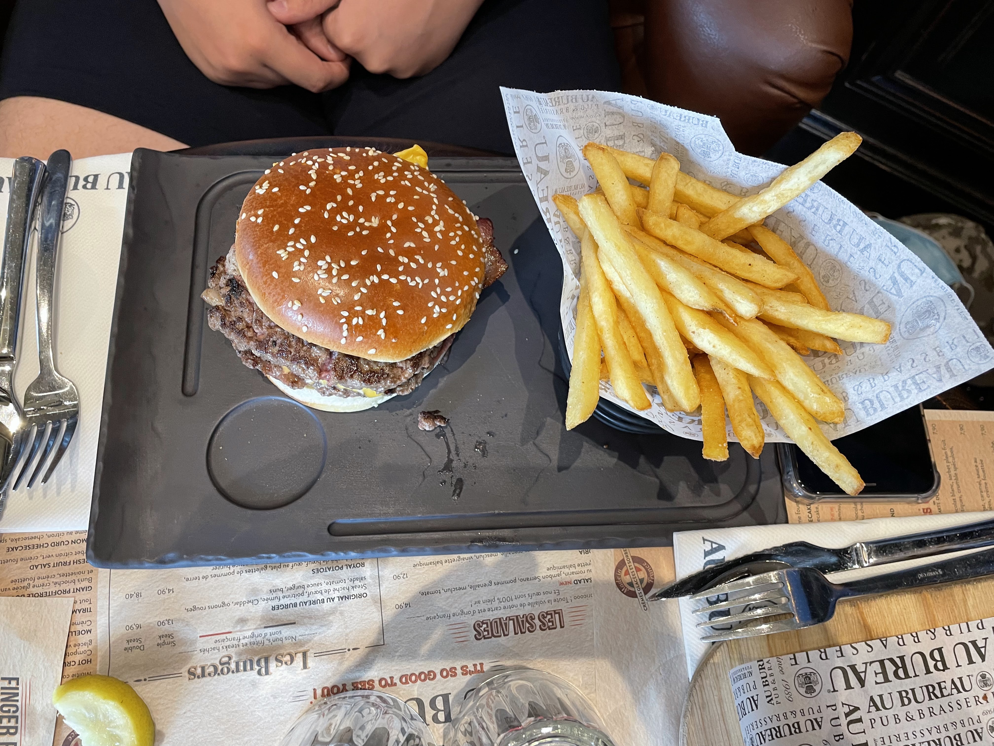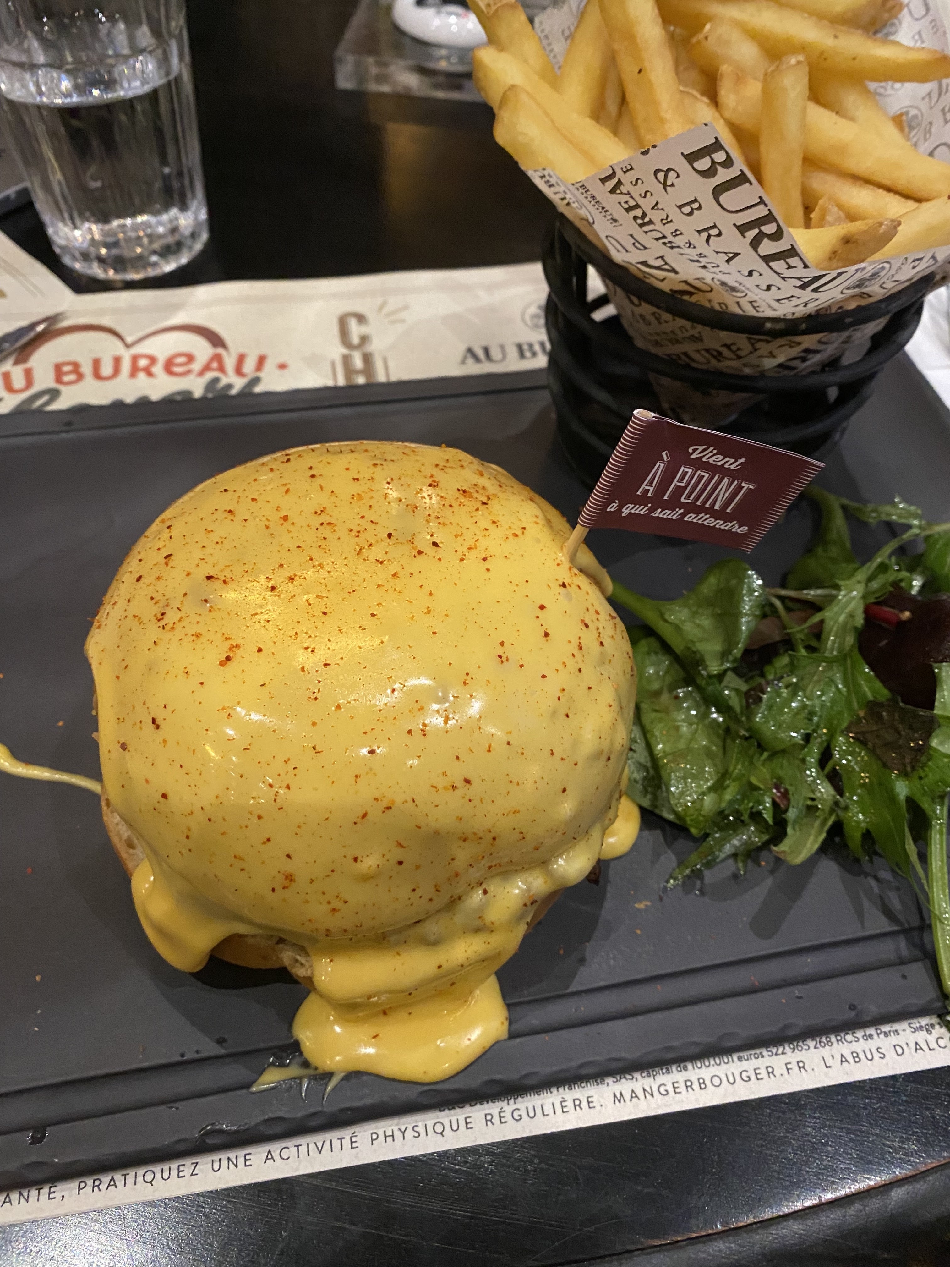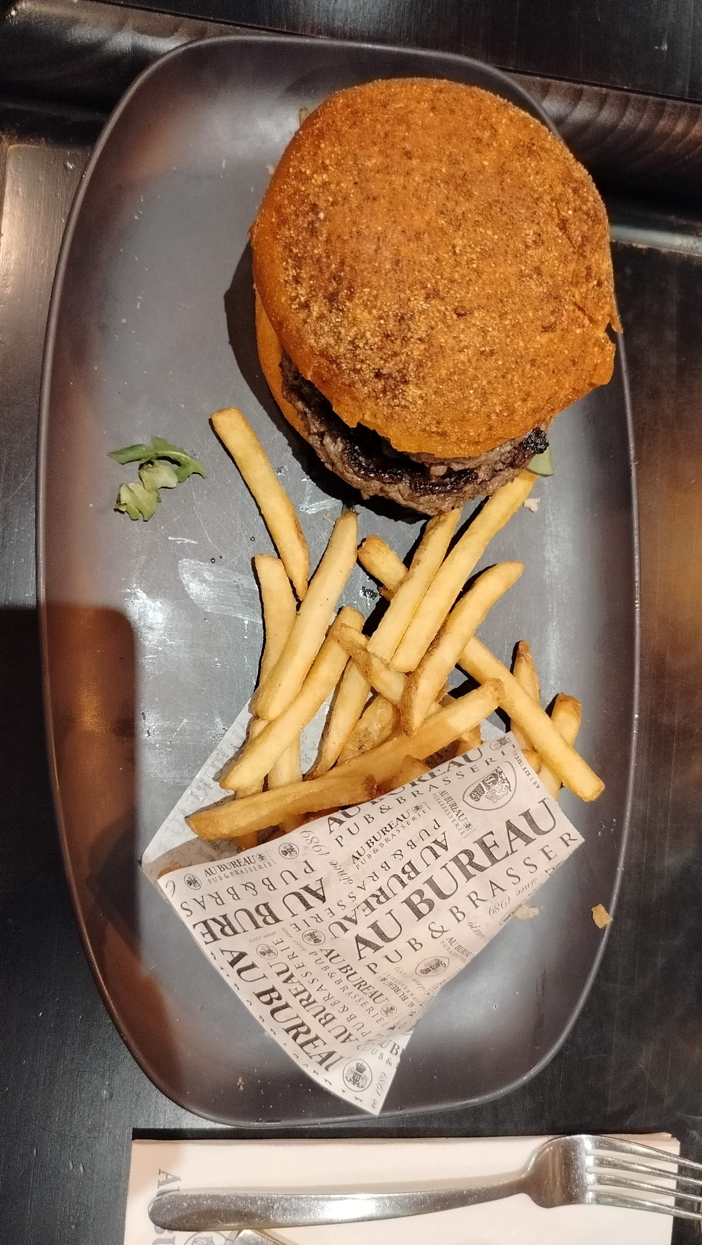 Table de 10 personnes vendredi soir 19h, pour un anniversaire. On commande quelques burgers, ils sont pas oufs mais j'en attendais rien de spécial (buns congelé) mais servis avec des frites froides. On prend des desserts, ils sont servis à table sans couverts, on a appelé les serveurs à plusieurs reprises, on a l'impression qu'ils sont tellement dans le rush qu'ils font tout pour pas être alpagués et regardent constamment le sol durant le service.. bref on nous ramène nos cuillères 15min après. La commande spéciale anniversaire n'a pas été respectée et loupée dans le timing.. 19h à 21h45 pour un verre un plat et un dessert et c'est devenu très cher, 14,90EUR pour un bout de pain tartiné, 17,90EUR un burger au guacamole en tube, pain décongelé et frites froides.