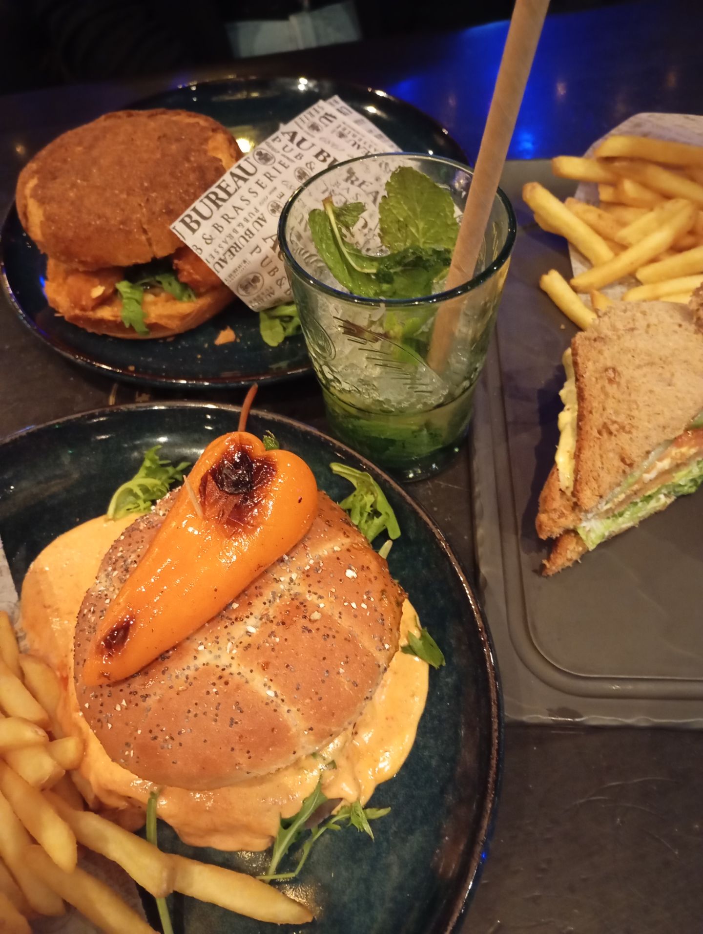 Lieux Agréable , Burgers Original Au Bureau super bon ! , Serveuse ( Murielle ) au petit soin , Merci Pour se moment agréable ! Et une Mention Spécial au BAR pour la découverte des Mojitos Sensations un délice Merci !. Cordialement Bonne continuation !.