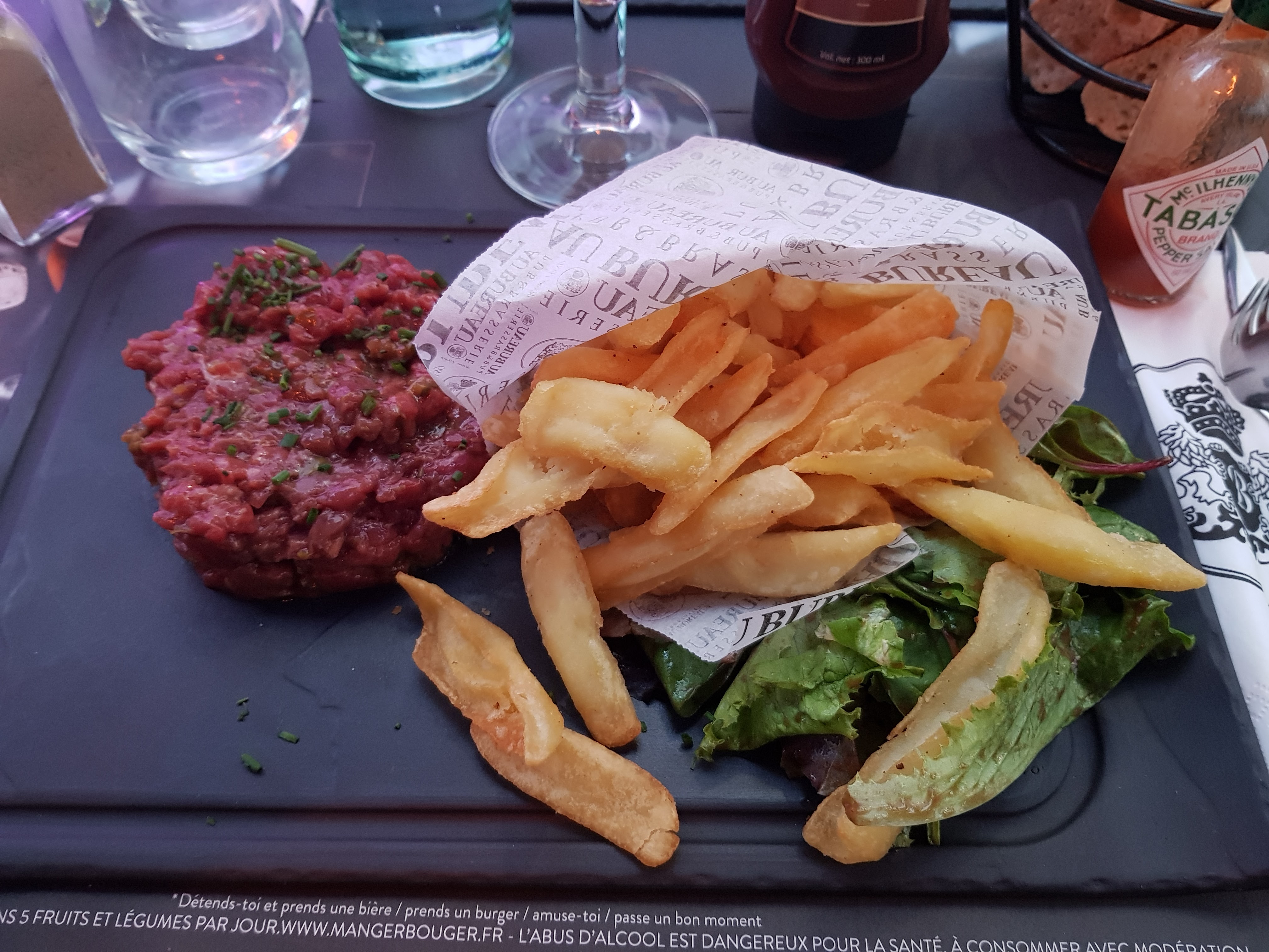 Sans avoir réservé un samedi soir, on a su nous trouver une table tout de suite pour 3 personnes Les serveurs sont agréables et rapide Nous avons tous les 3 pris un tartare de bœuf qui était très bon Merci et à bientôt