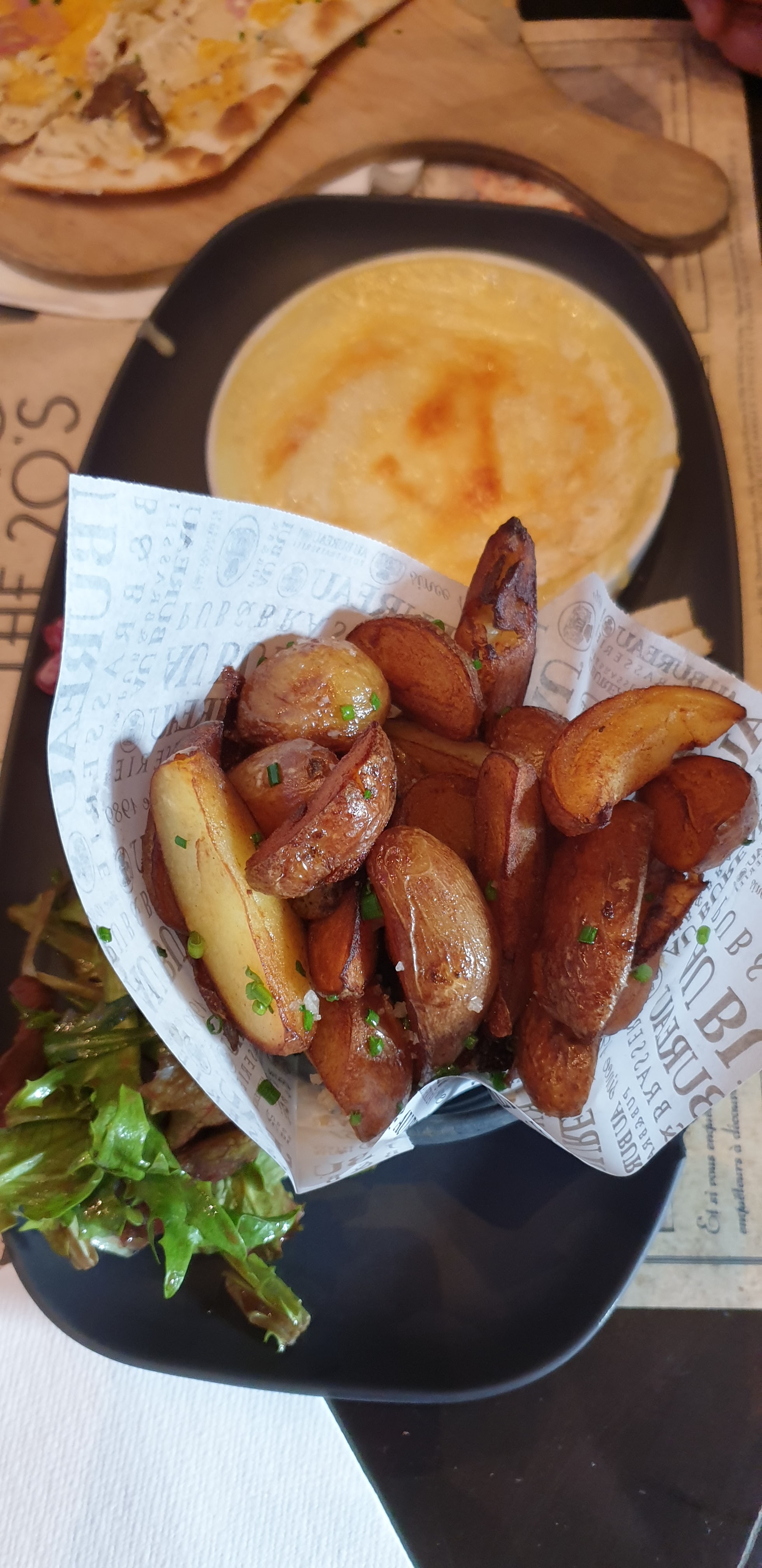 Une soirée désastreuse, rattrapée par une gentille serveuse à l’accent méditerranéen. Plats médiocres ( salade sans chèvre, un plat sans accompagnement, une flam réchauffée et brûlée). L’attente n’en parlons pas, soirée de match et grosse effervescence, nous pouvons à la limite, comprendre. Mais, l’ autre serveuse, désagréable au possible, qui parle mal aux clients, ce n’est pas envisageable ! nous pouvons comprendre qu’elle n’y peut rien concernant les plats, mais nous non plus. Il y a une manière de s’adresser aux clients, notamment dans le commerce et la restauration. Le manager, peu compréhensif au début, a su, quand même faire la part des choses à la fin, ce qui rattrape un peu les écarts de sa collègue.