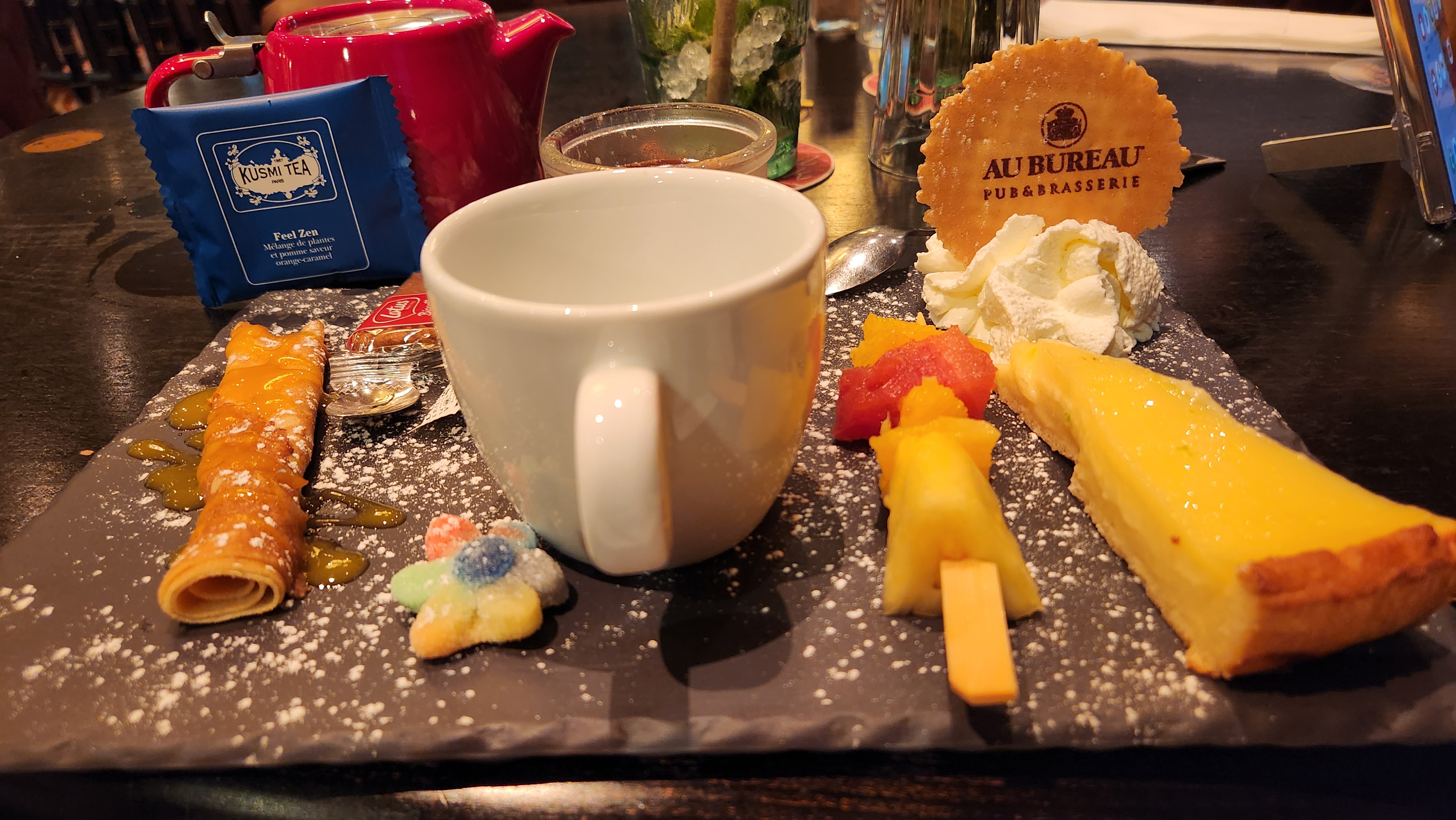 Tout était presque parfait…sauf que nous avions demandé une glace pêche/framboise et que d’autorité on nous a servi mangue/framboise par plus de pêche, sans demander au client si cela lui convenait. J’ai également commandé une infusion gourmande en ayant demandé sa composition, résultat pas de brownie comme annoncé mais un second dessert au fruits rouges, acides et sans goût. J’ai fait part de mes remarques à la caisse en lui montrant la photo du dessert et il m’a dit mais Madame , votre dessert n’était pas complet ! Je vais transmettre aux cuisines.