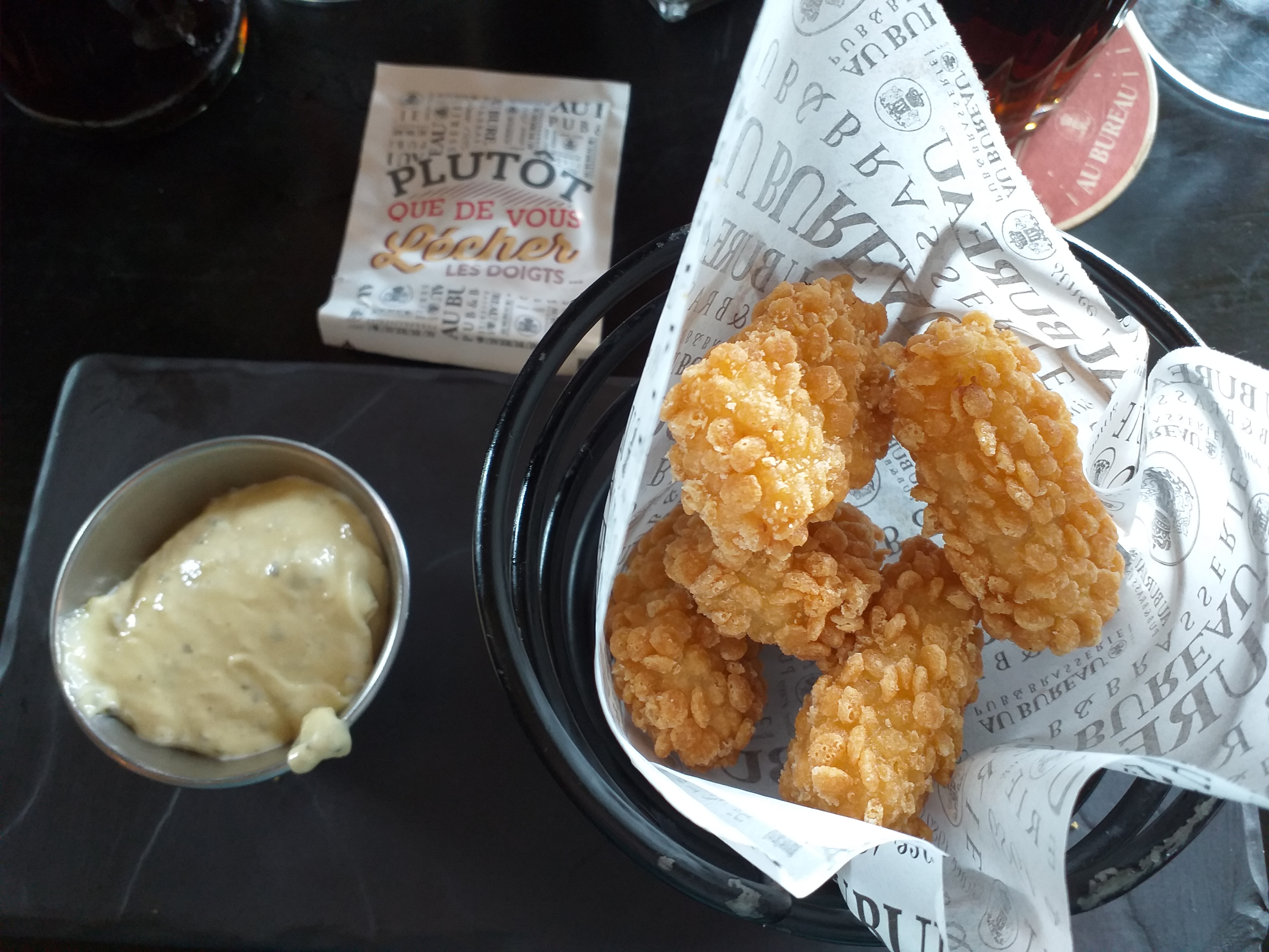 Trois fois « Au bureau » 3 fois déçu. On ne risque pas de s’étouffer avec les fingers food et la planche de charcuterie à partager… mais plutôt avec leur prix. Et la bière, bien qu’elle soit liquide te restera bien en travers de la gorge aussi en dehors de l’happy hour. Le reste de la nourriture n’est pas à mon goût, pas de la cuisine. Beaucoup d’attente, difficile d’avoir l’attention d’un serveur, les pauvres semblent débordés. En revanche la décoration intérieure et l’ambiance, rien à dire, faut reconnaître que c’est bien décoré.