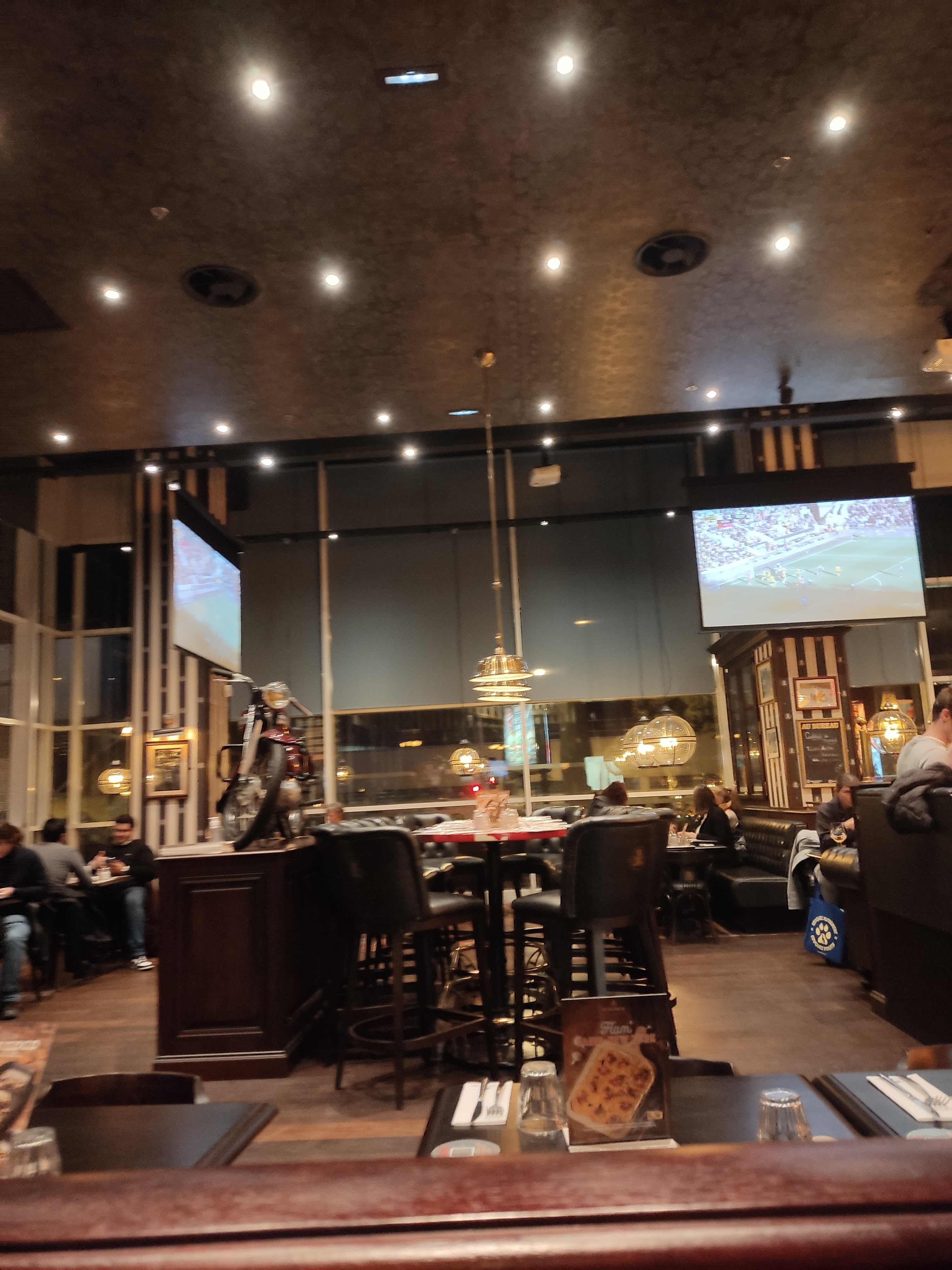Pub sympa! Nous avons bien été accueilli. La déco est sympa. Le service était bon et nous avons réussi à manger en une heure un vendredi soir. Nos plats étaient bon, et correctement servis. Les cuissons étaient respectées. Petit bémol pour les prix. Il n'y a pas de menu (plat+boisson+dessert) de proposé. Tous les plats sont a payer au détail ce qui alourdi l'addition. Pour 2 soda, 2 burgers, 2 desserts, comptez un peu plus de 50 euros. Ce vendredi soir les écrans qui sont disséminés dans toutes la salle fonctionnaient en saccadé. Je n'étais pas là pour regarder la tv mais c'était tout de même déstabilisant.