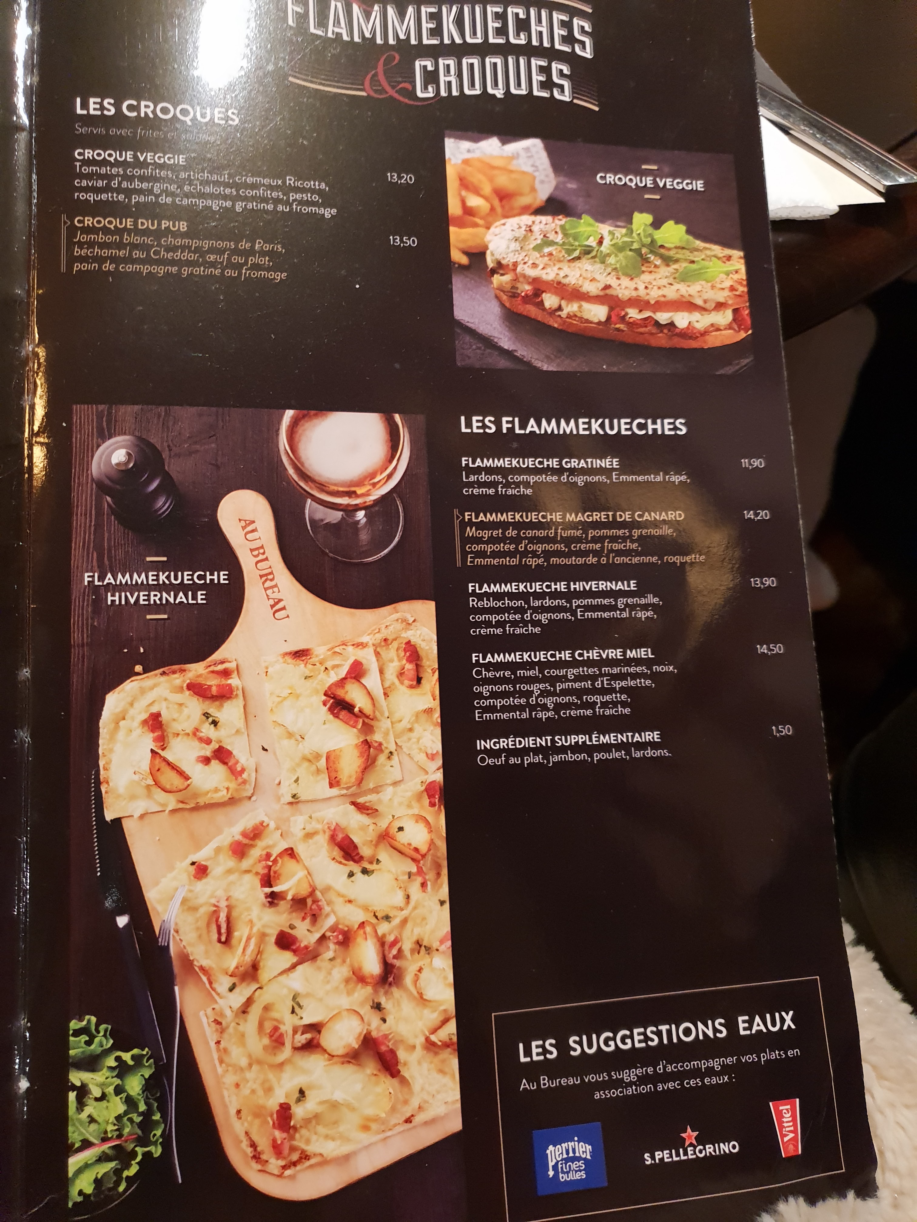 Je ne m'attendais pas à devoir réfléchir avant de commander, car la carte est alléchante et cohérente (ça ne va pas du caviar d'huître naine au kébab), mais alors la planche Camembert Lover (meilleur nom du monde) et la Flam'chèvre, mes cocos, ça vous remplit plus d'une bedaine à la fois. Et ces frites, mon gars, ces frites... Service rapide même à 12h30 un samedi, personnel attentionné et souriant, et le style déco Au bureau, même si j'en veux pas chez moi, ça a son petit cachet. Si vous acceptez de débourser quelques euros de plus (25€/tête plat+dessert avec garantie de papilles joyeuses et estomac rempli), ça en vaut la chandelle. Comme dirait l'ami Julien Lepers, c'est oui!
