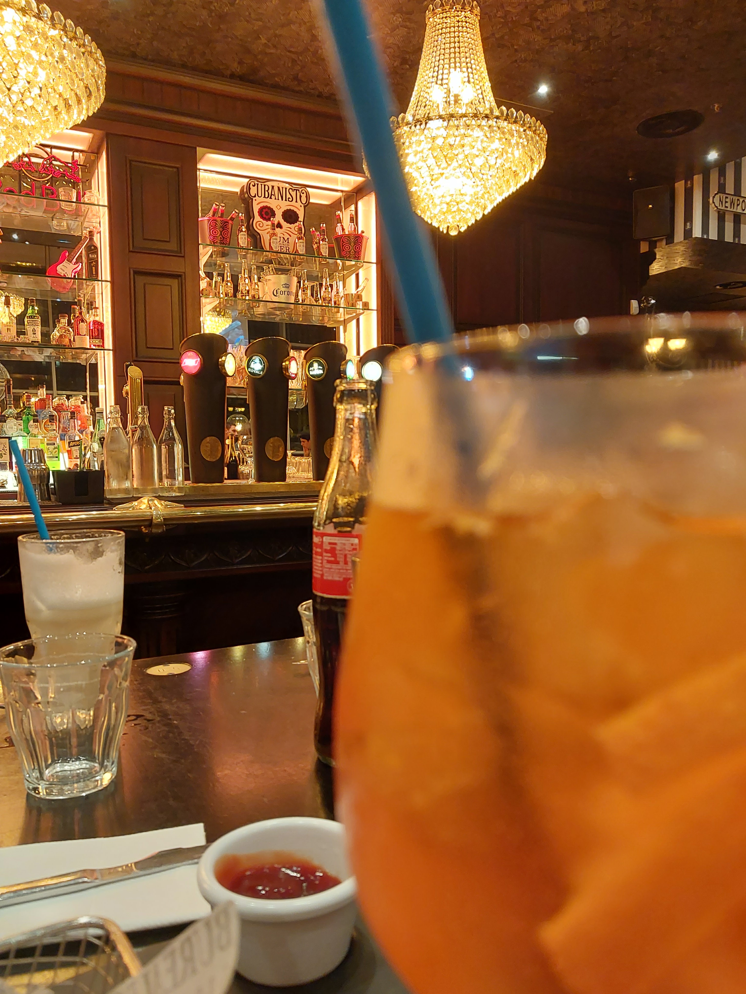 Nous sommes simplement venus prendre un verre, et malgré le prix élevé des consommations, elles étaient appréciables. Nous avons en revanche eu plusieurs serveurs dont une jeune demoiselle souriante, et deux types qui avaient l'air de détester leurs jobs. Les clients n'y sont pour rien les gars, allez en réserve et soufflez.
