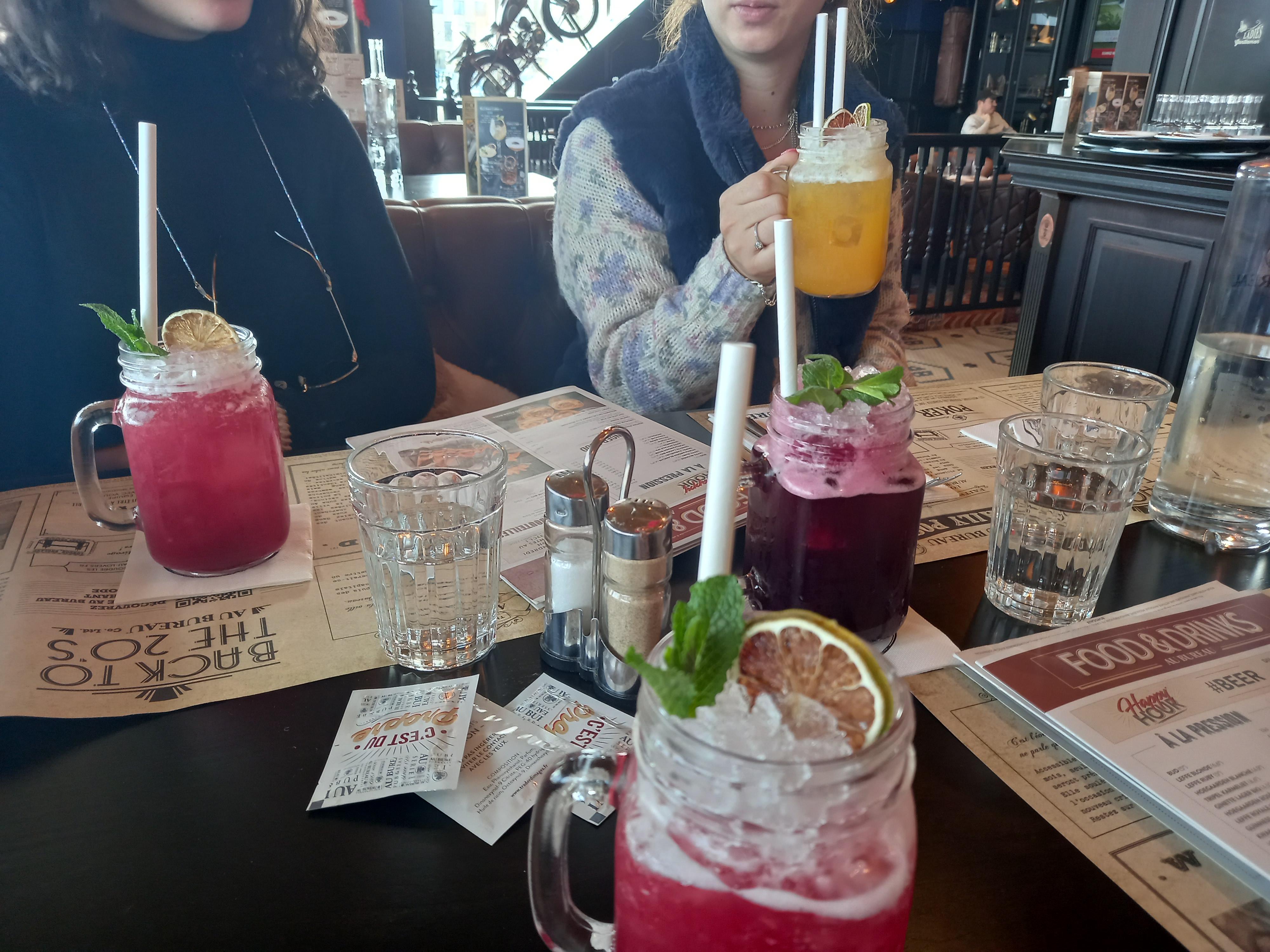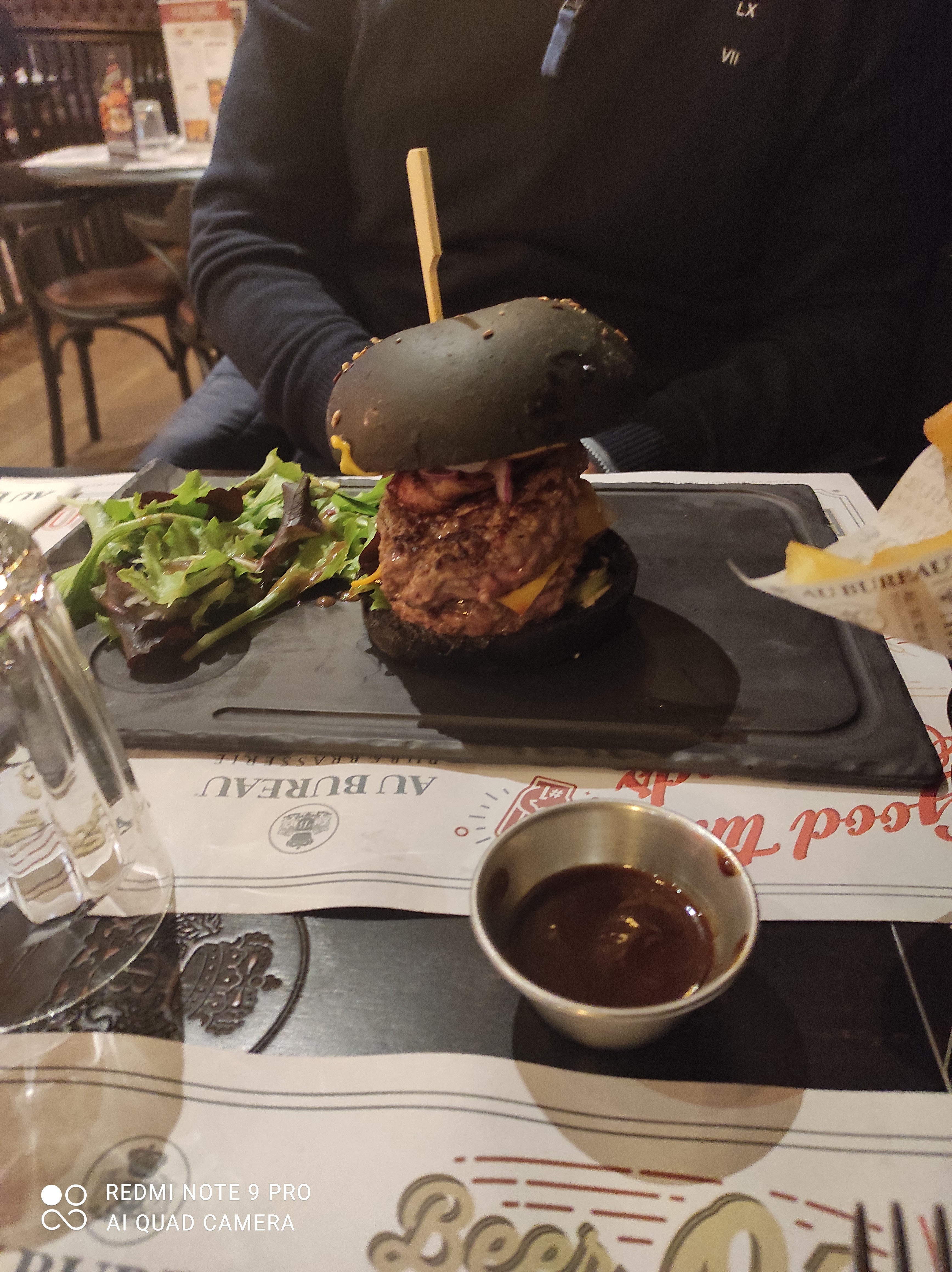 Une bonne ambiance ! Les serveurs étaient très gentils, il semble y avoir une bonne équipe de restauration. Le cadre chaleureux avec des couleurs mâts, le bois les banquettes style chesterfield pour 4 personnes. Des anciennes motos en guise de bon marqueurs visuels identités de cette franchise Au bureau. Bon cadre aux quais et non loin du bassin des lumières. Des espaces divers pour profiter à son envie de la carte ! (Fauteuils, chaises hautes, chaises, banquettes) Mocktails Pink street, Oxford et Purple différents un peu trop sucré pour moi. Sympa