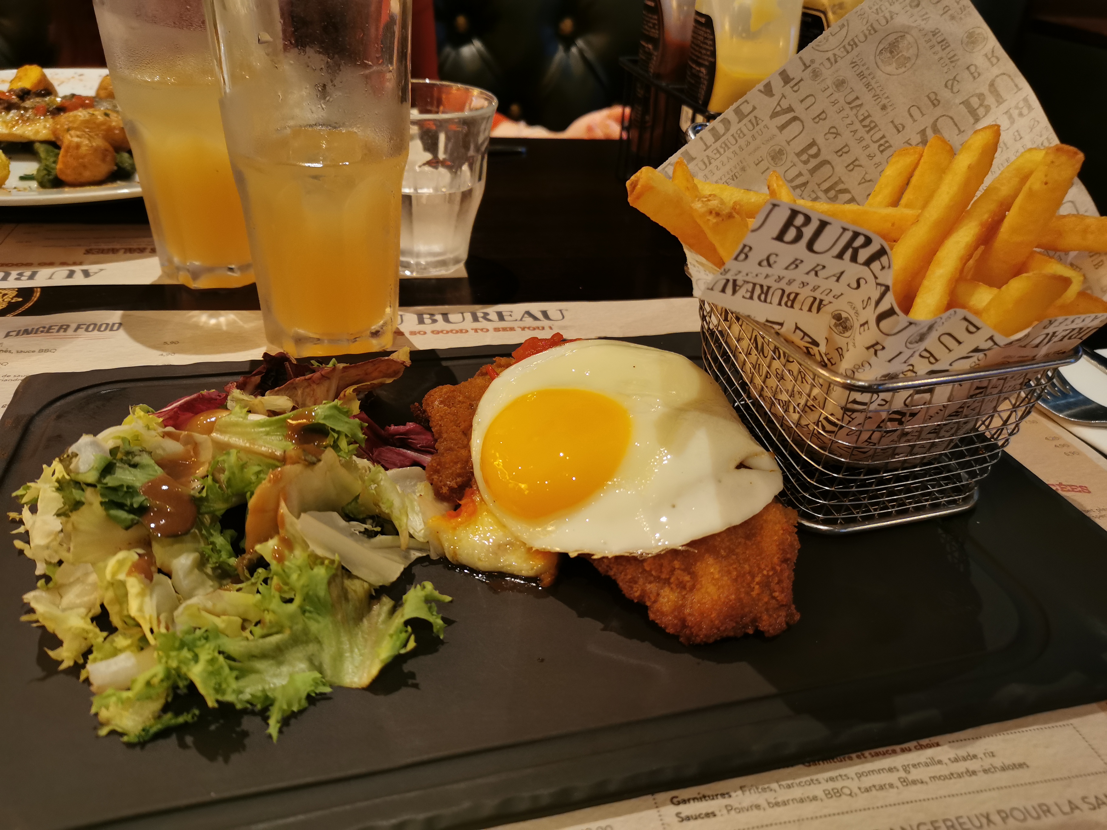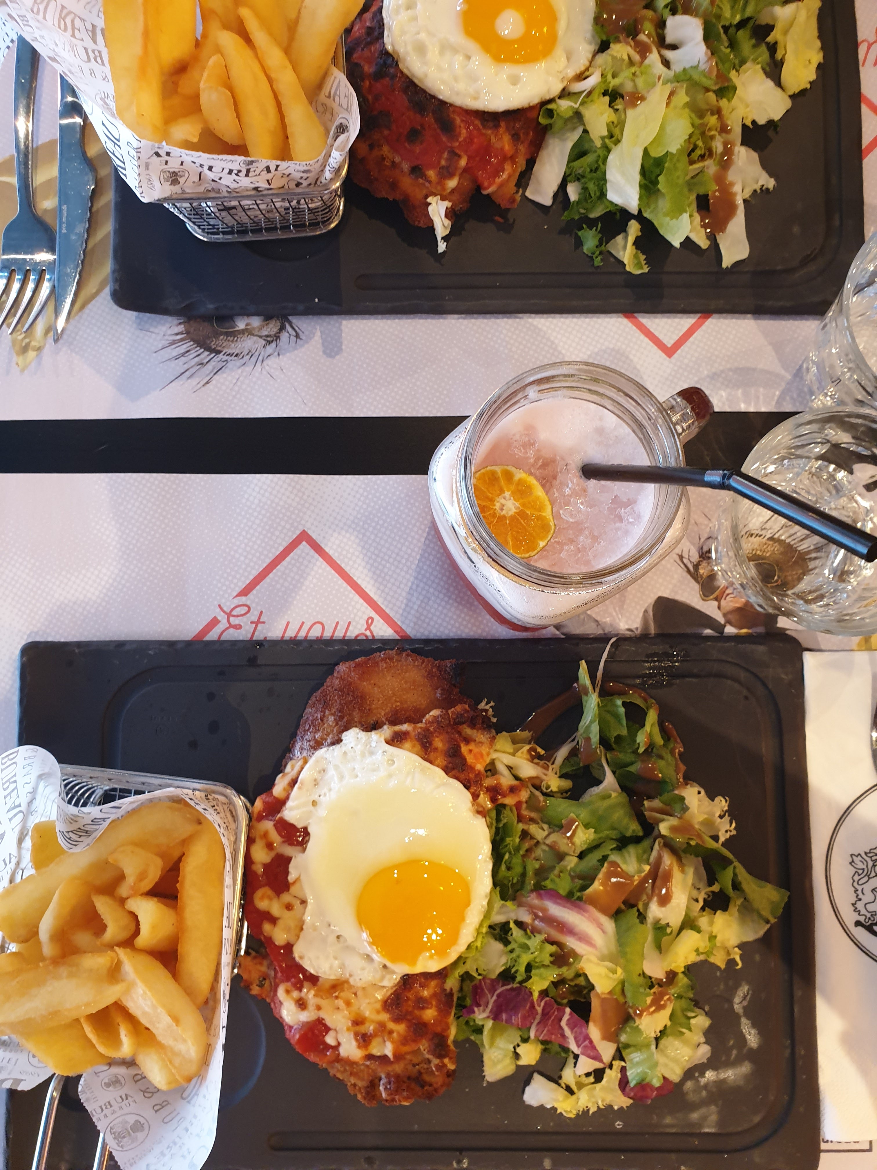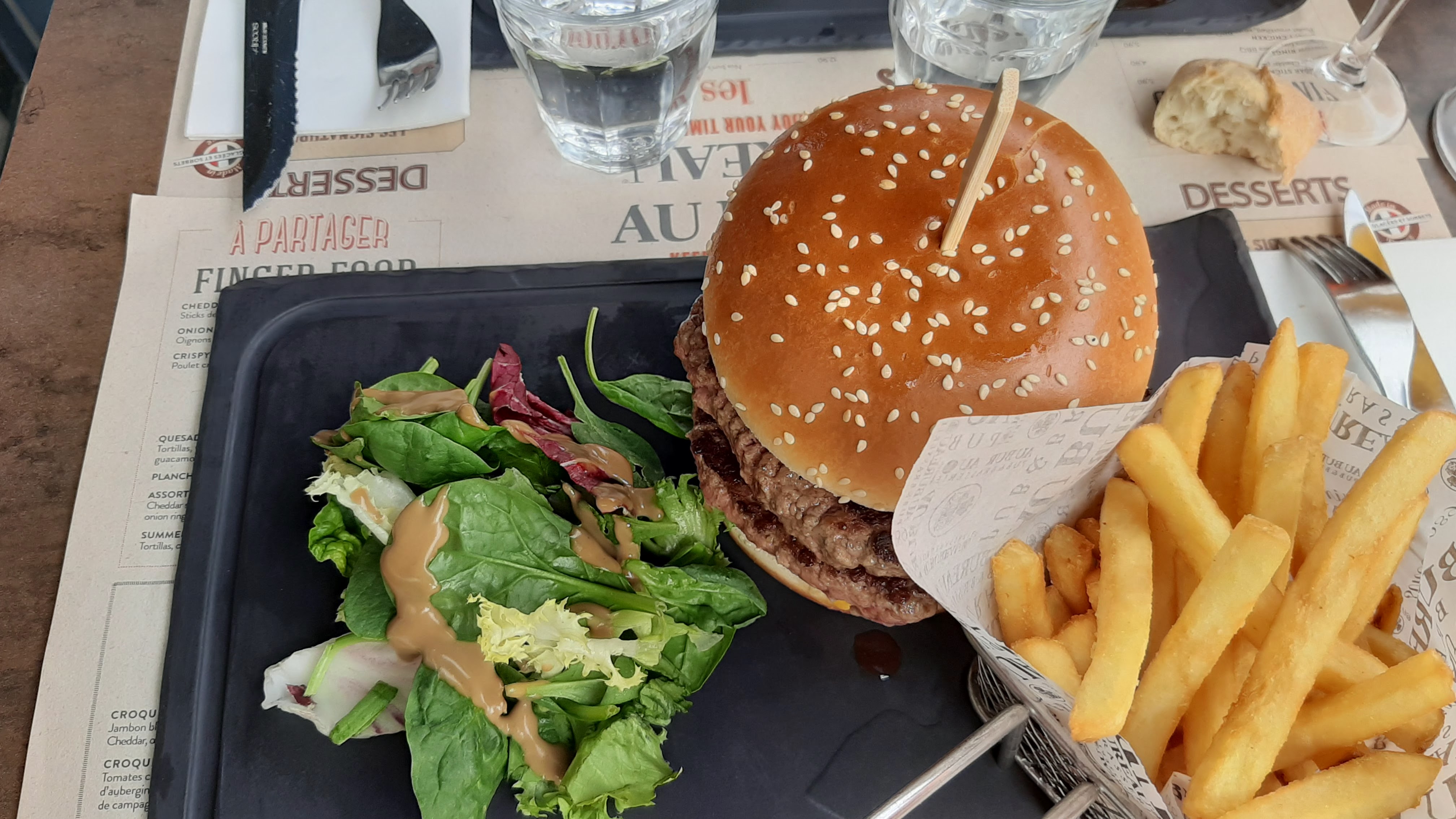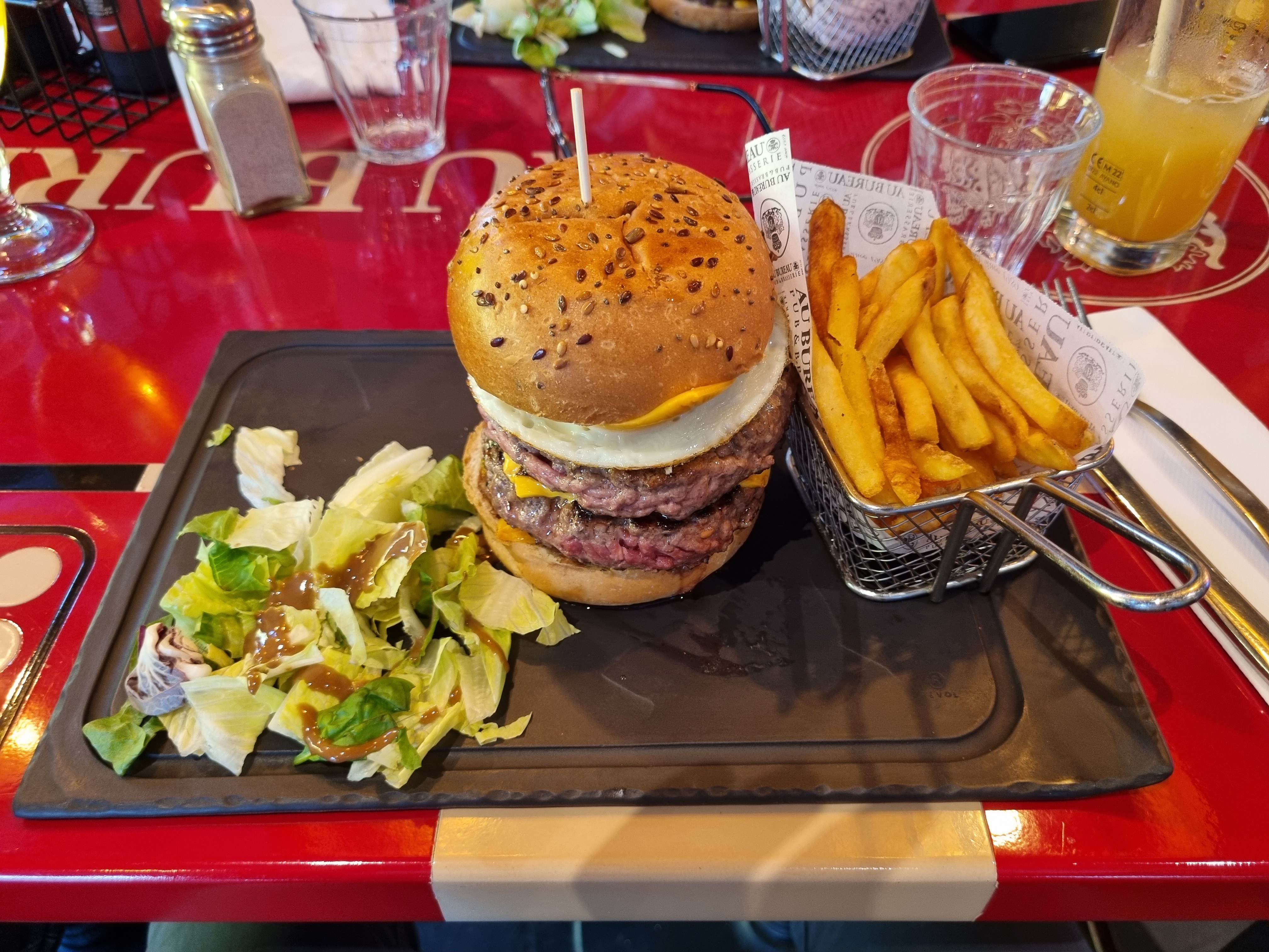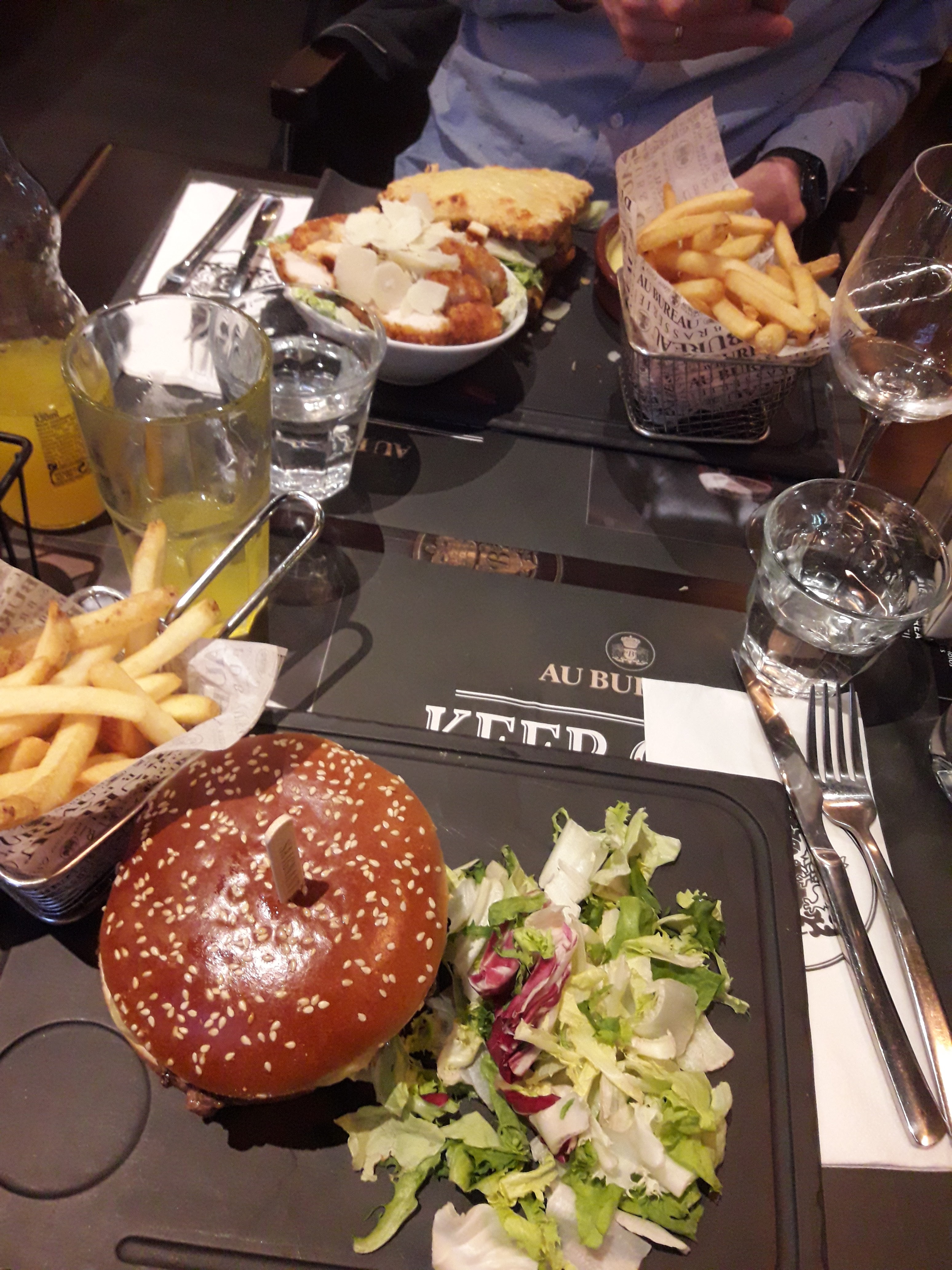 Très bon restaurant. Service impeccable, très bonne adaptation et conseils pour une intolérante au lactose. Service impeccable, serveuse aimable, bonne ambiance et décoration. Serveuse très aimable, salle spacieuse et à l'écart du centre, proximité avec le cinéma IMax. Cuisson parfaite de la viande (entrecôte saignante en photo), frites un tout petit peu trop salé, mais ça dépend beaucoup des goûts de chacun. Poulet juicy, très bonne marinade sans trop de sauce. Œuf à cheval totalement maîtrisé et succulent. Très bons desserts (crêpe au bureau en photo, Nutella, chocolat, crème chantilly et amandes effilées). Deuxième passage, toujours rien à redire, service efficace. Le nouvel Hamburger est tout simplement sublime (Empire State Burger en photo) et la cuisson est respectée. Salle au calme et avec télévision. Troisième passage, à la recherche de la petite bête, sans succès. Service rapide et hamburgers excellents. Pas de réseau en salle mais une vue imprenable. Tl;dr très bonne adresse.