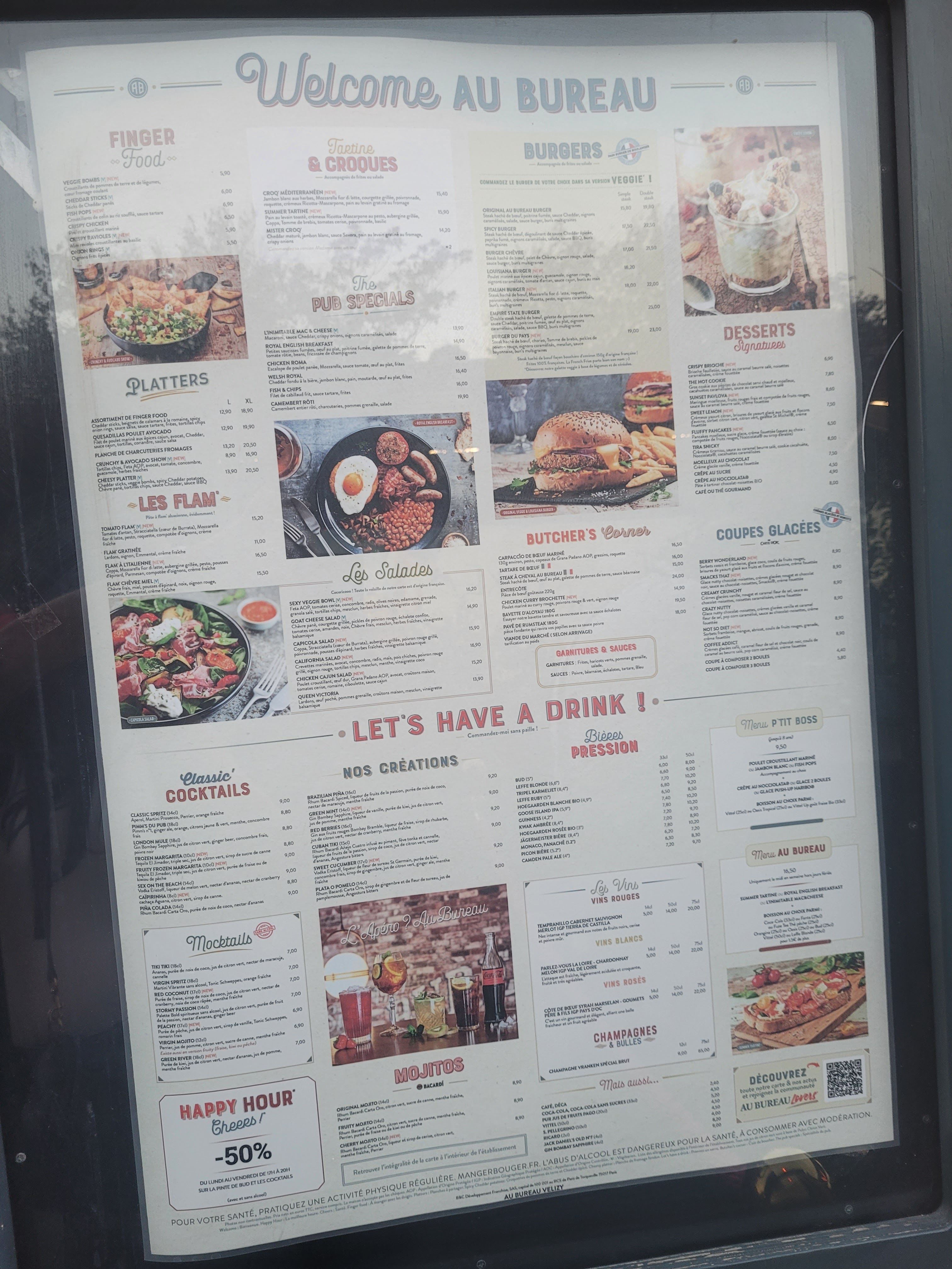 Au bureau c est au bureau ! On est pas depaysé, des burgers, des planches, des glaces et des ecrans avec les match dans une ambiance agréable et plus intimiste, qui permet de sortir du centre