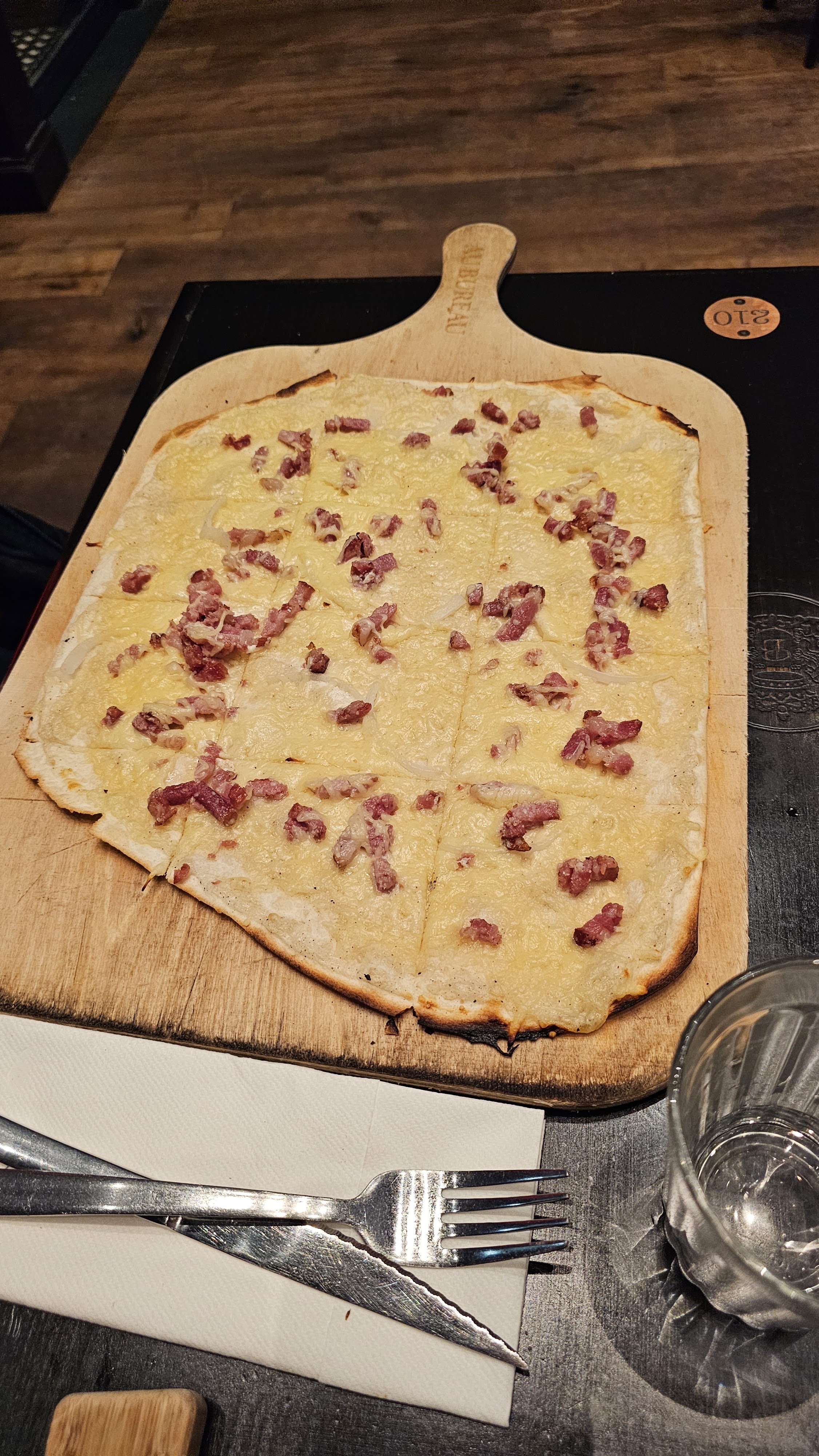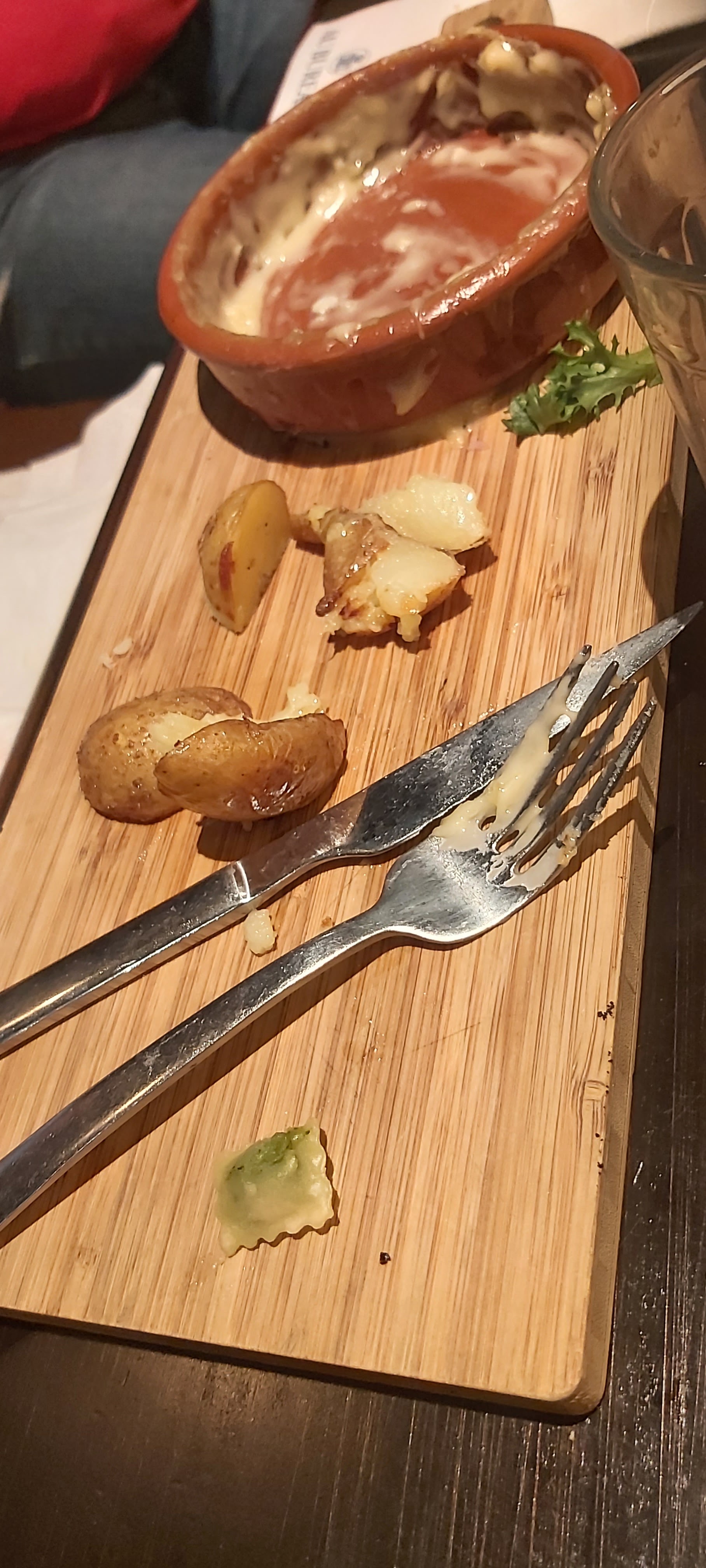 Cadre sympa et personnel agréable. Nous avons attendu 40mn pour être servis, il n'y avait pourtant presque personne. Mon plat (flam old school)est arrivé presque froid(je n'ai eu aucun pb pour qu'il soit réchauffé). Ma femme a pris une smoky fondue party, son fromage était trop cuit, presque solide et les croutons tout petits. On ne pouvait pas piquer dedans parce que les bouts de pain étaient tout durs: la fondue est à éviter. On a arrêté là. C'est dommage, à cause de cette entrée difficile on a laissé le plat principal et le dessert pour une autre adresse. Nous ne pensons par revenir.