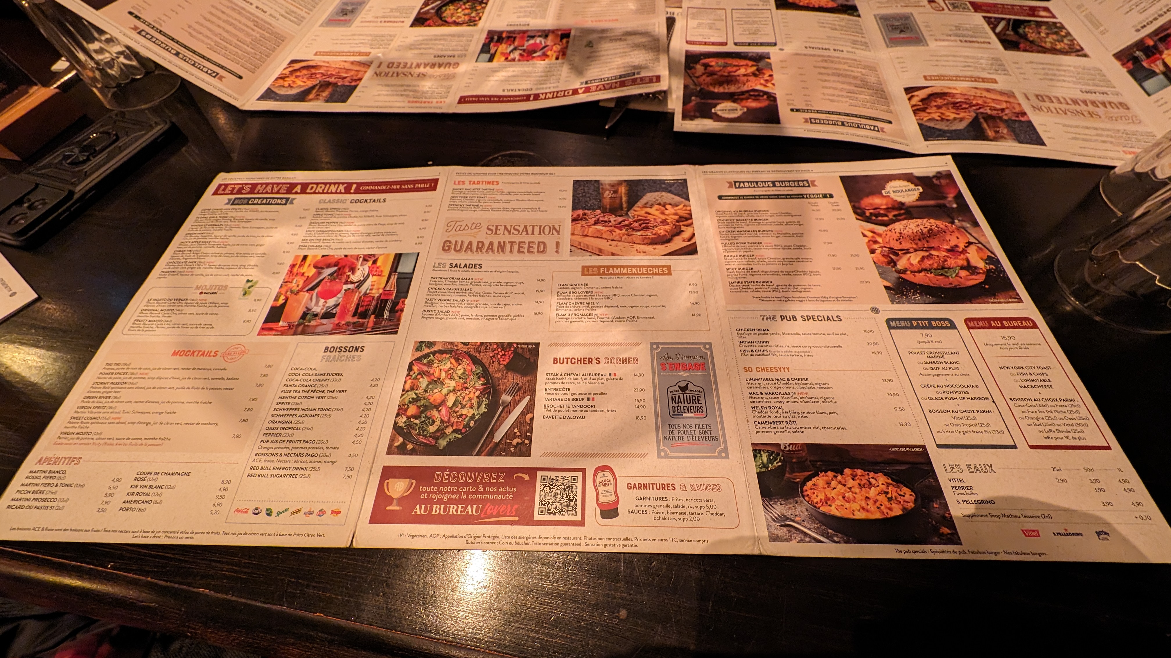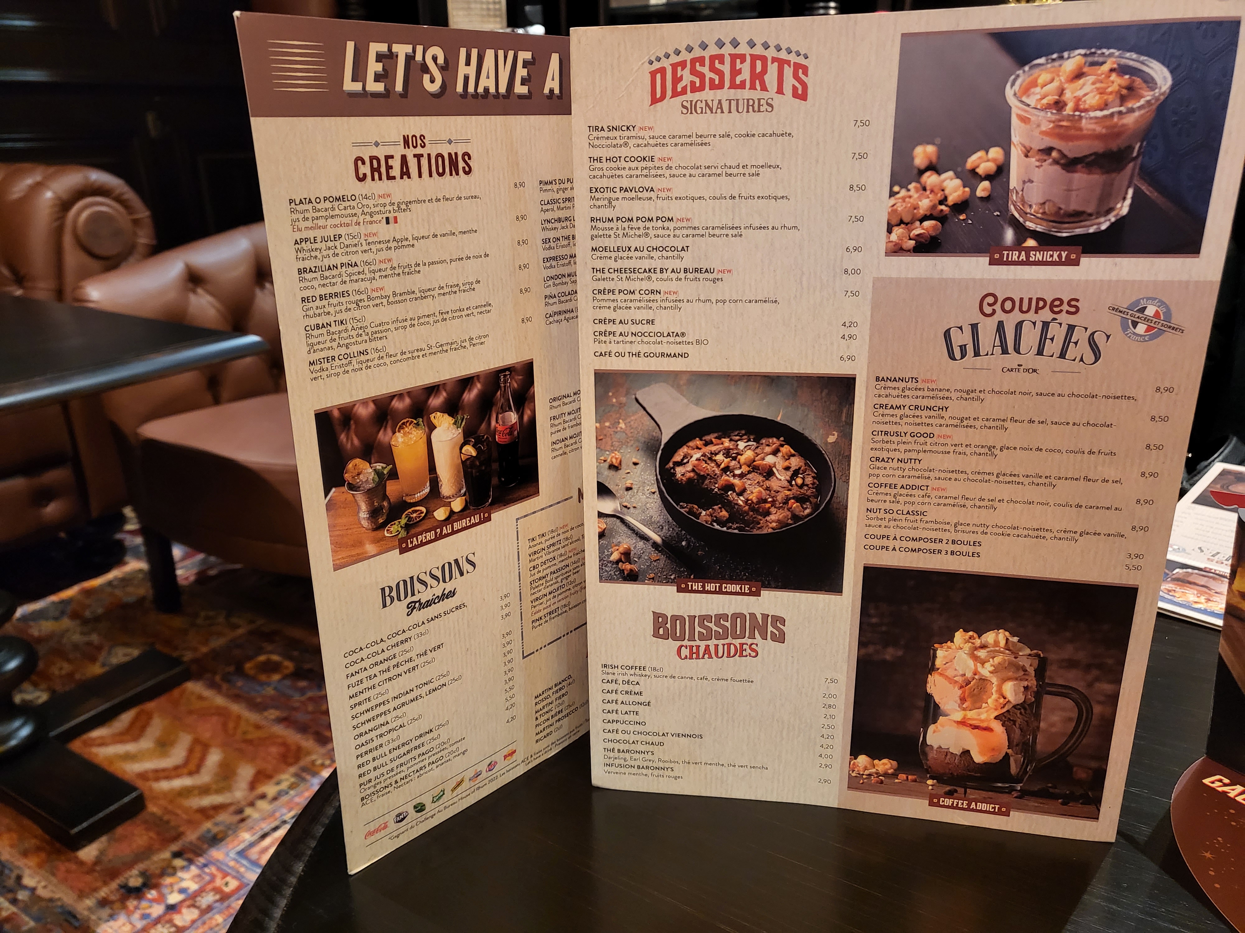 Accueil simple sans plus. Les plats sont bons mais malheureusement pratiquement aucun plat de la carte n'était disponible en début de service du soir à 19h (pas de fish and chips, pas de macaroni, une salade manquante). C'est décevant car obligé de se rabattre sur un troisième ou quatrième choix. Cela ne donne pas envie de revenir. Le temps d'attente est long pour être servi, surtout les desserts, qui ne sont pas bons d'ailleurs.(sorte de tira misu goût snickers insipide, crêpe pop corn pomme sans goût) Cocktails corrects sans plus. Belle déco, environnement très bruyant (difficile pour discuter). Prix dans la moyenne. A tester mais je ne reviendrai pas.