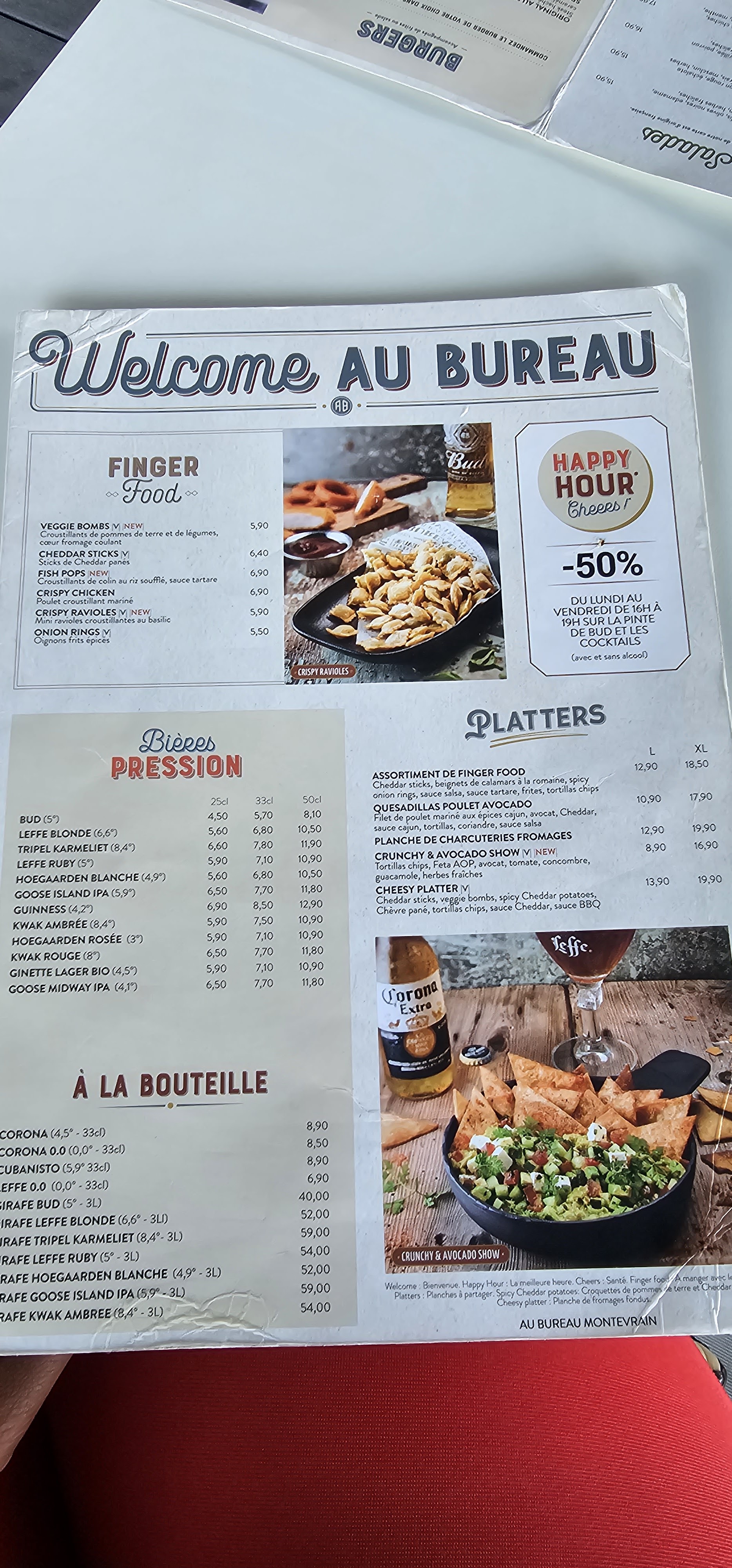 Cela fait plaisir de retrouver une enseigne Au Bureau dans cette zone commerciale. L'endroit est grand, propre, très bien décoré, les assises sont confortables. La carte est variée et il y a toujours des petites choses à découvrir. Le service est rapide et chaleureux. Endroit idéal pour déjeuner, dîner ou tout simplement boire un verre.