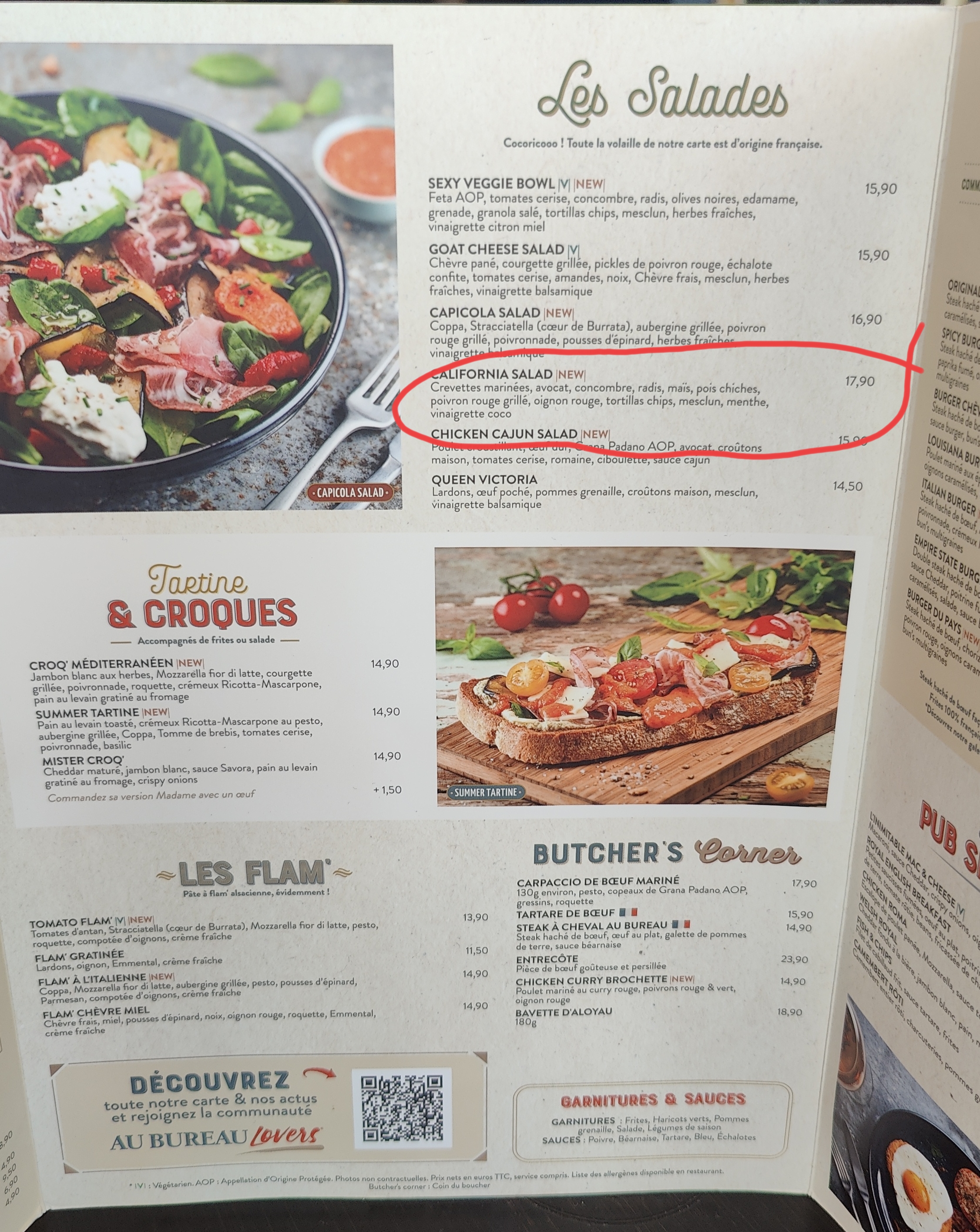 Nous avons déjeuné ce midi. Très bon accueil et cadre sympa. Au niveau culinaire, pour les personnes qui ne mangent pas de viande passez votre chemin, peu de choix. Et en effet, le prix des plats est excessif pour ce que c'est : Une salade California à 17,90€ pour manger : 6 minuscules crevettes, 4 lamelles d'avocat, 5 tortillas une dizaine de pois chiches et de grains de maïs, une rondelle de concombre ciselée, (le but : retrouver les miettes de concombre dans la verdure ?) saupoudrée de 5g de poivron Le tout sur un grand lit de mesclun. Pas de saveur. Pour le même prix, en bord de mer la semaine dernière, j'ai mangé une superbe salade d'une qualité incomparable. Franchement honteux.