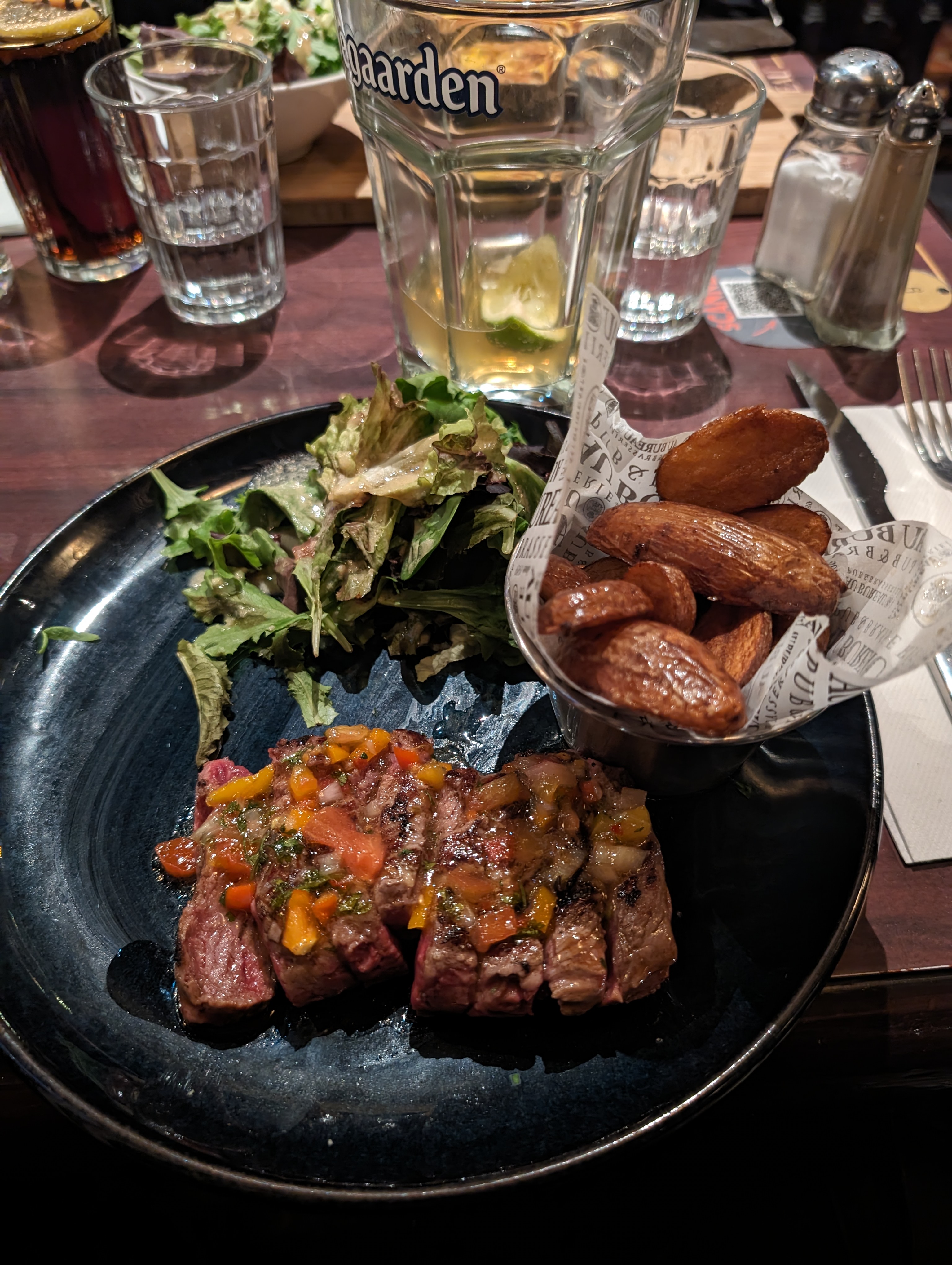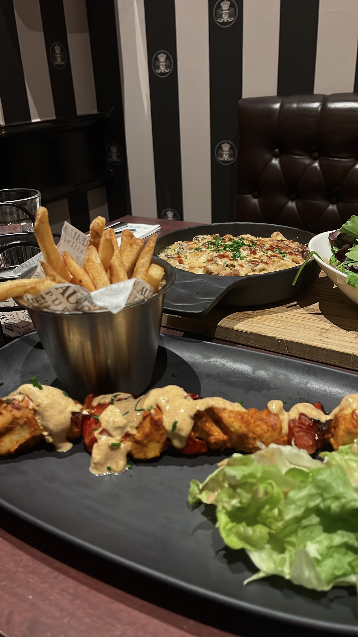 Ambiance sympa, serveurs aux petits soins (monsieur brun à la queue de cheval 👍) merci pour sa suggestion de cocktail. Plats dans l'ensemble correct, salade un peu fatiguée. Mr le responsable soyez plus relax et serein, vous avez une équipe de serveurs au top.