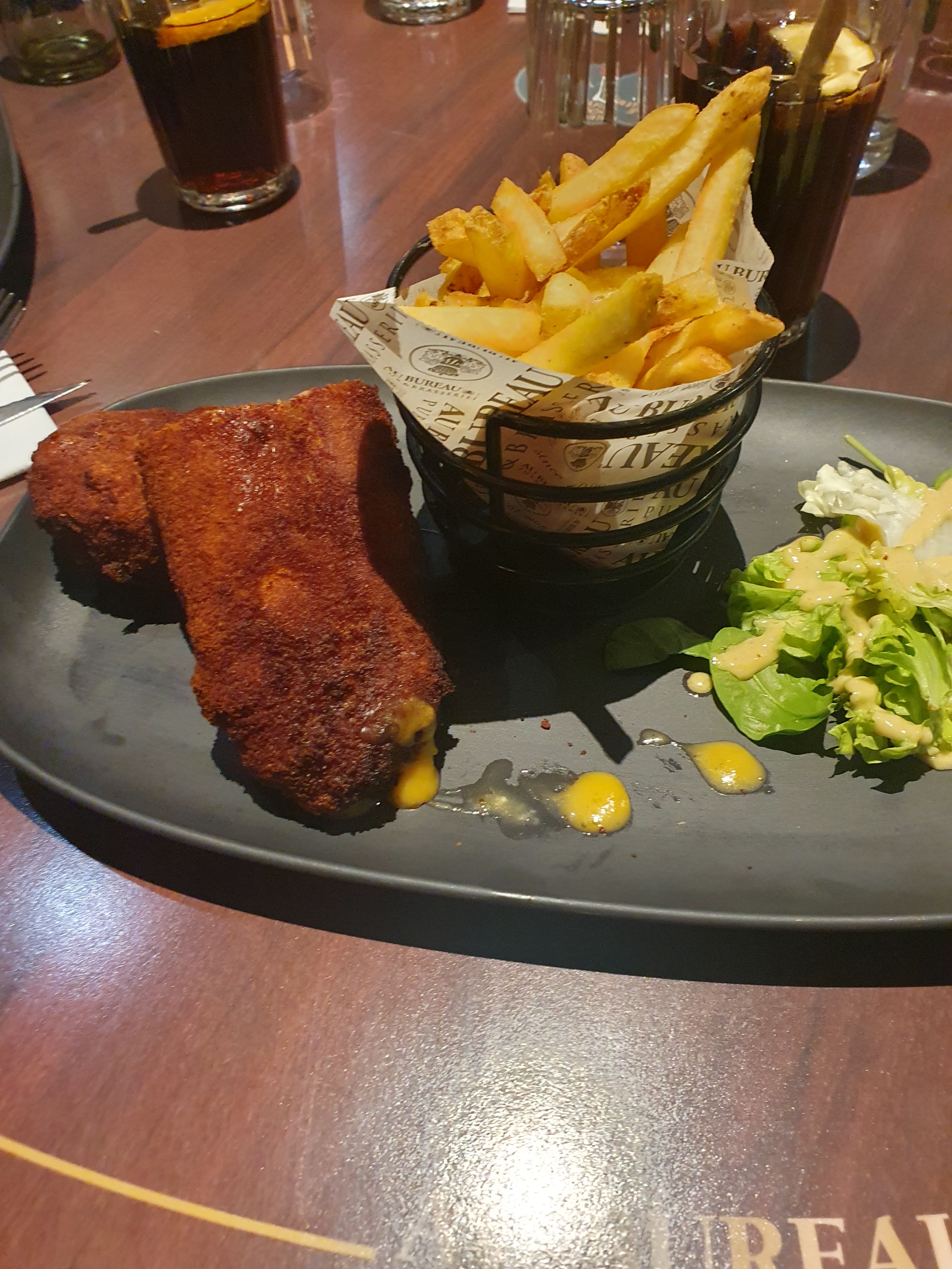 Première fois que nous mangeons Au bureau et nous sommes ravis ! Le restaurant est juste à côté du cinéma c’est idéal. Merci à la serveuse Marie très agréable qui s’est occupé de nous. Je recommande ++