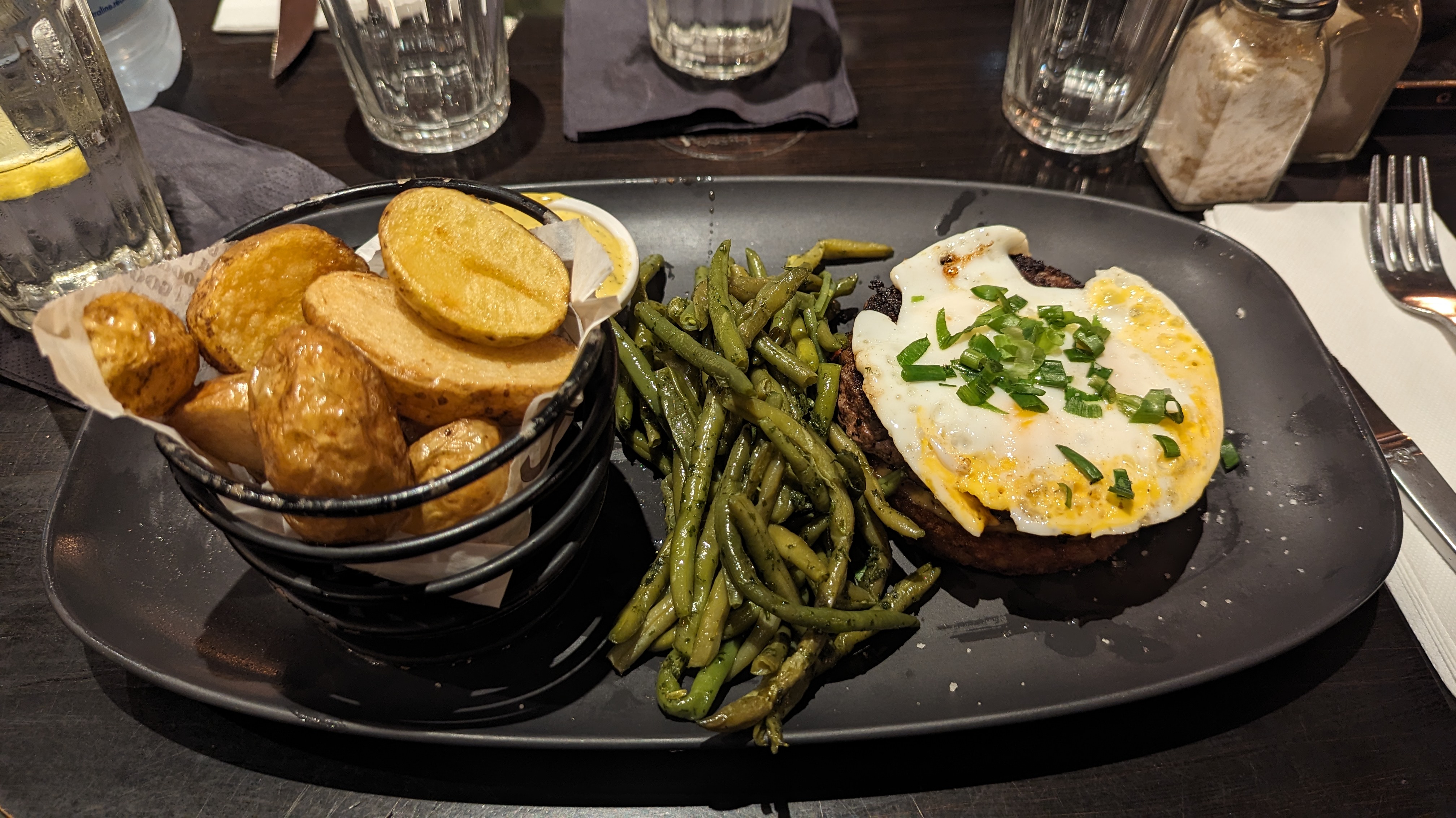 Vous commandez un steack à cheval avec des frites et une salade. Ils vous servent cela sur une planche à découper minuscule qui n'est pas du tout adaptée. Ensuite une fois votre repas terminé, les serveurs passent et repassent à côté de votre table en faisant bien attention à ne pas vous regarder (c'est tout un art) et vous devez quasiment mendier pour avoir un café. Bref, pas terrible. Et je ne parle pas de la musique à fond...