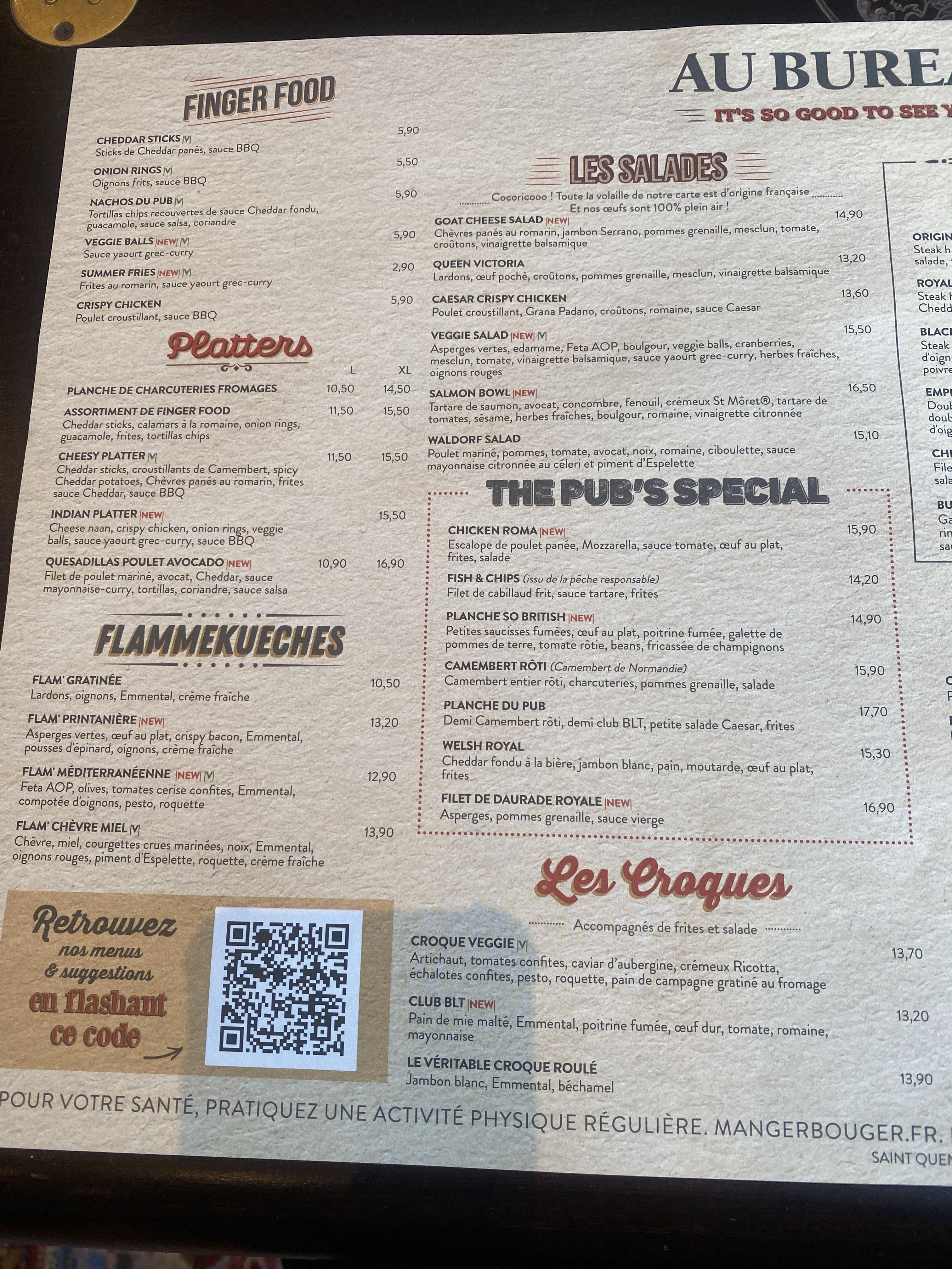Fidèle à l'ambiance de la chaîne Au Bureau. Accueil agréable, service rapide. Les salades sont excellentes mais mériteraient un peu plus de sauce car beaucoup de salade verte. Le thé gourmand est décevant du fait des desserts simples et fades. Une attention est aussi à apporter au verre même si remplacé rapidement.
