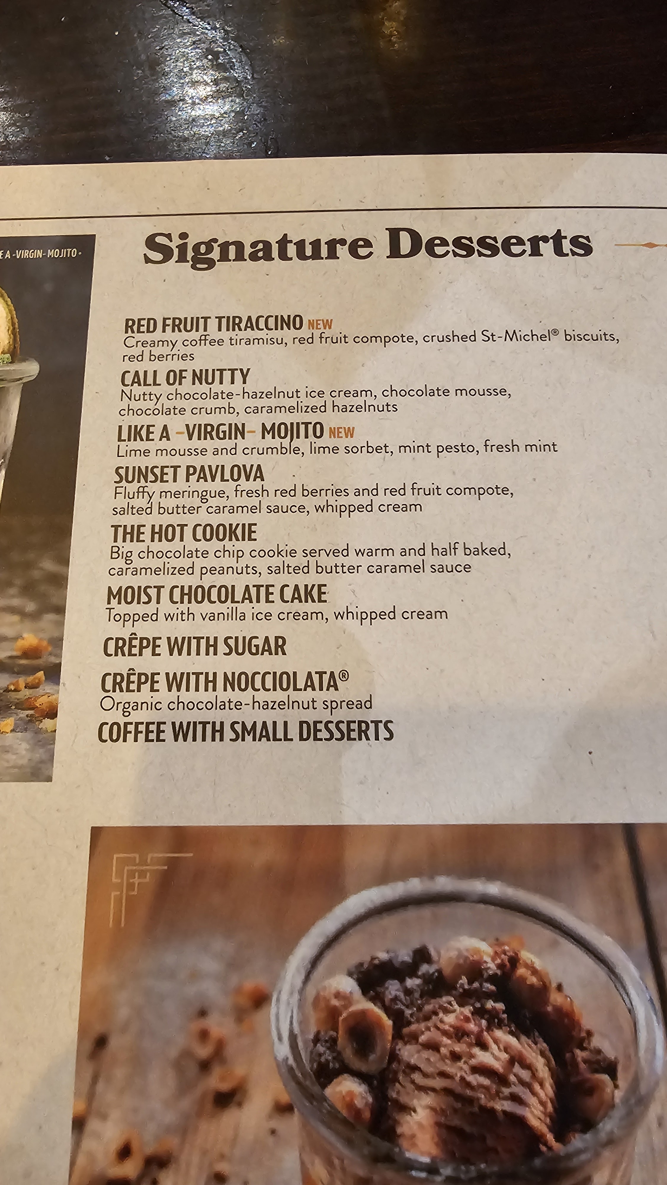 Tout était parfait sauf le café gourmand vraiment pas top, la gauffre bof, le gâteau très moyen et la crème ou mousse infâme, on a l'impression de manger de la mousse a raser Gillette 😕🫣