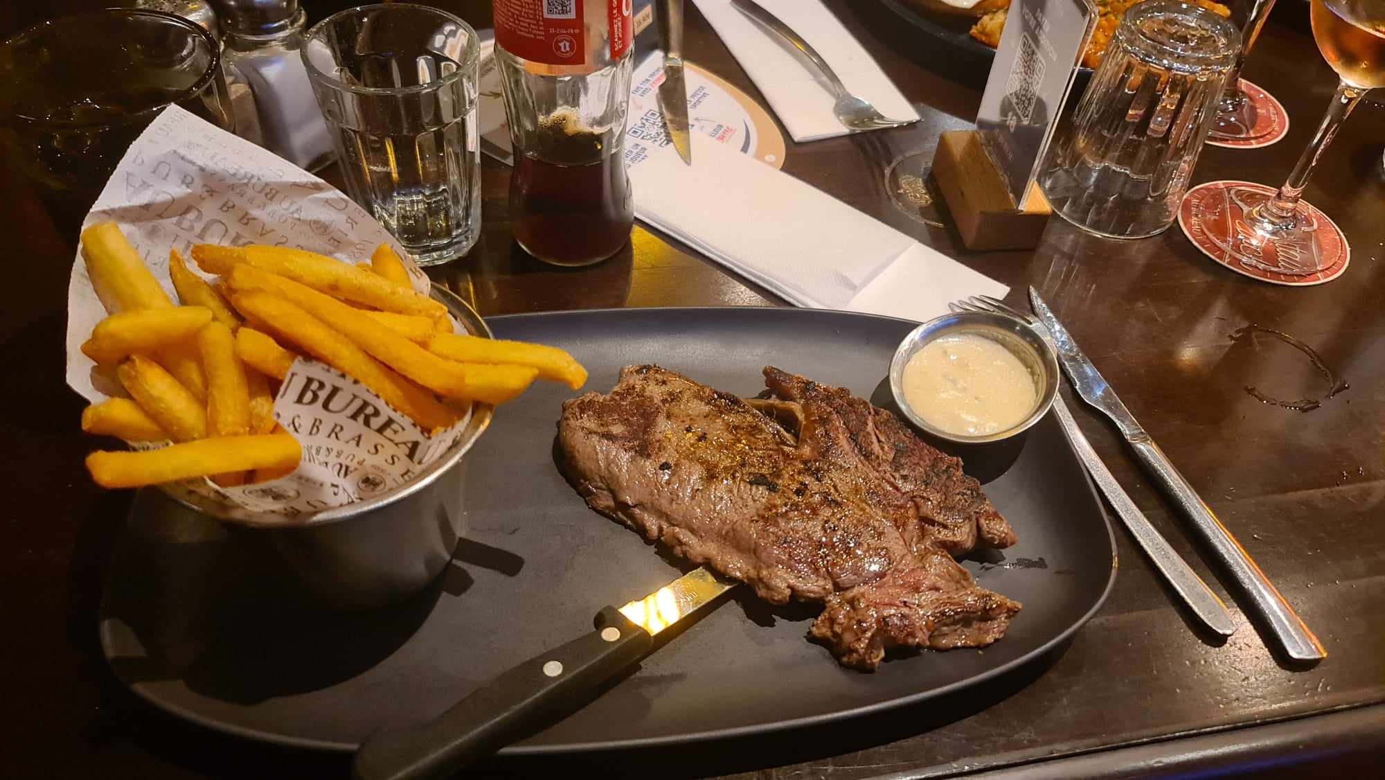 A. Belle pièce d'Entrecôte avec frites croustillantes et salade fraîche. Cœur, que veux-tu de plus ?
