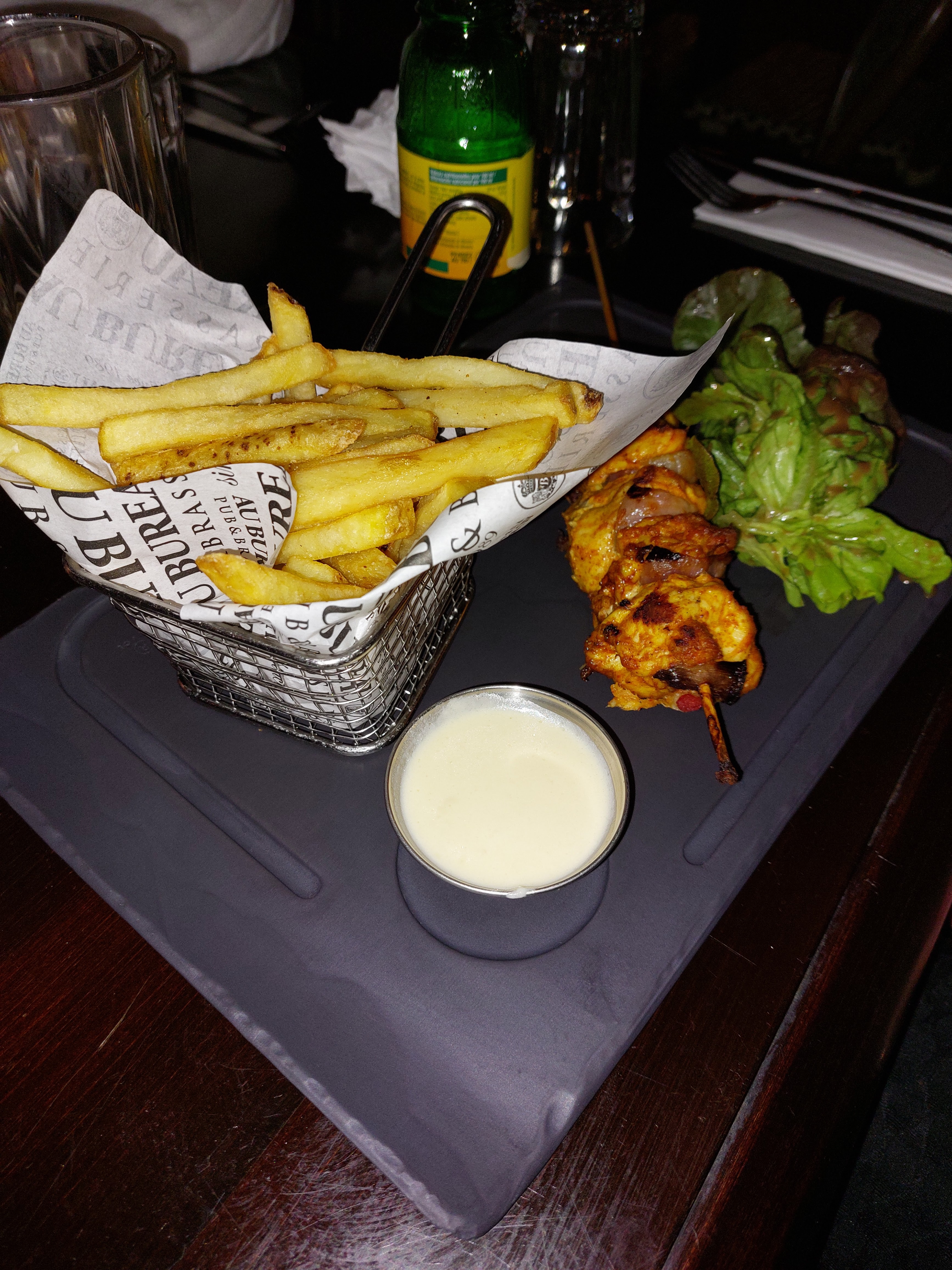Lieu très bruyant ! Service sans plus La cuisine .... 16euros pour une brochette avec 3 morceaux de poulet et une barquette de frite .... honteux La réponse à savoir si c'est quantité est normale est : c'est les portions ..... ah d'accord..... Même un prisonnier a droit à plus et pour moins chère 🤣 avec supplément salade que je n'ai pas eu au passage Évidemment aucun geste commercial ... Je leur donne le mien de geste du coup A fuir.