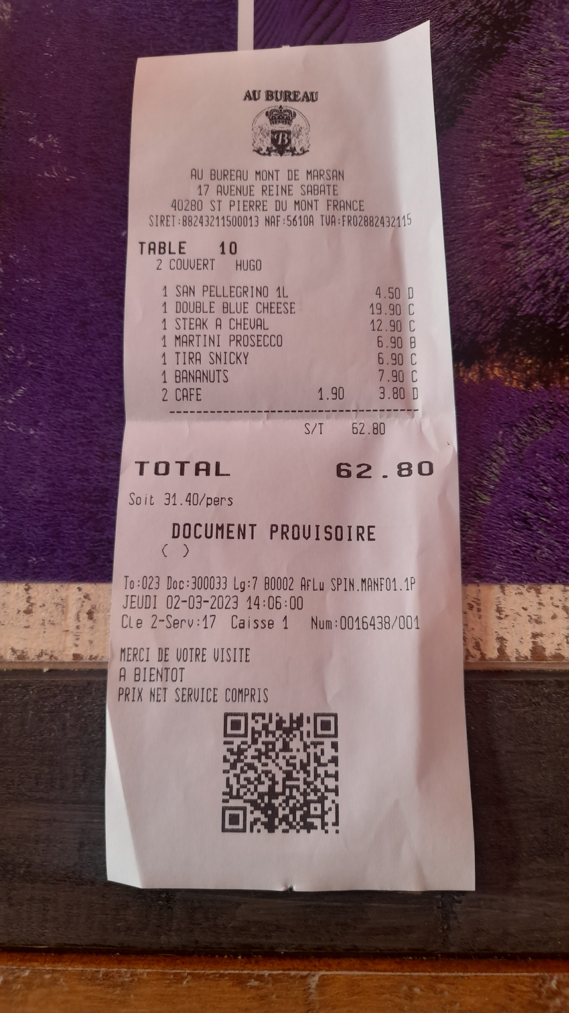 Le Au Bureau de Mont-de-Marsan est un endroit incontournable ! Que ce soit pour un repas, une pause café ou une soirée, la bonne cuisine et la bonne ambiance dans un cadre agréable sauront vous satisfaire à chaque fois ! Merci à Marvin, ainsi qu'aux serveurs Noah et Martin Je reviendrai aussi souvent que possible !