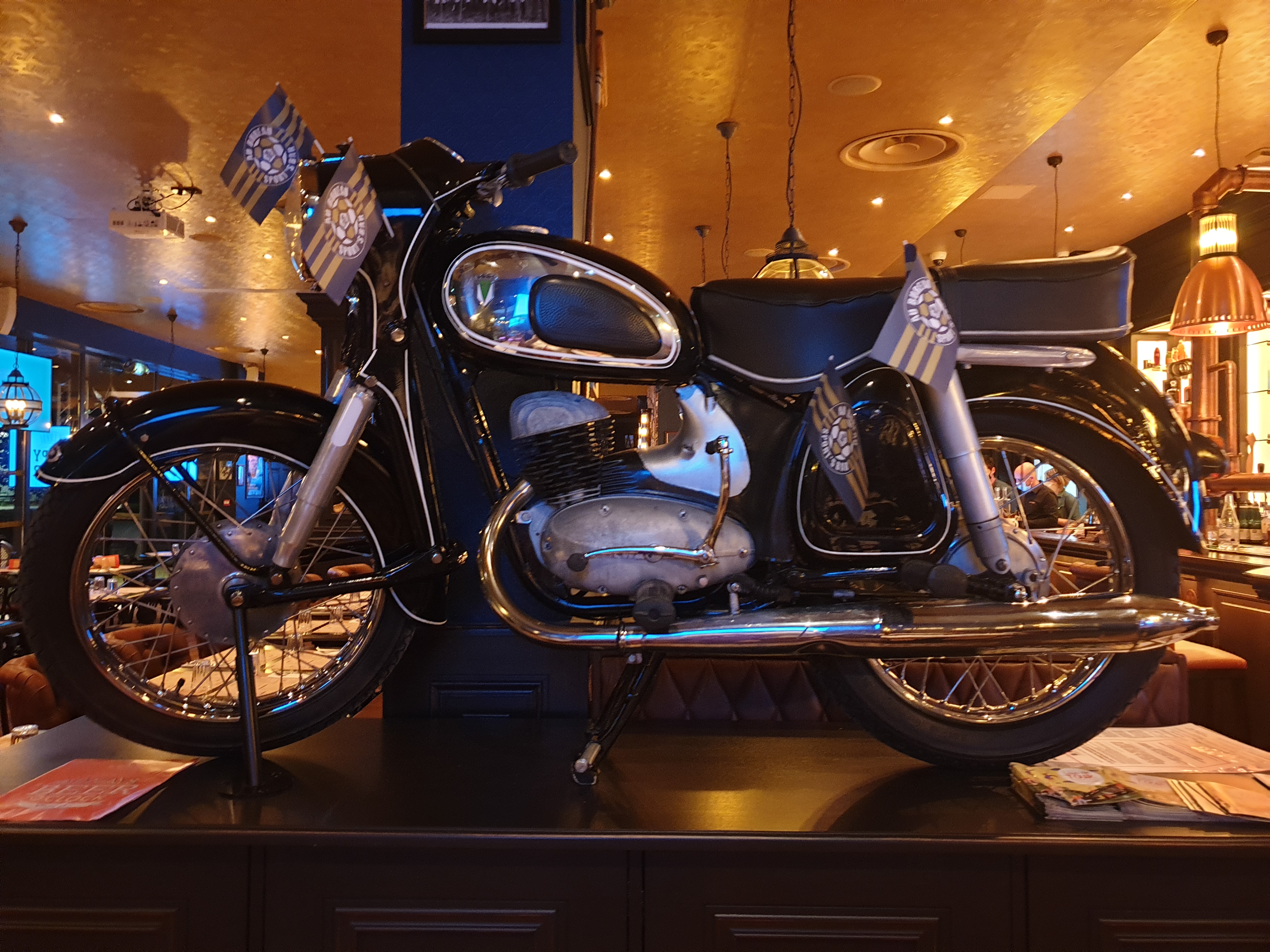 Au bureau. Bonne table, bon service et agencement super. J'adore cette décoration english. Il y a un bateau au plafond avec des avirons bleus et 2 bandes blanches. Pour ma gouverne quel Club ? Très bon moment.